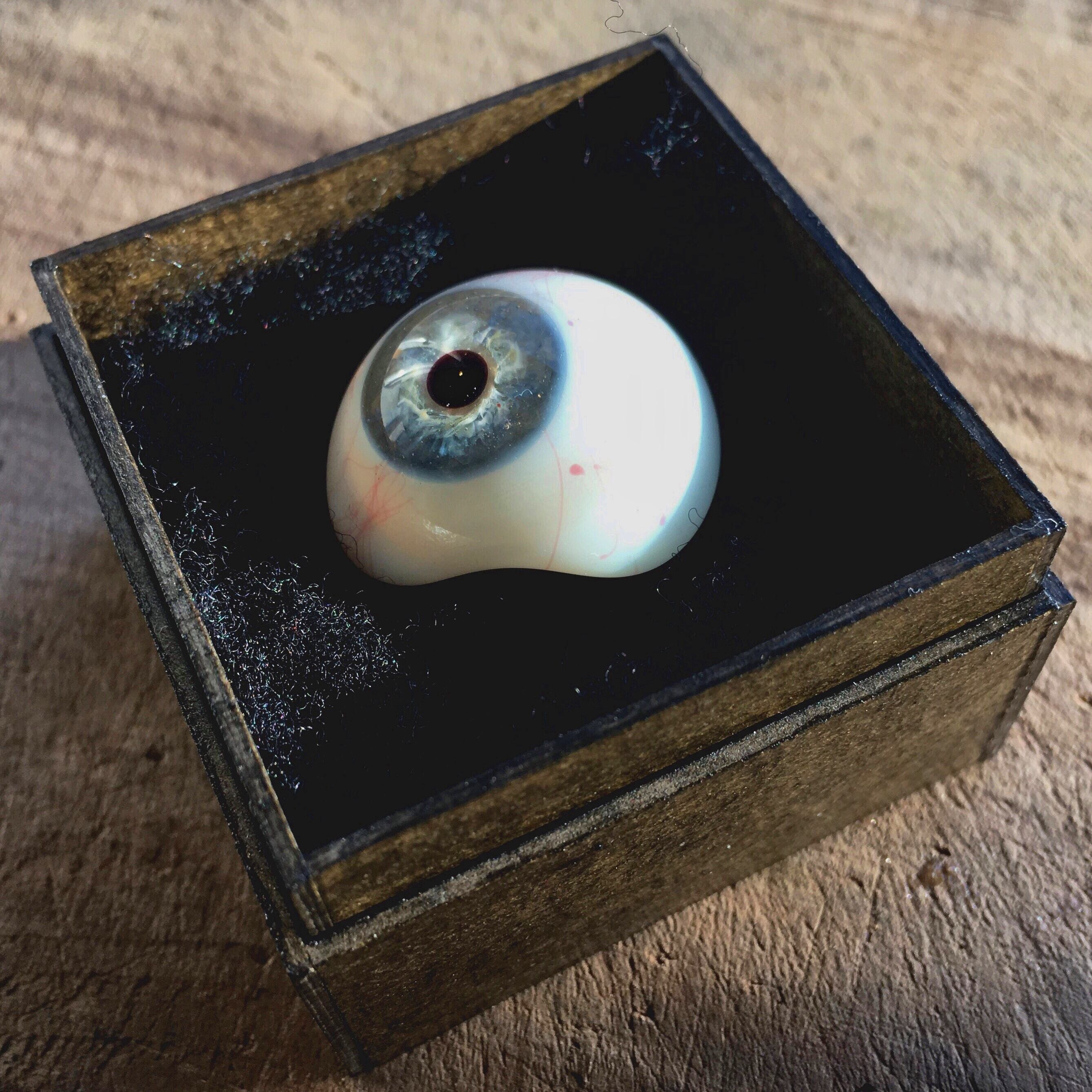 ドイツ、ラウシャの義眼で、製作は1890年頃。ラウシャは現在もガラス工芸の村として有名ですが、100年ほど前に作られたガラスの義眼は、透明感、虹彩の細工など、本当に素晴らしいものです。弊店のオリジナルデザイン、箱作家さんによる手作りの専用箱に入れてお届けします。箱の内寸は一辺約4センチですので、サイズの目安にしてください。
