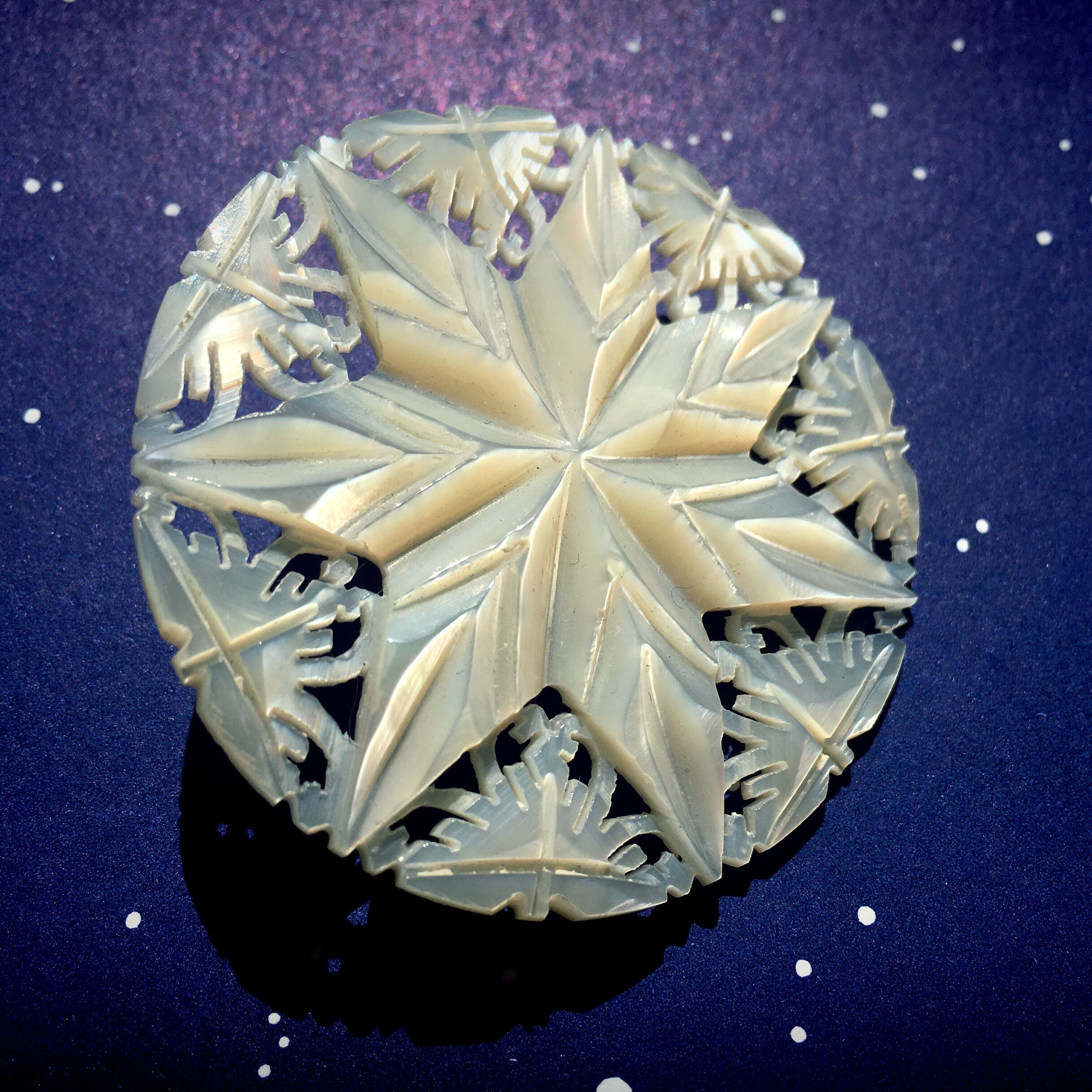 ベツレヘム製の真珠貝を手彫りしたブローチです。真珠貝特有のしっとりした輝きがあり、繊細で清楚な雰囲気です。実に細かいレース状の作りで、これを手彫りで作る技術は素晴らしいですね。