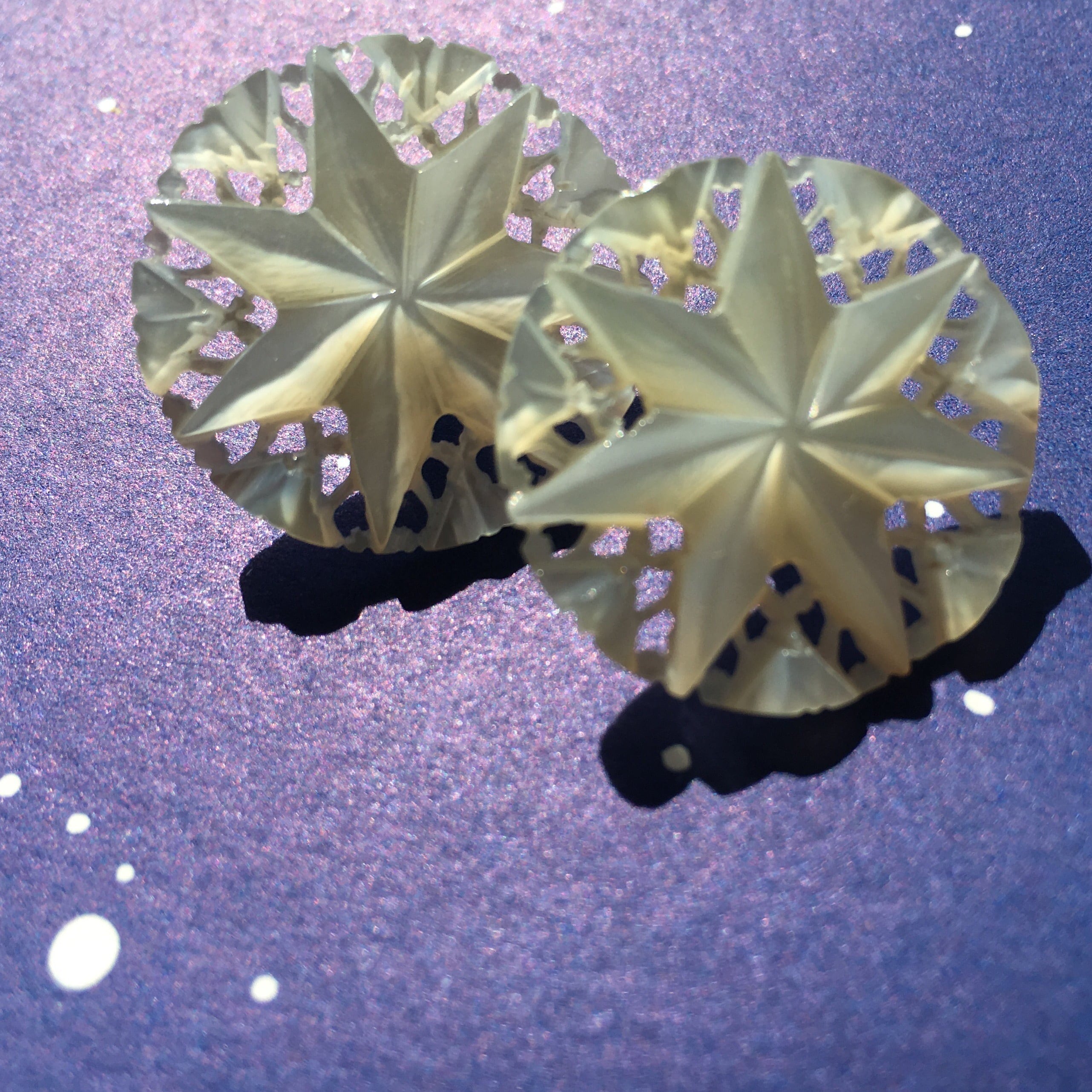 ベツレヘム製の真珠貝を手彫りしたピアスです。真珠貝特有のしっとりした輝きがあり、繊細で清楚な雰囲気です。実に細かいレース状の作りで、これを手彫りで作る技術は素晴らしいですね。