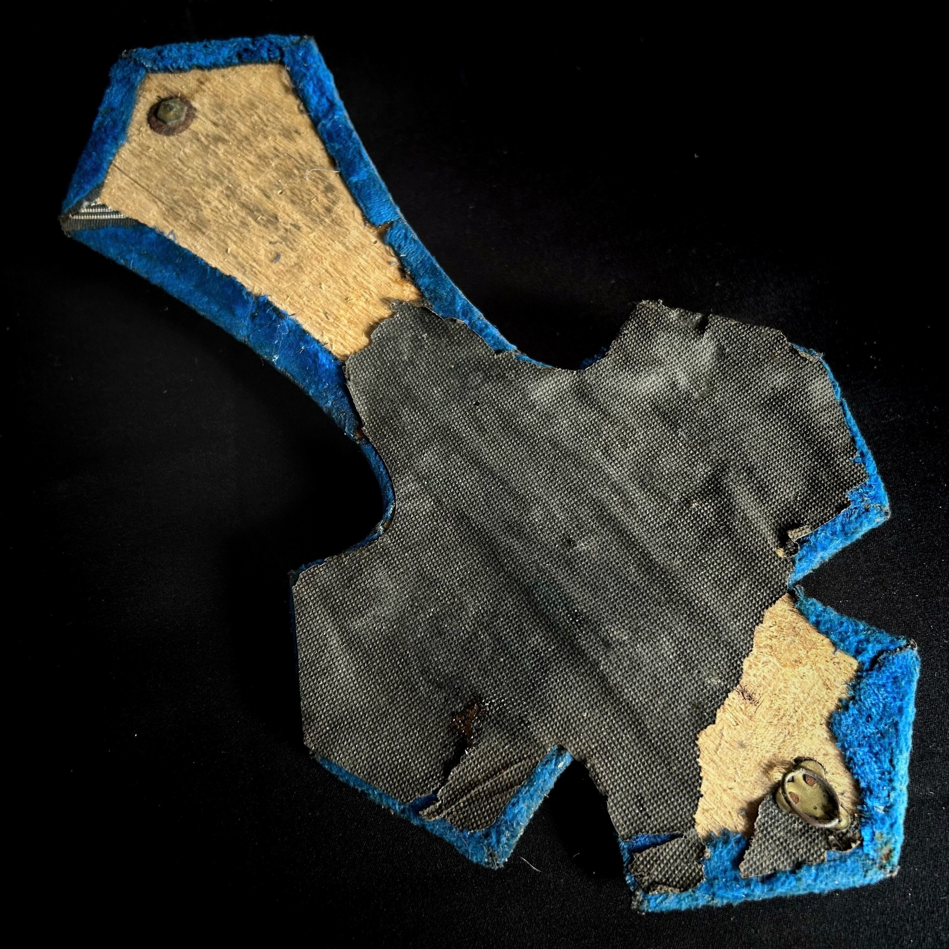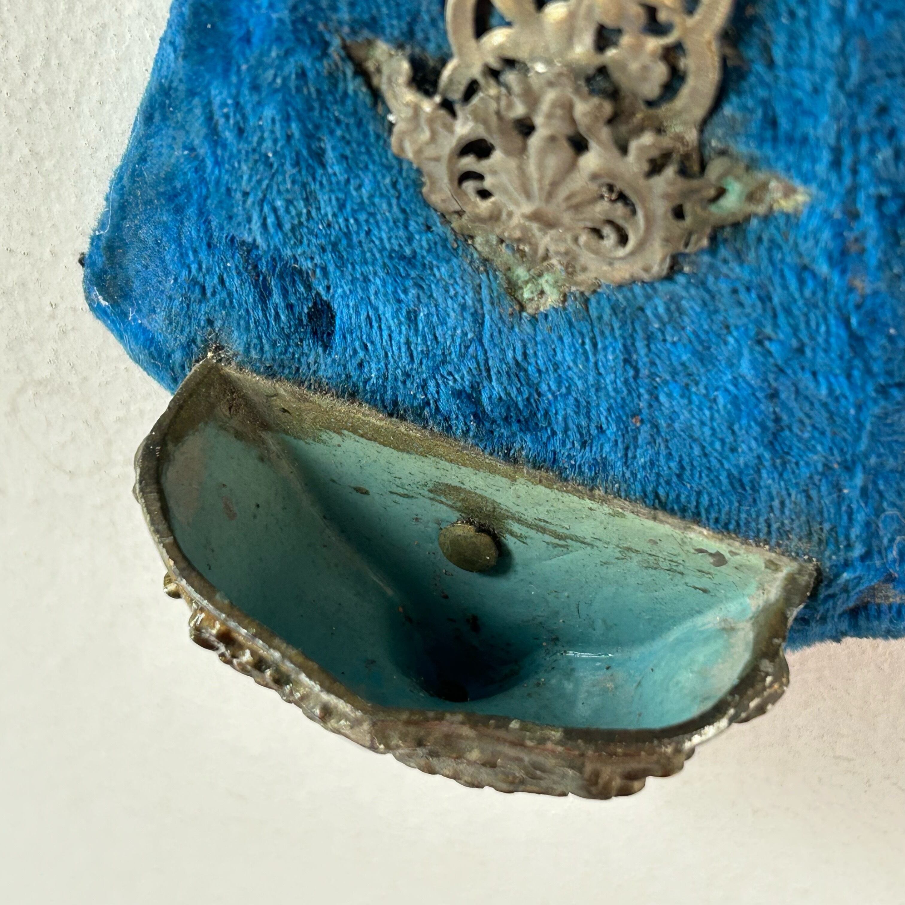 ところどころ擦り切れてはいますが未だ深みをまとうベルベットの青はマリア様を象徴しているのでしょうか。十字架は植物をモチーフにした細やかな透し彫り、聖水盤は植物の浮き彫りで、表情豊かに造形されたイエス様の像はその全身に憂いをたたえながら静かに目を閉じていらっしゃいます。長い時が流れ、そこに降りた様々な古色の全てが意図せずひとつの作品を創りました。これこそが神の御技でしょうか。この古い聖水盤は現代に生きるあなたに何を語るのでしょう。