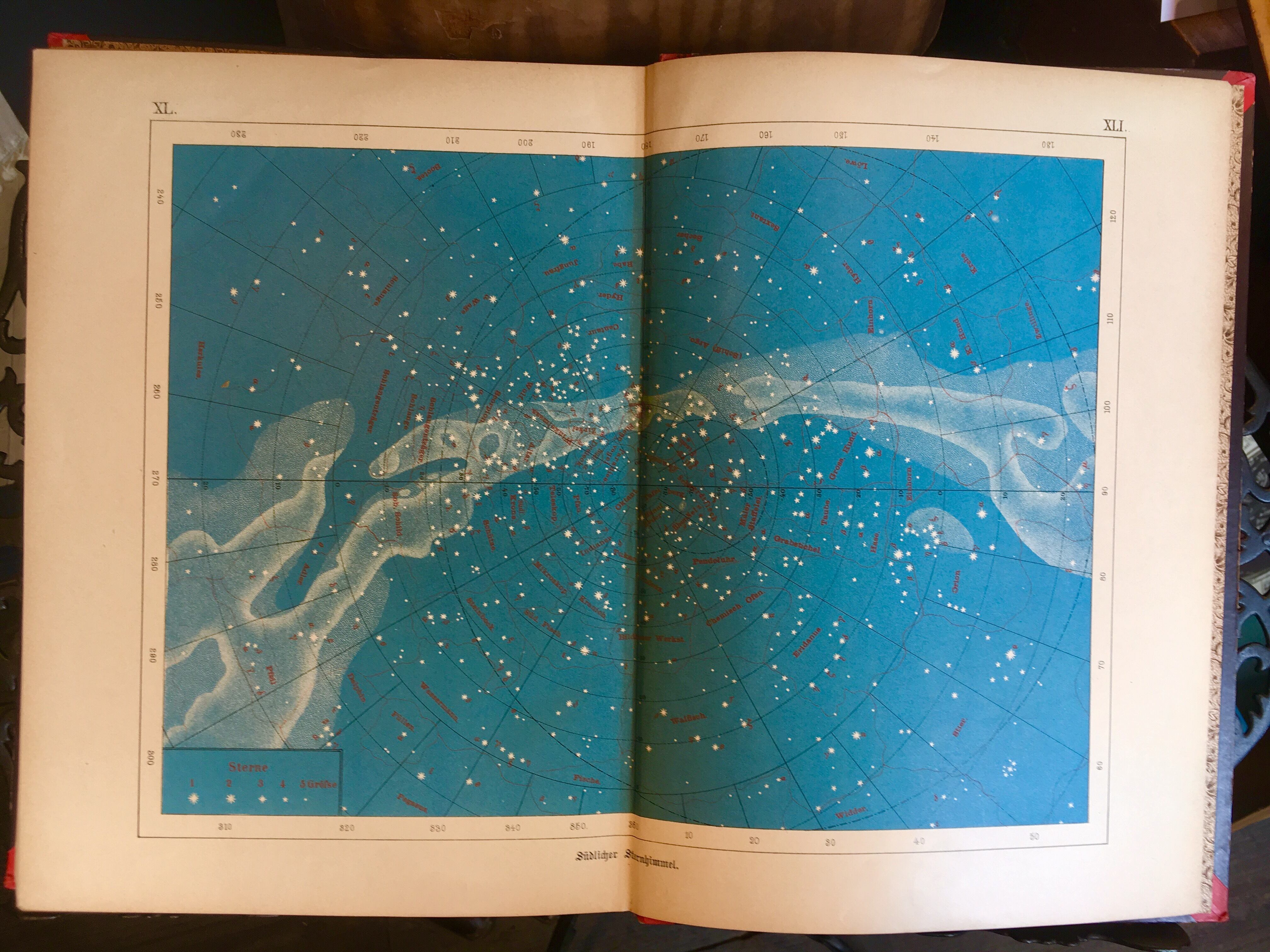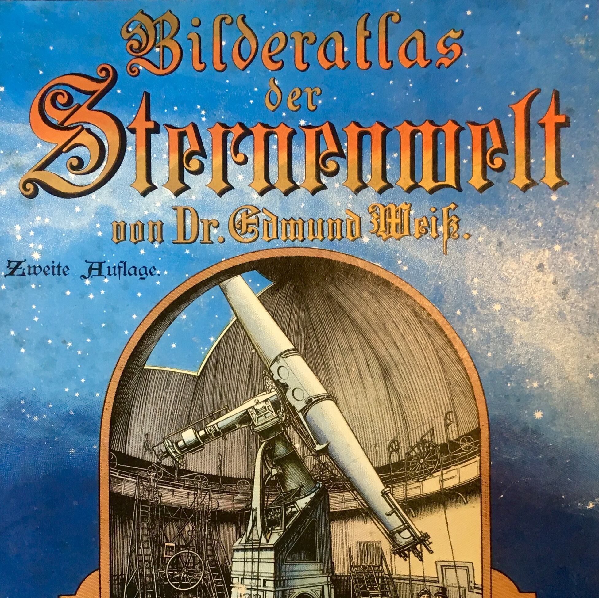 こちらは、ウィーン大学天文台の天文台長であったエドモンド・ワイスによる「図解・星の世界」。デザイン性の高いカラーの図版が41枚と大変豪華な作りです。表紙も素晴らしいですね。32.5×23×2㎝の迫力ある大型本。1892年にシュトットガルトで出版されました。