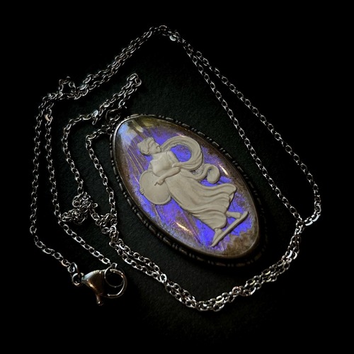 モルフォ蝶の羽根を背景に、ミューズのレリーフを置いたペンダントです。音楽や学芸を司るギリシャの女神は生き生きとした姿の浮き彫りとなっています。天然の羽根は光の加減で輝く青いベルベットからマットなパープルに、さらに古さびたオレンジへと様々に変容し、白い女神の移ろう心を映し出しているかのようです。