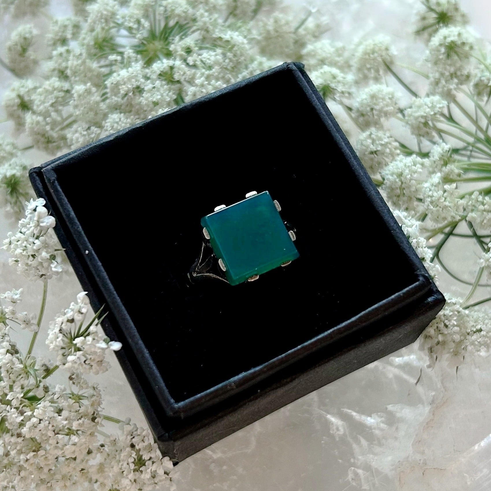 柔らかく艶やかなグリーンの瑪瑙が印象的な指輪です。正方形ですがやや丸みを帯びたカットで、少しだけミルキーなニュアンスの半透明の色彩と合わせて、とても優しくエレガントな美しさです。