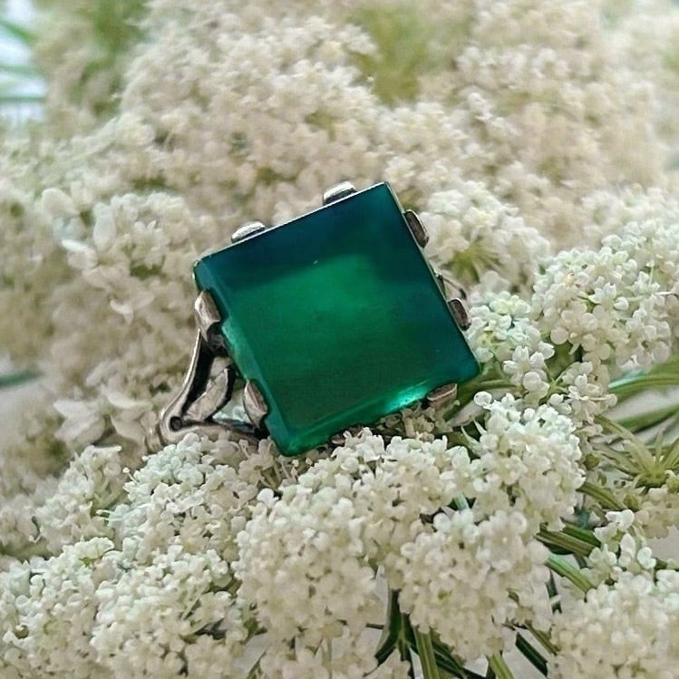台座はシルバーに金メッキが施されたようですが、経年によってリング部分はほんのりと金が感じられる落ち着いた質感になり、光を帯びた緑の石の周辺に薄く金色が残る景色は、これはもう古いものでしか味わえない特別な姿です。