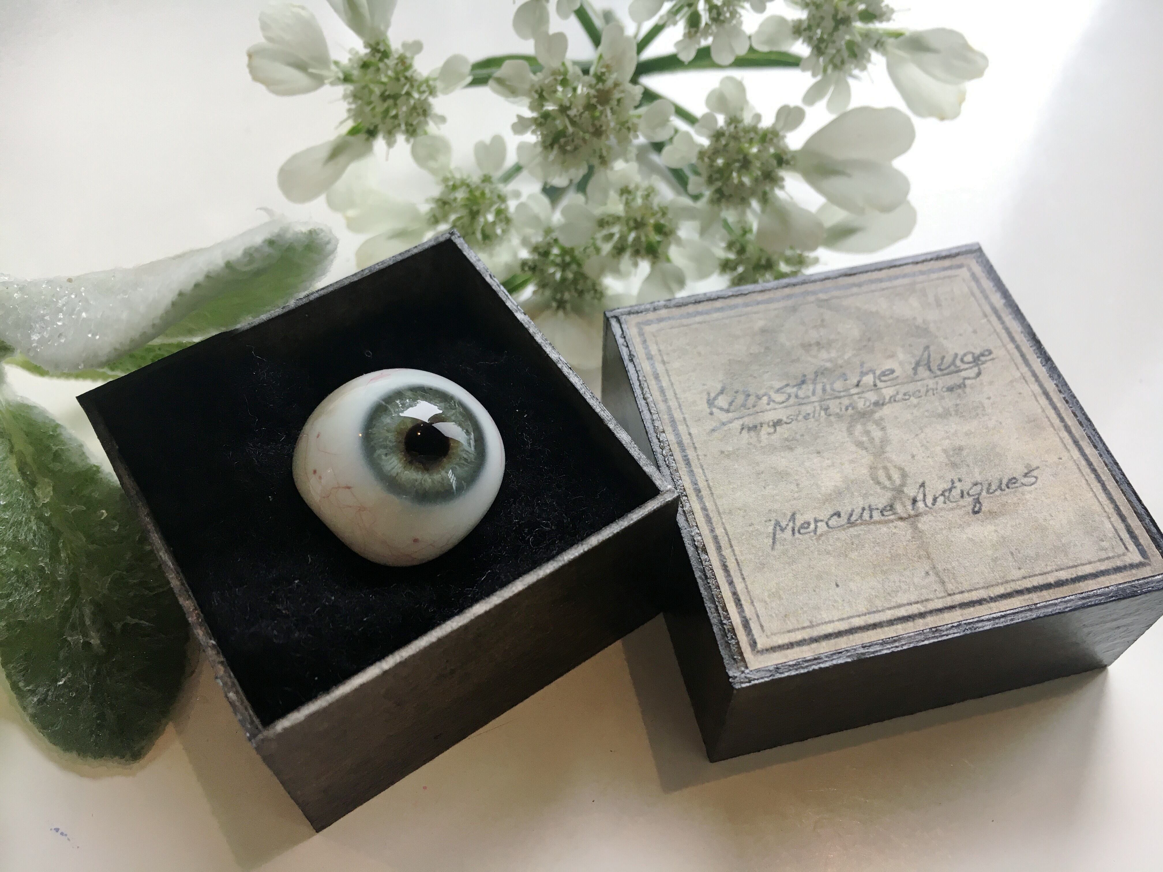 ドイツ、ラウシャの義眼で、製作は1890年頃。ラウシャは現在もガラス工芸の村として有名ですが、100年ほど前に作られたガラスの義眼は、透明感、虹彩の細工など、本当に素晴らしいものです。弊店のオリジナルデザイン、箱作家さんによる手作りの専用箱に入れてお届けします。箱の内寸は一辺約4センチですので、サイズの目安にしてください。