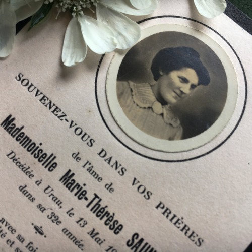 西洋の百合は、日本のそれのようにうつむかず、天を向いて咲きます。また、百合はマリア様の花でもあります。このカードの女性は、1917年5月13日に、32歳、独身で亡くなっています。カード下部の"C'EST UN DON DE DIEU DE MOURIR ET SANS TACHE"は、「若くして亡くなり若いままでいられることは、神からの賜物である。」という意味です。サイズは約11.5×7.5センチです。