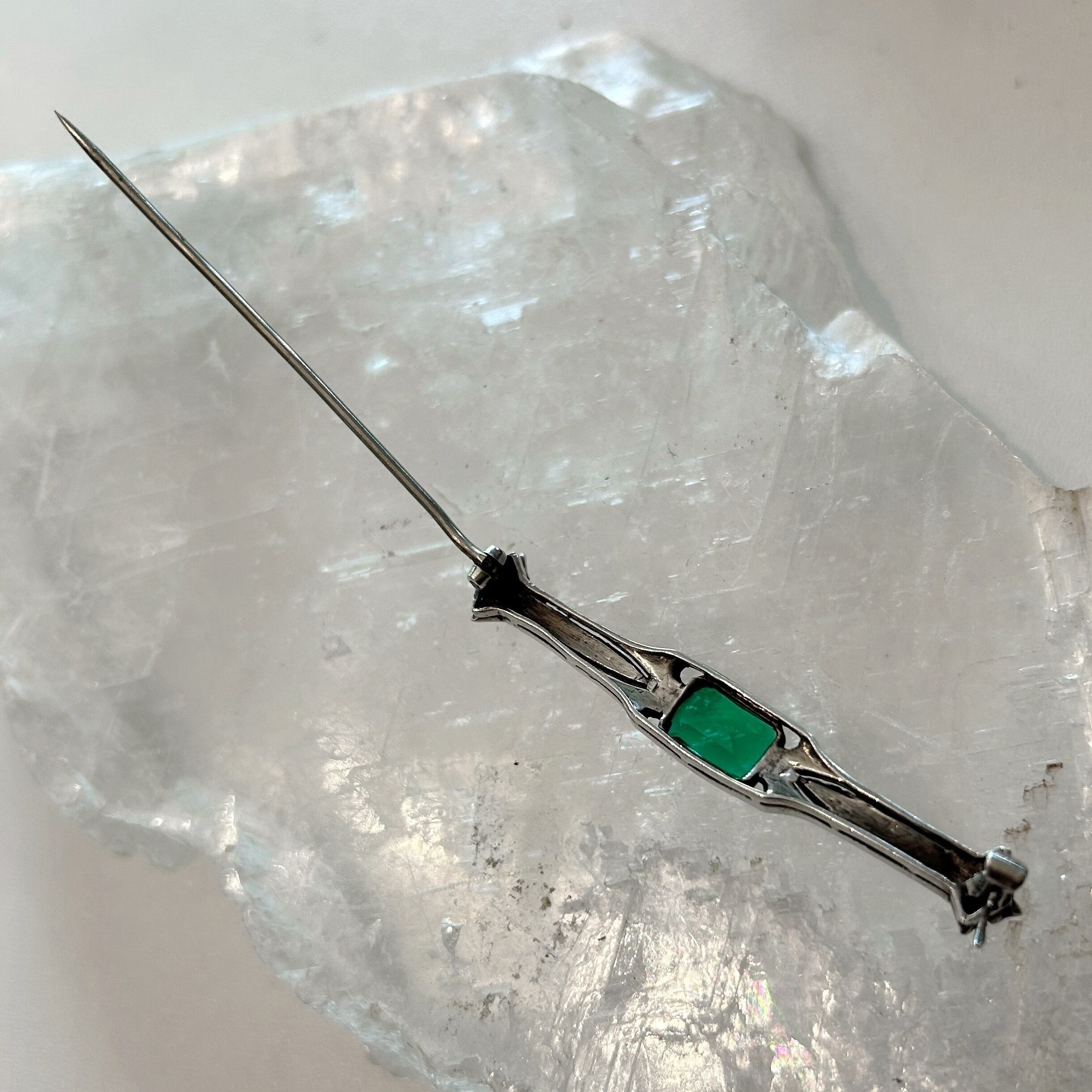 透明感のある緑が印象的です。綺麗にカットされたペーストガラスは、その内に緑の光と影が織りなす世界を宿し、伝説の湖水を垣間見るような神秘的な美しさです。台座のシルバーが時の流れで少しダークな質感となり、散りばめられたクリアなガラスの粒の繊細な煌めきとよく調和して高貴なエレガンスを感じさせます。