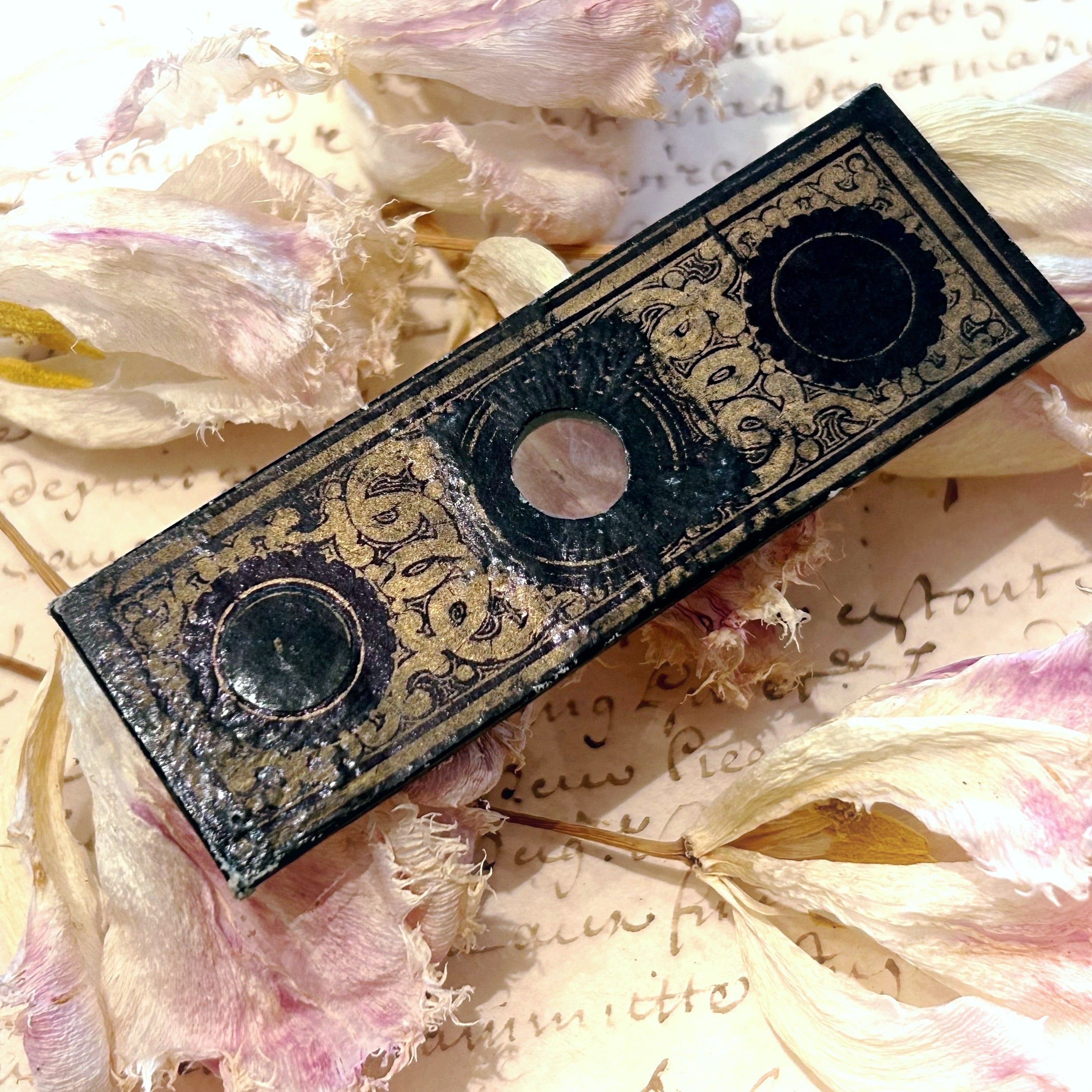 ガラスのプレパラート標本を紙でラッピングしたシリーズの一枚です。黒を背景に金色の曲線がうねるデザインは、真ん中に開いた穴から神秘の世界を覗き込む魔法の板という趣です。裏面にも凝った装飾が施され、当時、これを手にした人を博物学へと誘う招待状だったのでしょう。