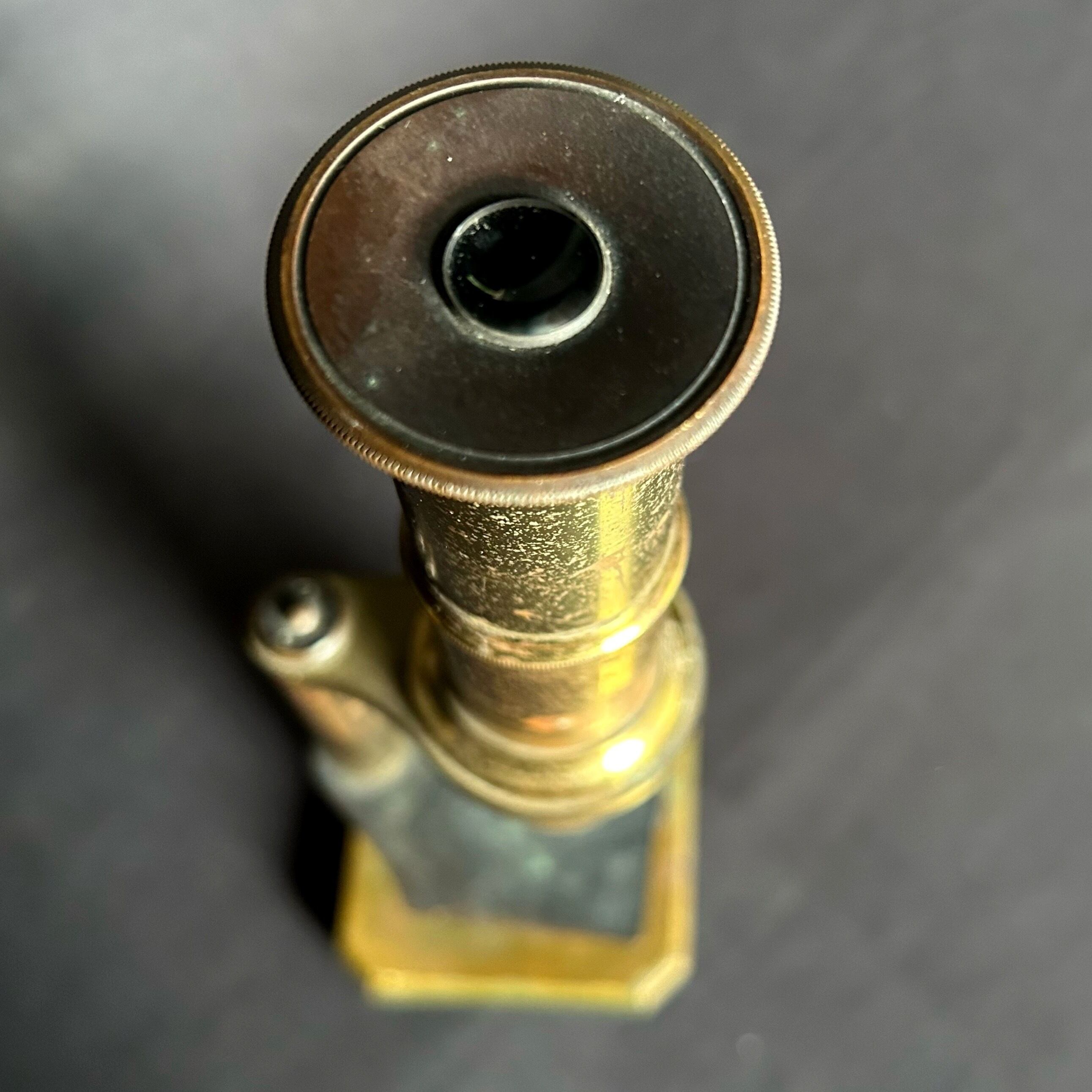 真鍮とスチールの顕微鏡です。19世紀、顕微鏡は限られた専門家だけのではなくなり、アマチュア博物学者や学生にとって必要十分な機能と堅牢性を持つものが作られるようになりました。こちらもそんな顕微鏡のひとつで、素晴らしく機能的にデザインされたものだけが持つ魅力に溢れています。