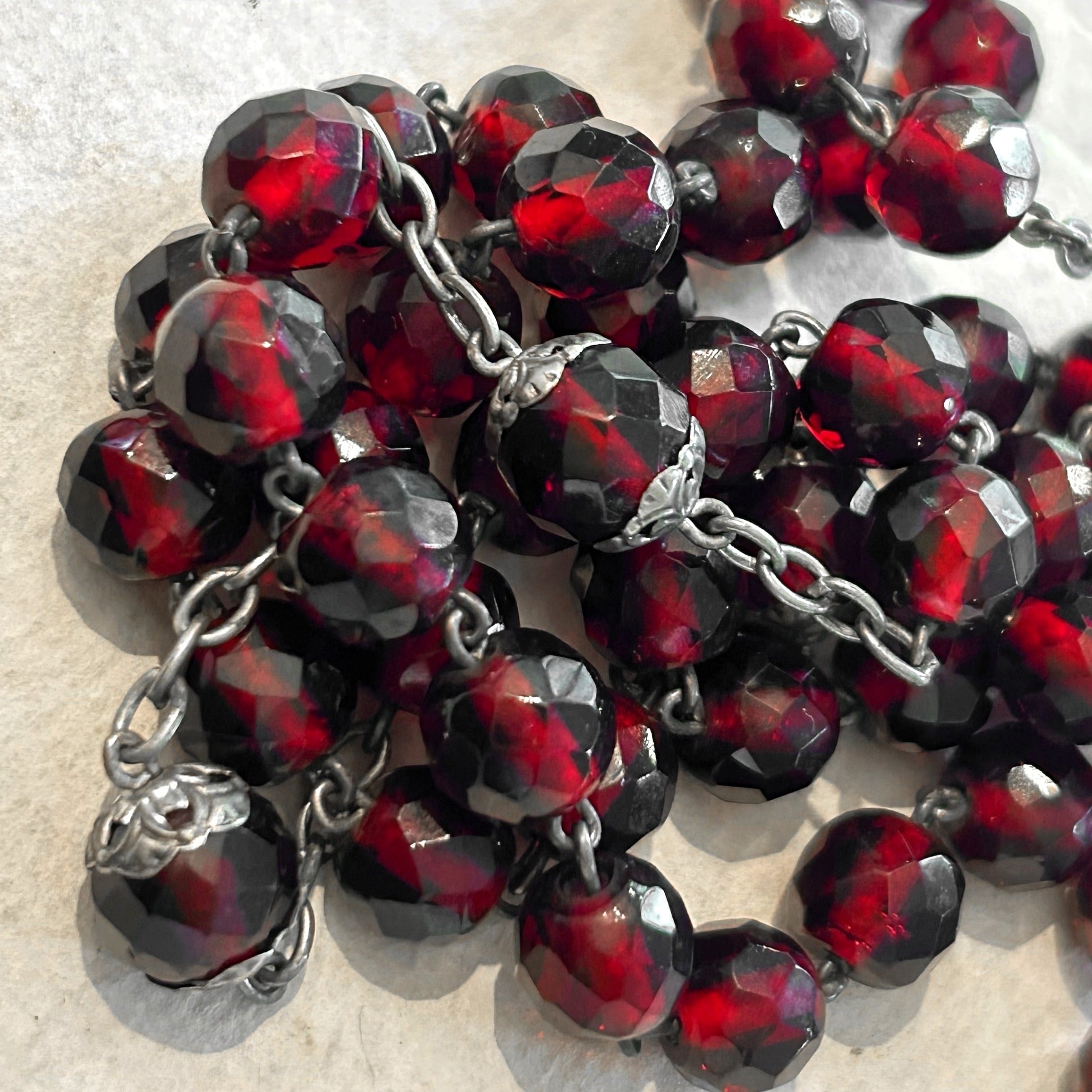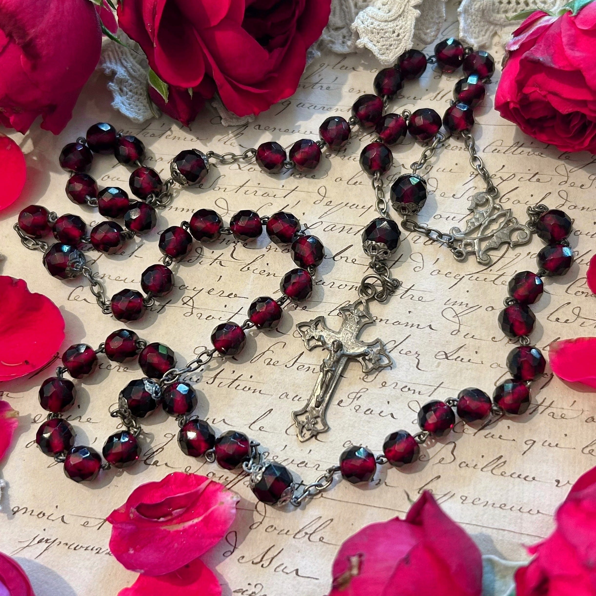 20世紀の初めの頃までのフランス製と推定されます。ロザリオは本来、首から掛けるものではないためチェーンを切り離す環がついておりませんが、こちらはチェーン部分の長さが約68センチと大型のロザリオですので、十分に首から掛けていただけると思います。クロスが約1.9×4センチ、クロスとチェーンを繋ぐ部分が長さ約13.5センチです。