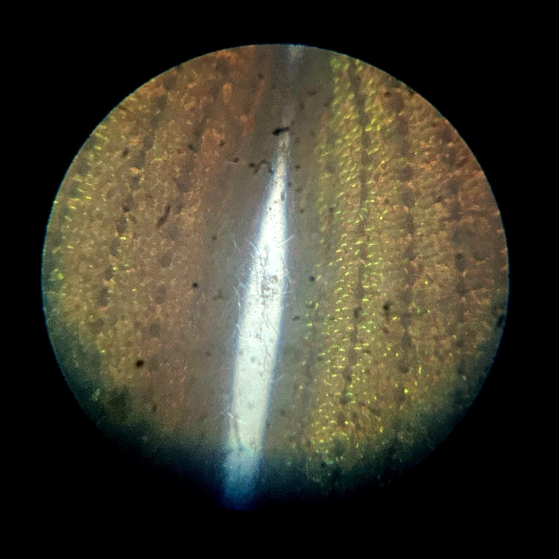 非常に珍しい木製のケースを使った顕微鏡プレパラートです。本来、光学顕微鏡で見るための標本はごく薄い切片をスライドガラスにのせたものですが、厚みのあるものの場合は押しつぶしたり封入剤を使って固定するなどのため、手間がかかる上に試料を損なうなどの問題が起こります。しかし、この方式では立体の形状を損なうことなく標本を作ることができます。画期的な考案だと思うのですがなぜ普及しなかったのでしょう。とても希少なお品です。