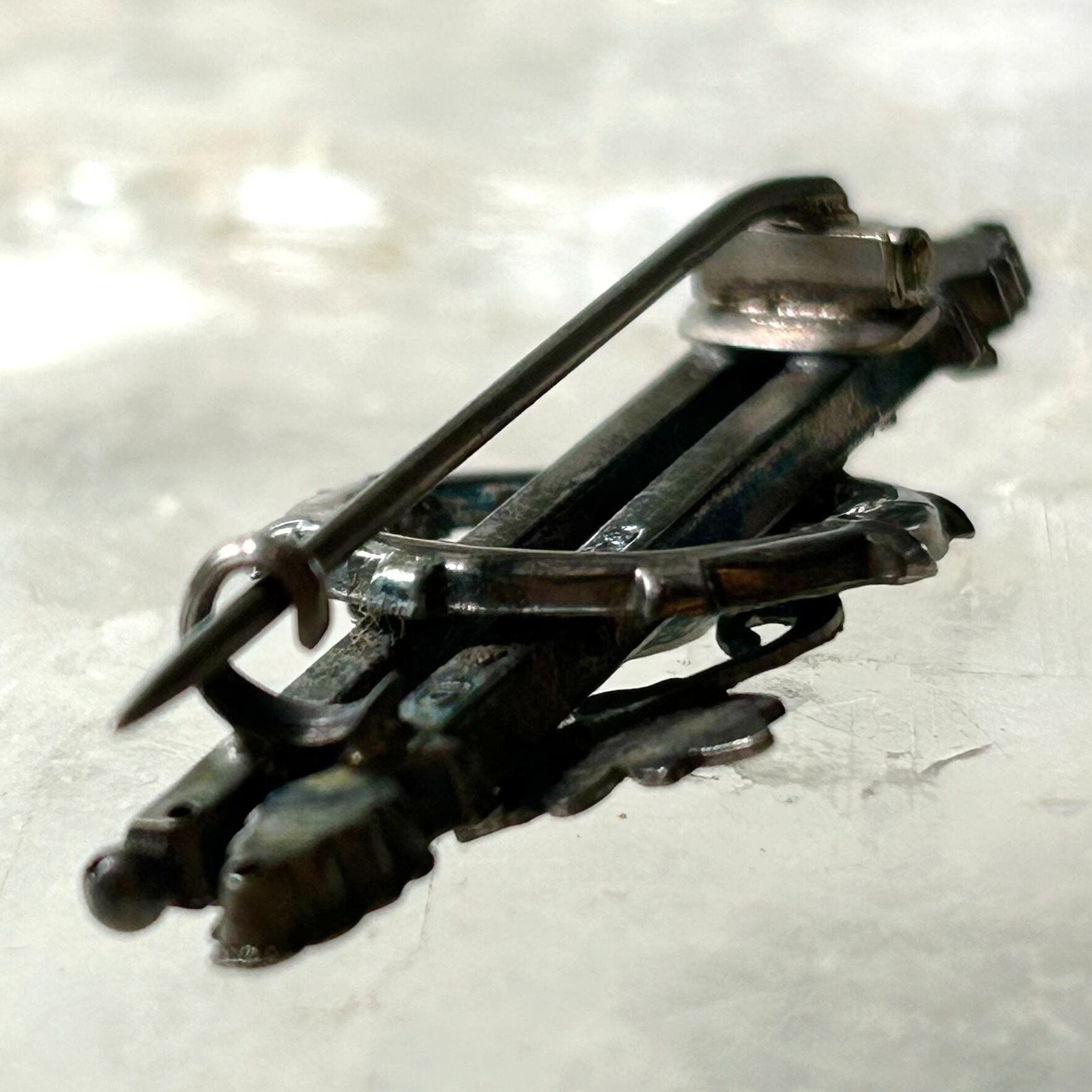 素材は銀の純度が92.5%のスターリングシルバーです。もとはそこに金メッキが施されていたようですが、長い年月を経て薄らぎ、地金の銀も感じられる質感になりました。光の角度で渋いゴールドとダークなシルバーが交互に現れ、ほのかな煌めきと静かな翳りを併せ持つ奥深い美しさは古いものならではのものです。