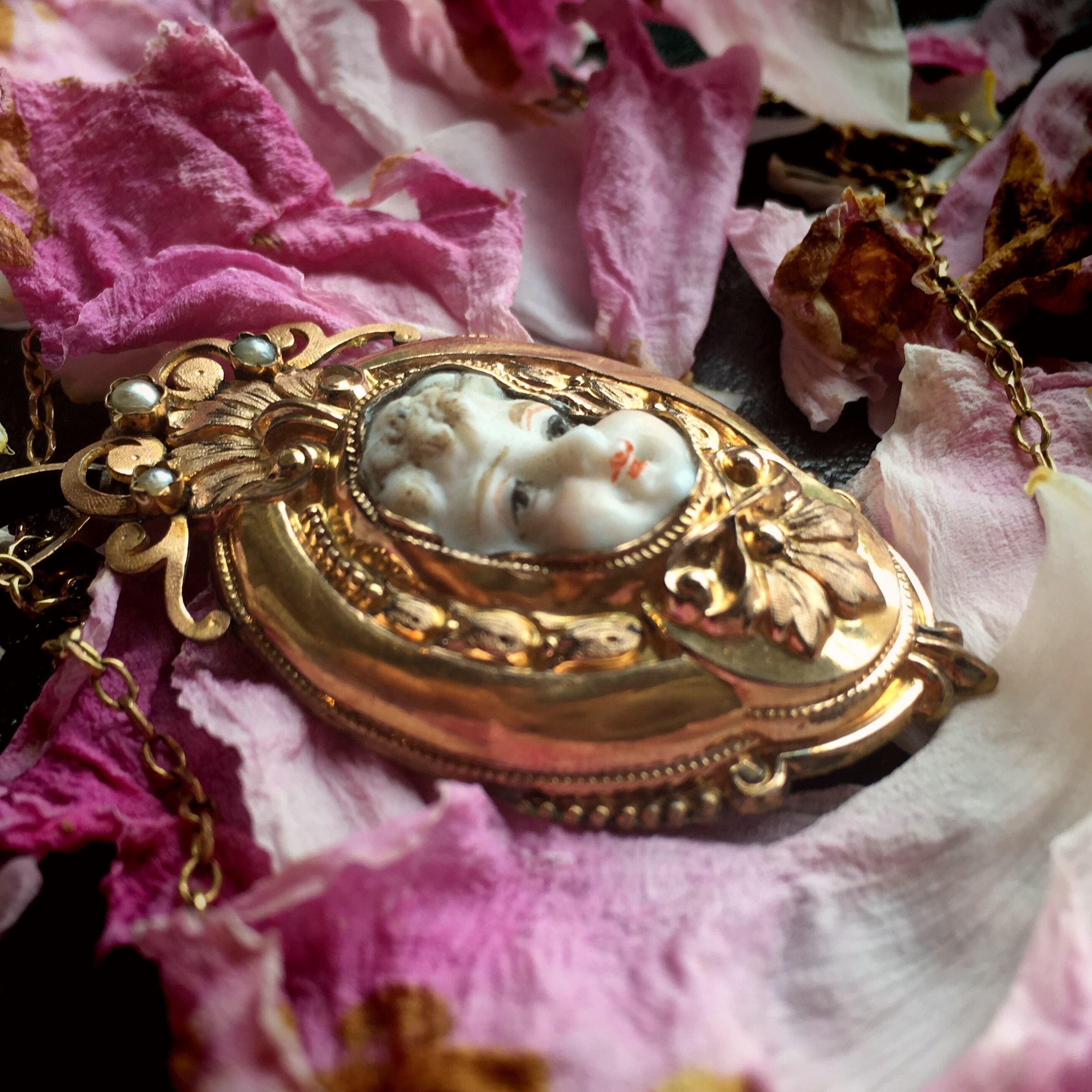 金属の台座の中央にビスクの少女の顔がはめ込まれたペンダントです。上部に小粒の淡水真珠が3つあしらわれています。台座、少女の顔ともに細かい細工が施され、憂いに沈む表情にも、希望を見つけた柔らかな微笑みにも見えます。あなたはこの少女に何を見るのでしょうか。