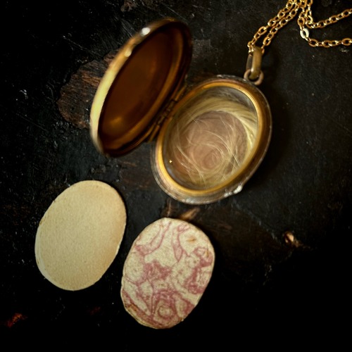 黒い台座にしっとりと落ち着いた金の十字架が埋め込まれ、中には女性の写真が秘かに納められています。もうそれだけで、このペンダントが語る古く長い物語が始まります。しかし、このロケットはその女性の写真の下にもう一枚、乳児の写真とさらにその下に遺髪が納められているのです。