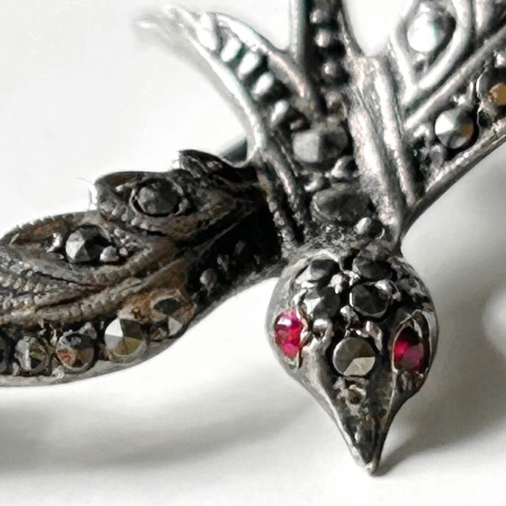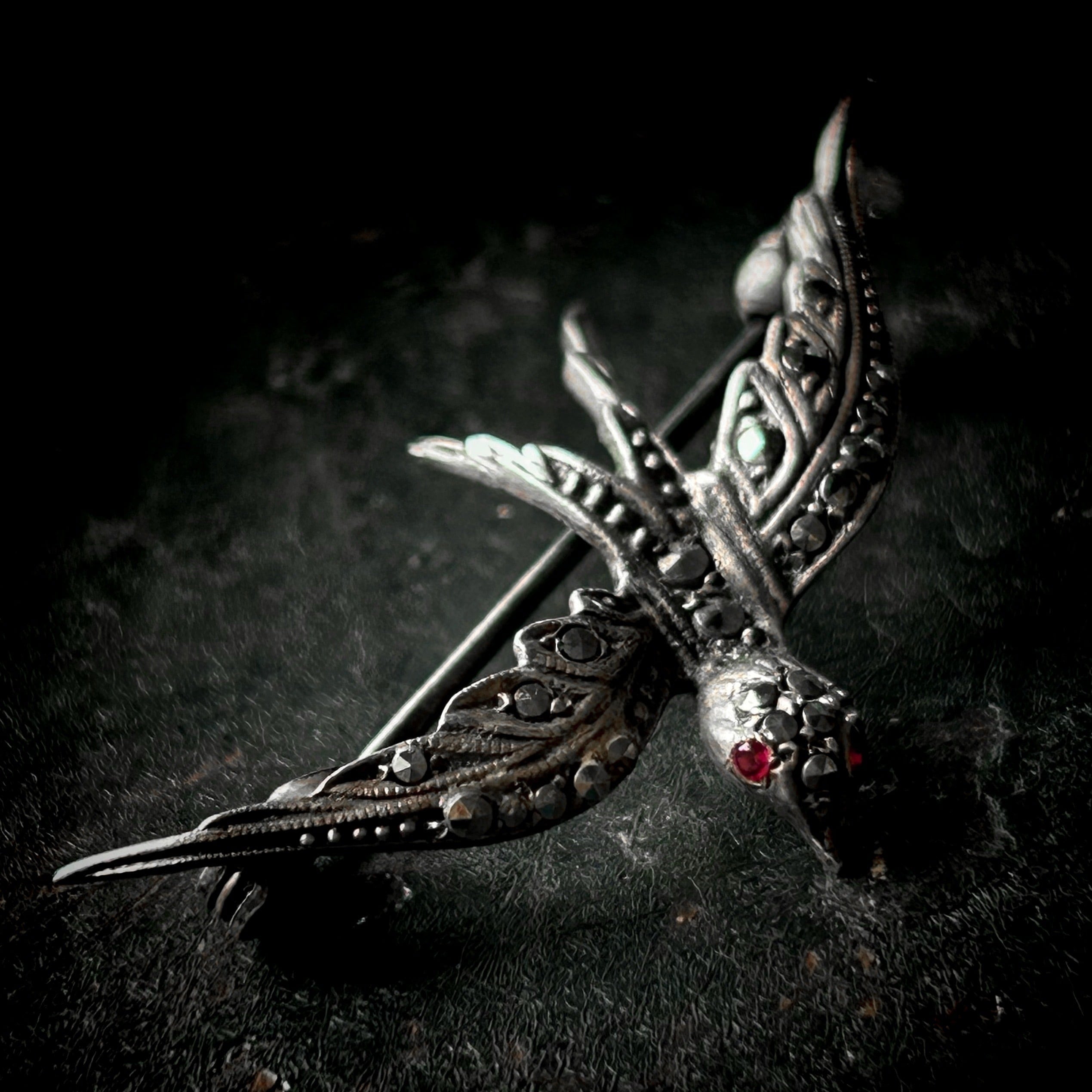 ツバメは幸せを運んでくる鳥です。オスカーワイルドの「幸せな王子」では王子の像のサファイアの眼を貧しい人に運びますが、ここではツバメの瞳が綺麗な光を宿すガーネットです。シルバーの身体には細やかな粒の加工が施され、風を切る翼や尾羽はしなやかな曲線で表現されています。そこに散りばめられたマーカサイトが鋭い銀の光を放ち、時とともに深い黒みを帯びたシルバーに生き生きとした輝きを与えます。