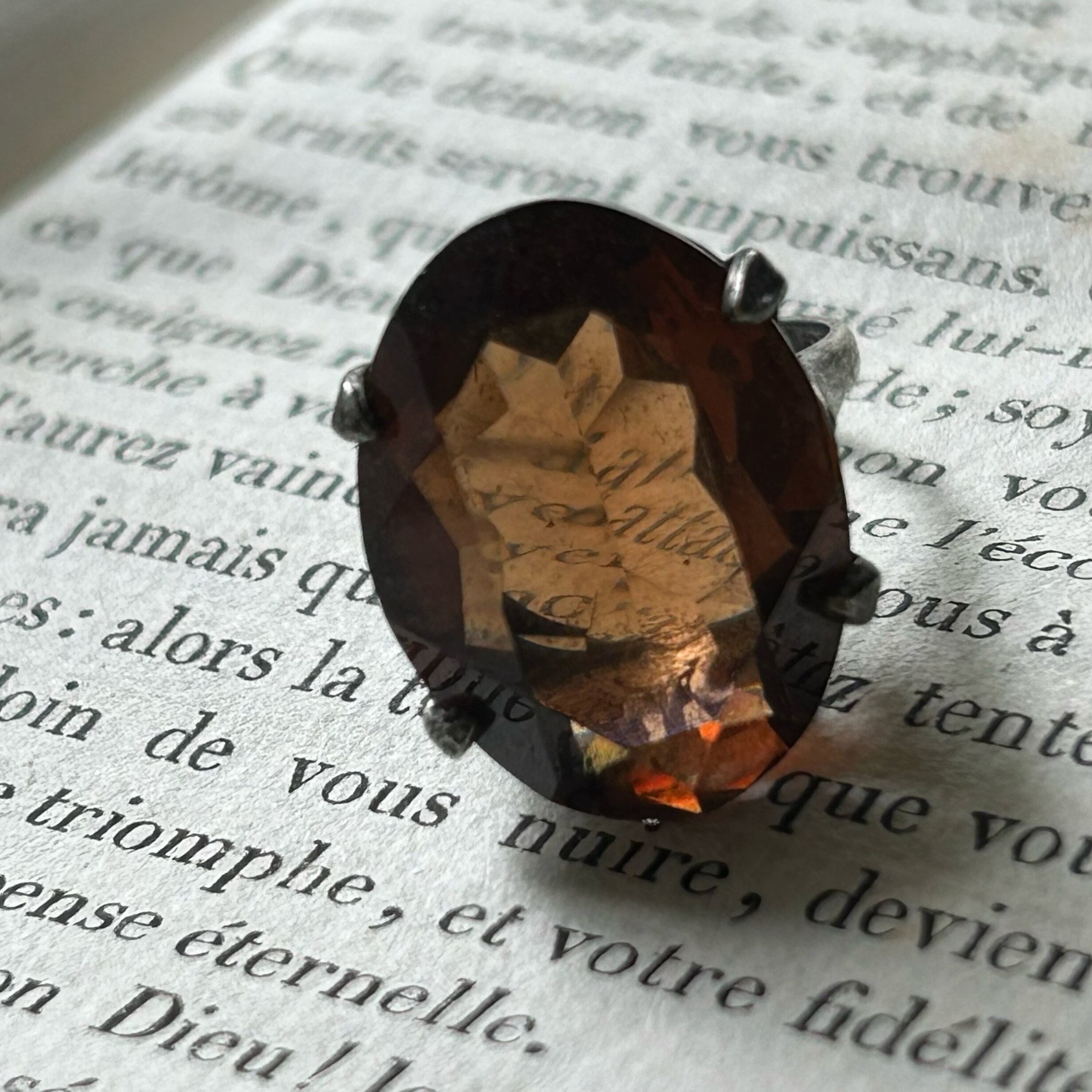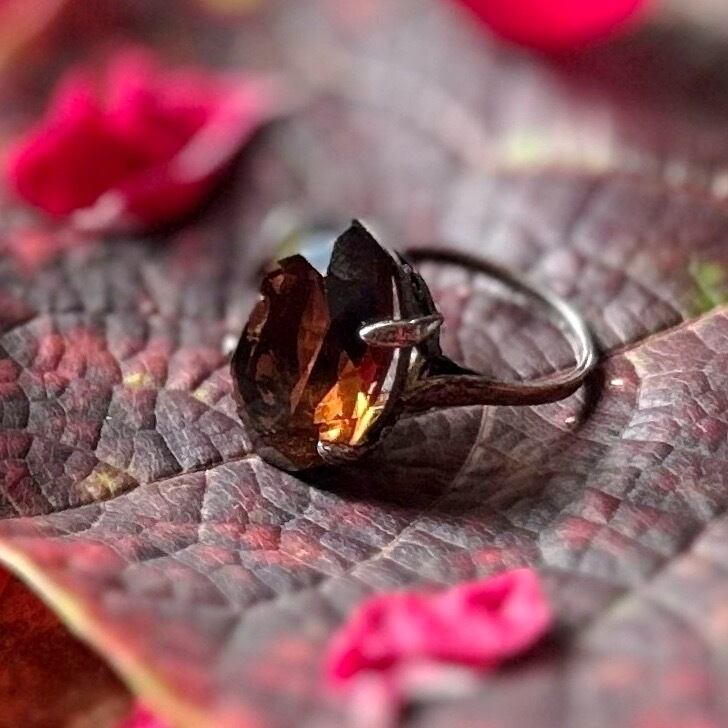 大粒のスモーキークォーツが印象的なの指輪です。黒みにかなり茶色が強いのですが豊かな透明感もあるので、独特な深い色調になっています。台座は底がない籠のようになっており、綺麗にカットされた石の側面や下から光が入るため、澄んだ水晶の中に銀を帯びた光が煌めきます。