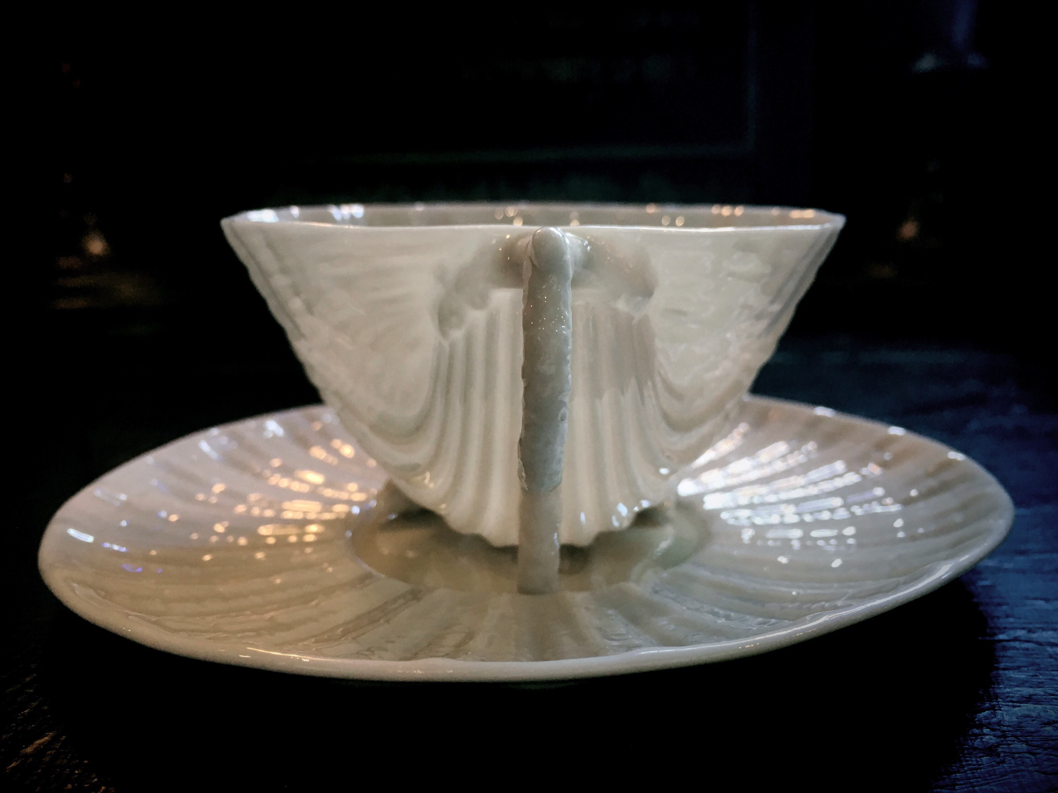 ネプチューンの名にふさわしく、全体が貝と波、カップの脚が貝、持ち手がサンゴのデザインです。ポーセリンマークは窯の創業以来2番目、1891年から1926年に使用されたセカンドブラックマークですが、こちらのお品は1901年製造のようです。ネプチューンシリーズの中でも、この時代のものは生地や細工の繊細さ、美しさはとびきり素晴らしく、長い歳を経た希少性もあります。生地は、光はもちろん、マークが透ける程の薄さですが、手洗いをしていただければ実用にも十分堪える強度があります。