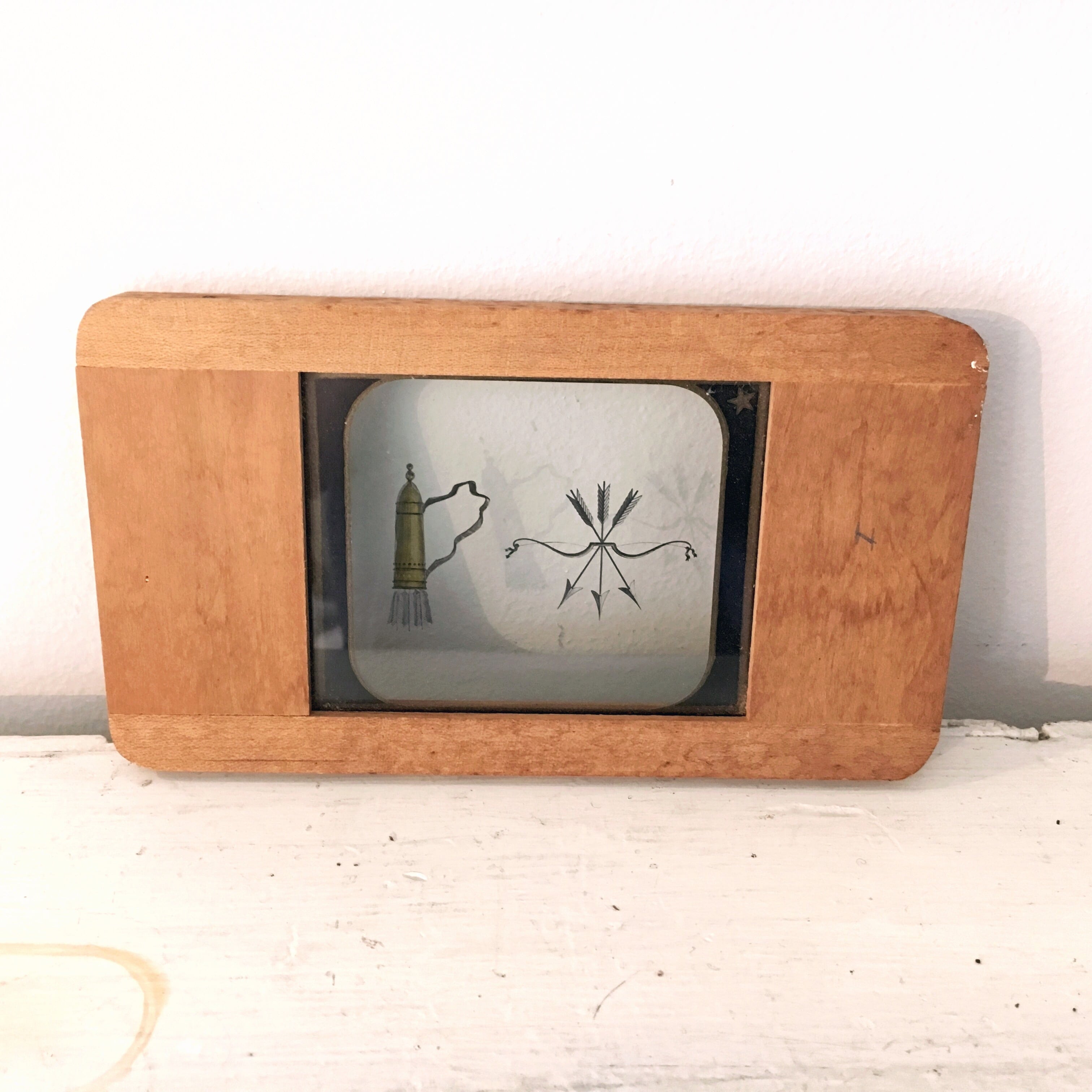 1890年代、フリーメーソンのアメリカ合衆国のロッジ(支部)が製作した木枠幻灯機スライドです。3本の矢と弓、そして矢筒が描かれ、フリーメーソンのシンボルとして大切な意味を持っていたものと思われます。儀式や集会などで、投影して使われたのでしょう。もともと拡大して見るものなので、大きくしても粗がないように精緻な絵になっています。専用の展示用スライドボックスを使うと、その辺りが格段によくご覧いただけますので、よろしければ合わせてお楽しみください。