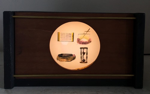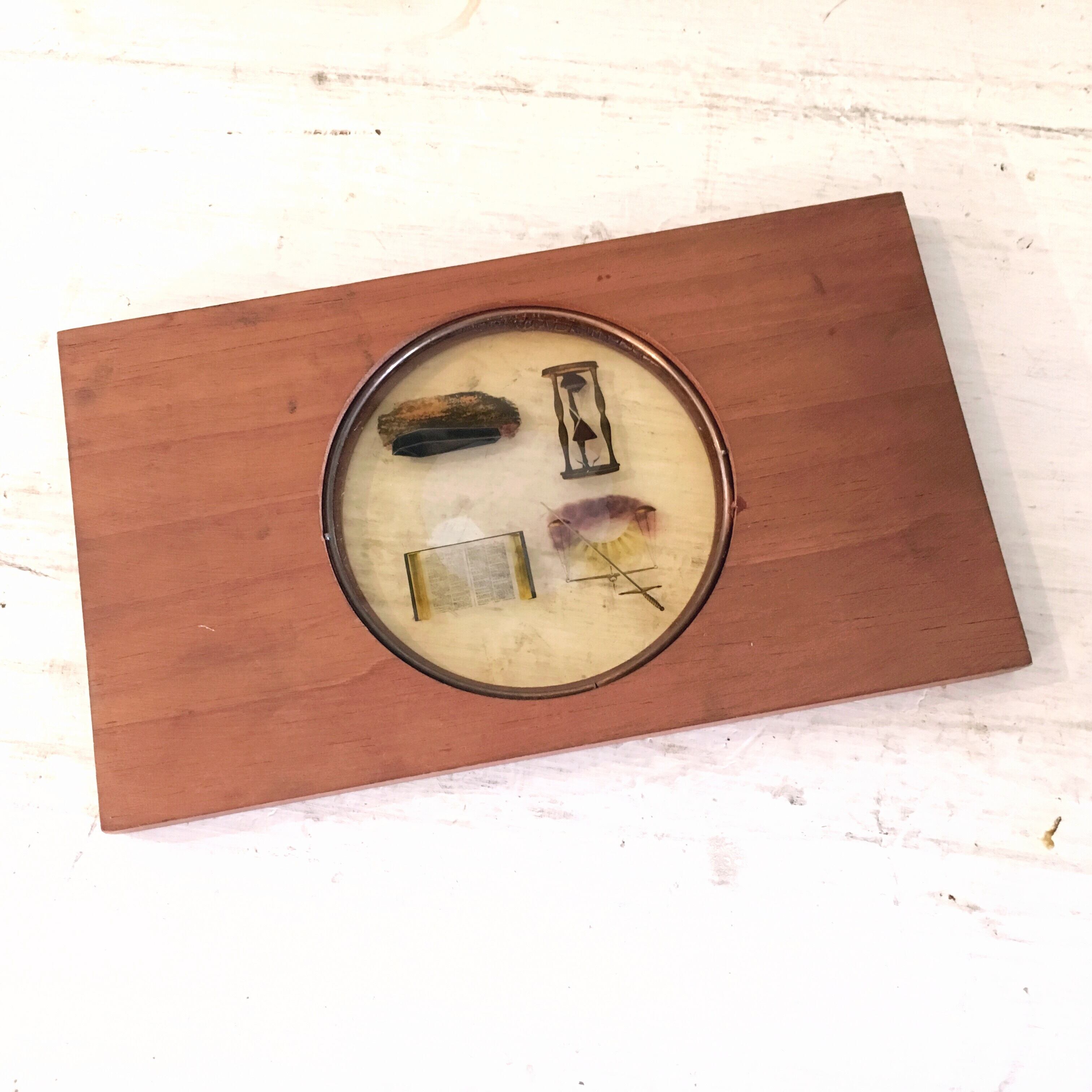 オッドフェローズは18世紀、英国で創設された、フリーメーソンと並ぶ秘密結社、友愛団体です。こちらは、19世紀末にオッドフェローズのロッジ(支部)で作られた木枠幻灯機スライドです。"Odd Fellows Third Degree" との記載がありますので、第3階級に関連したシンボルのようです。4つのシンボルが描かれていますが、フリーメーソンと同様の意味を持つと仮定すると、砂時計は人の命の儚さ、棺は死、などの意味と思われます。儀式や集会などで投影されて使用されたものでしょう。もともと拡大して見るものなので、大きくしても粗がないように精緻な絵になっています。専用の展示用スライドボックスを使うと、その辺りが格段によくご覧いただけますので、よろしければ合わせてお楽しみください。