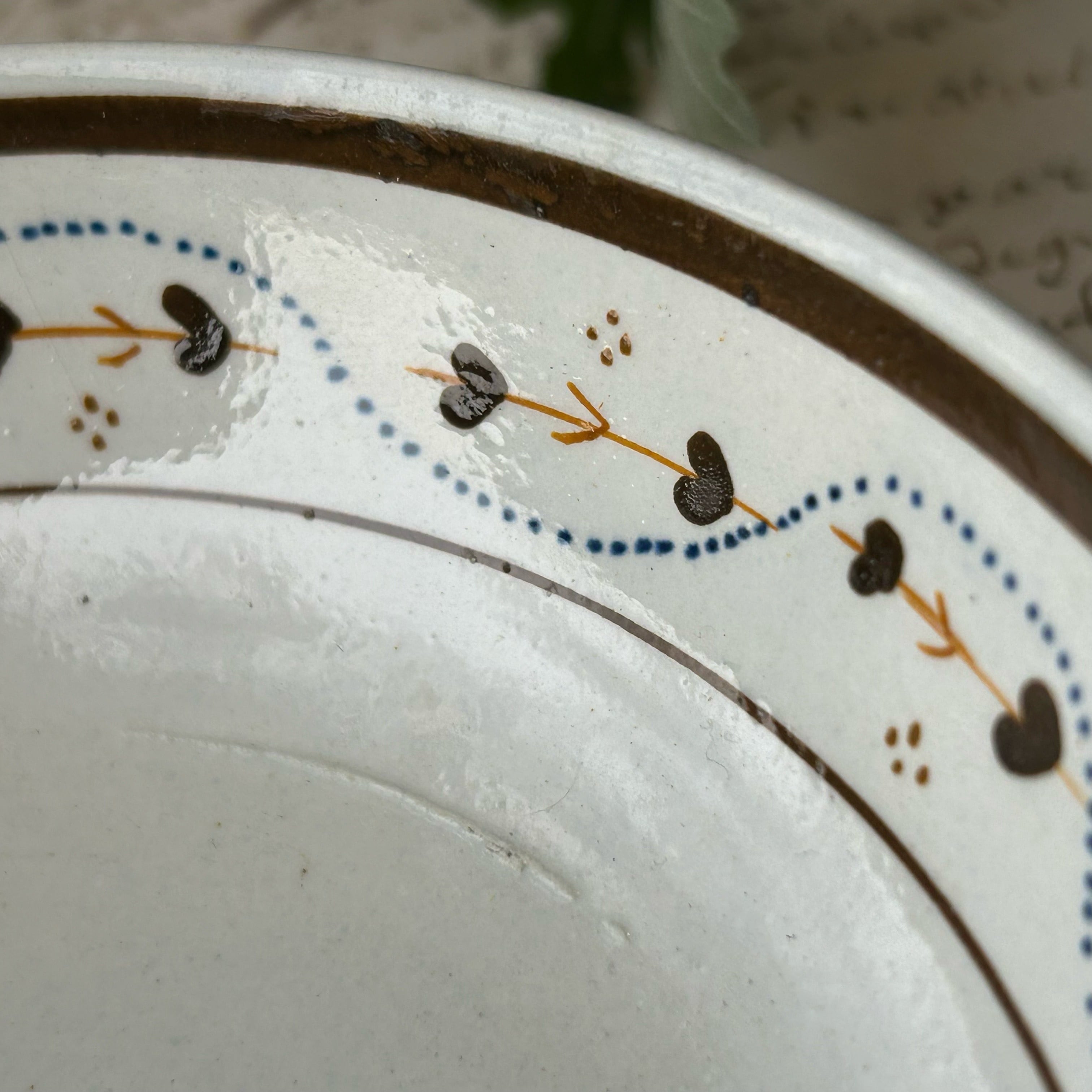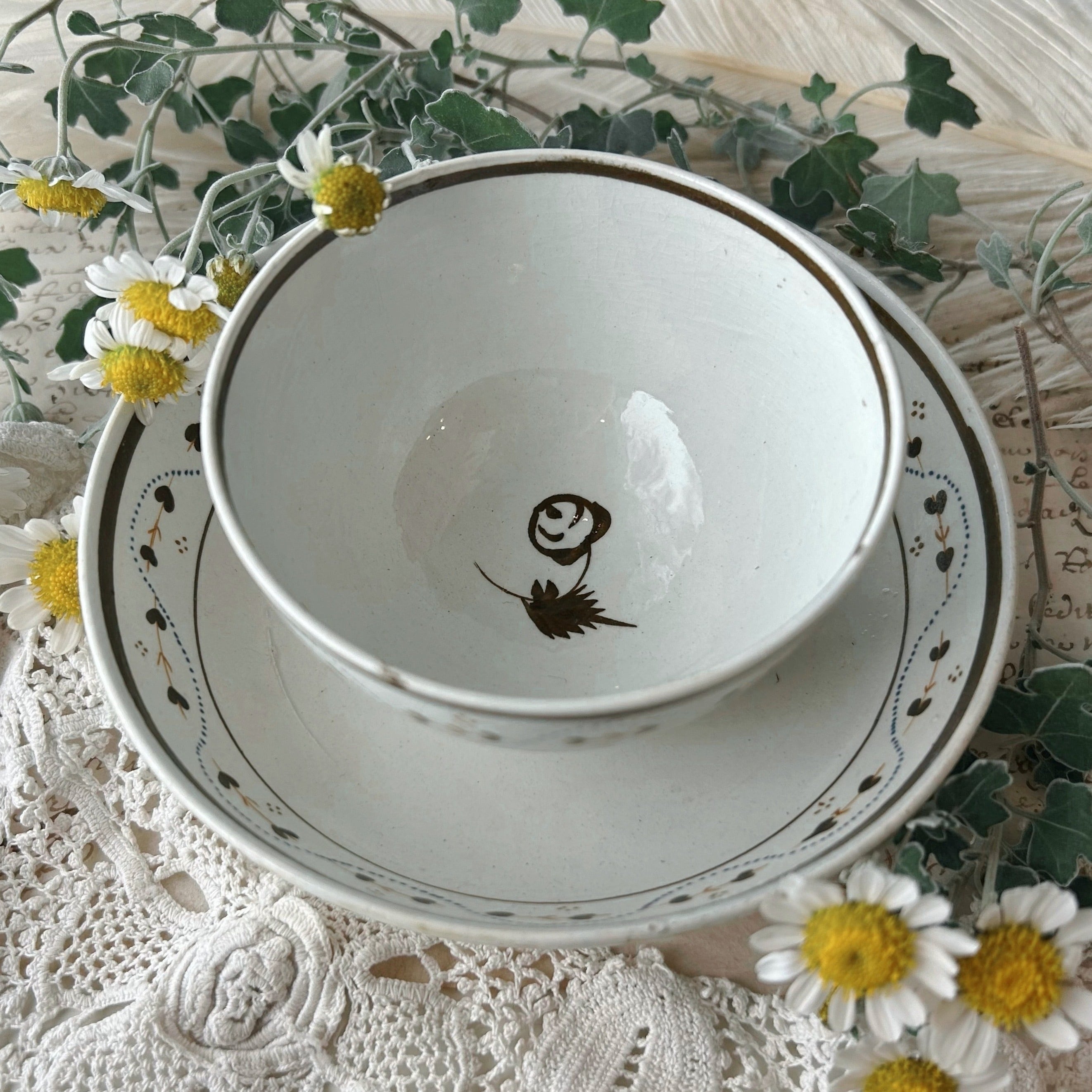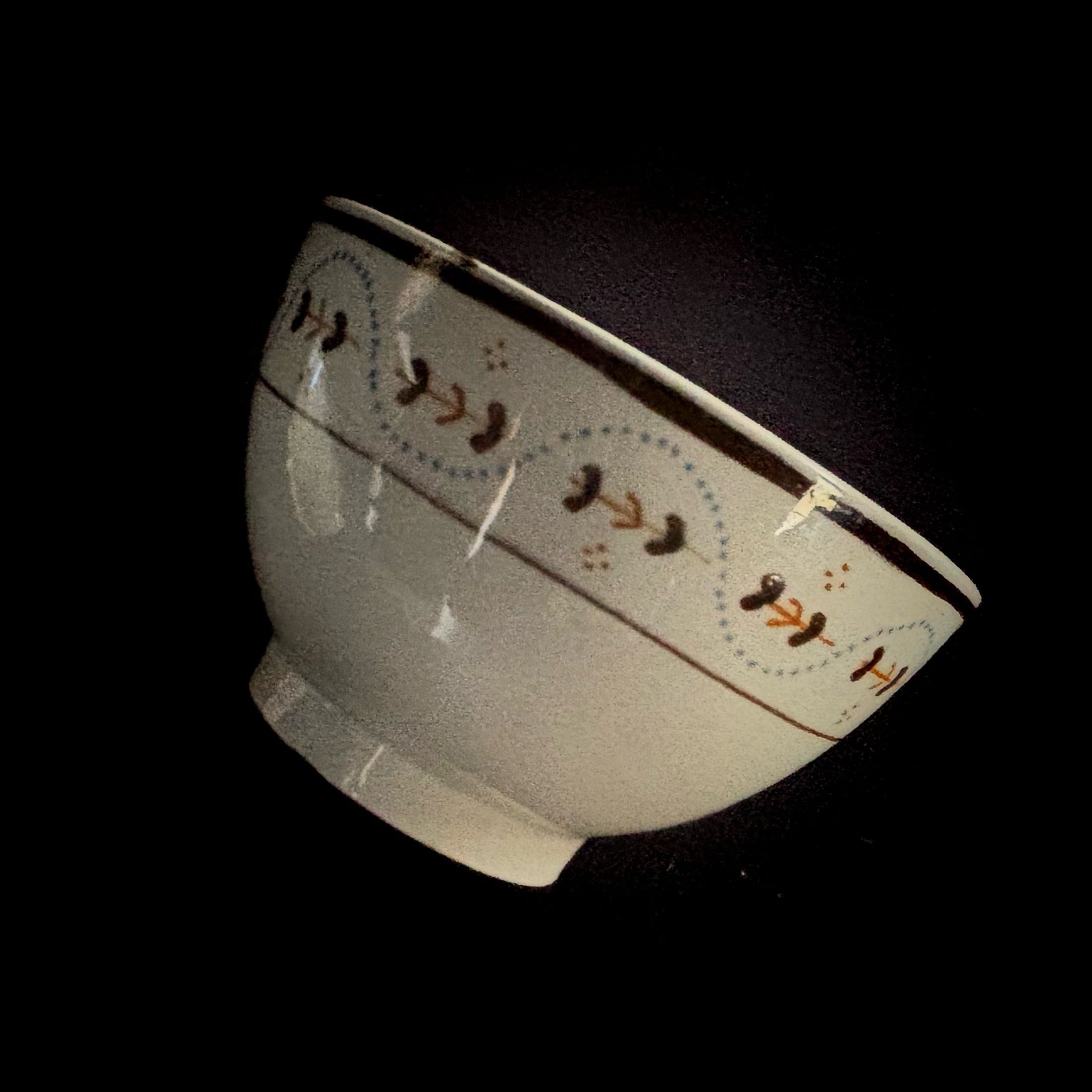 花が一輪ずつ、カップにもお皿にも描かれています。周りの点々が不思議なリズムを刻み、茎のような模様が輪になって踊ります。さて、どこか幻想的な魅力に溢れる古いティーボウルです。