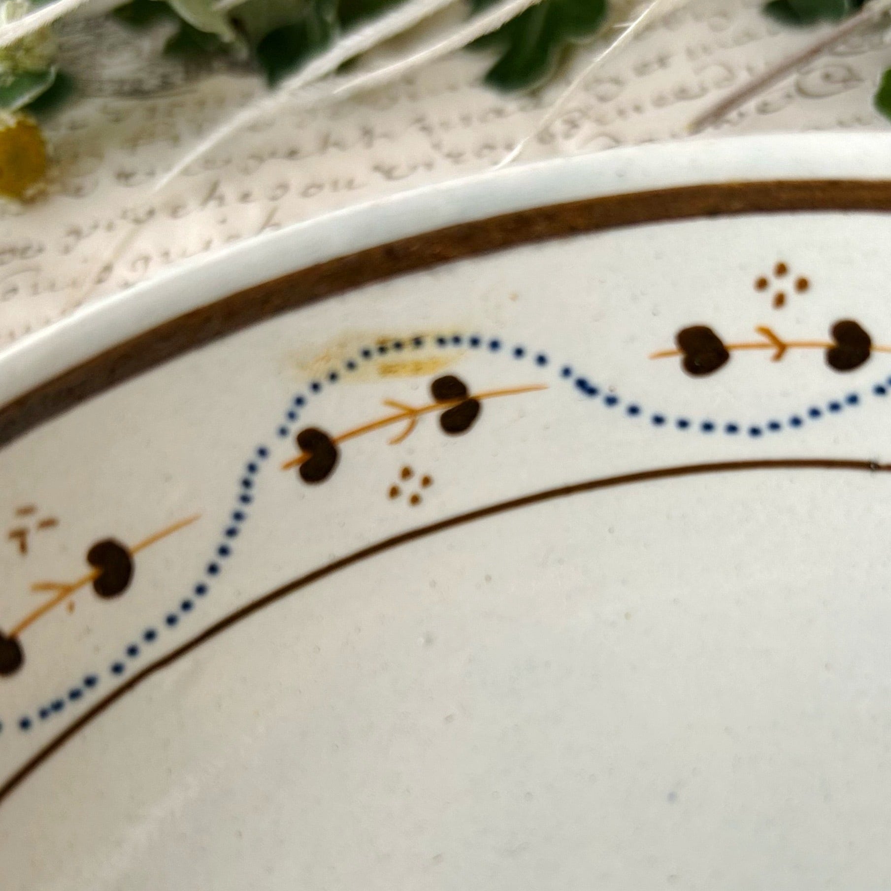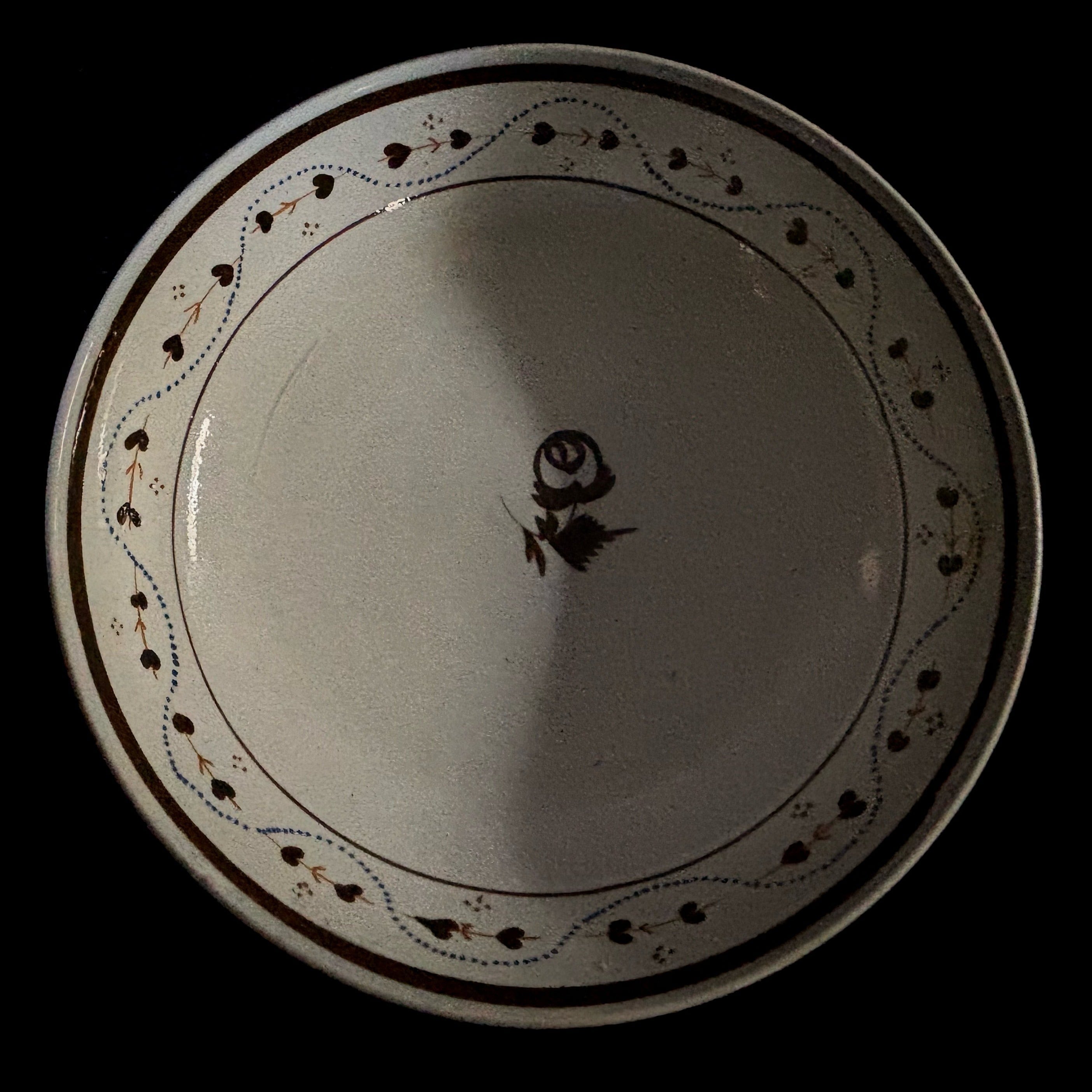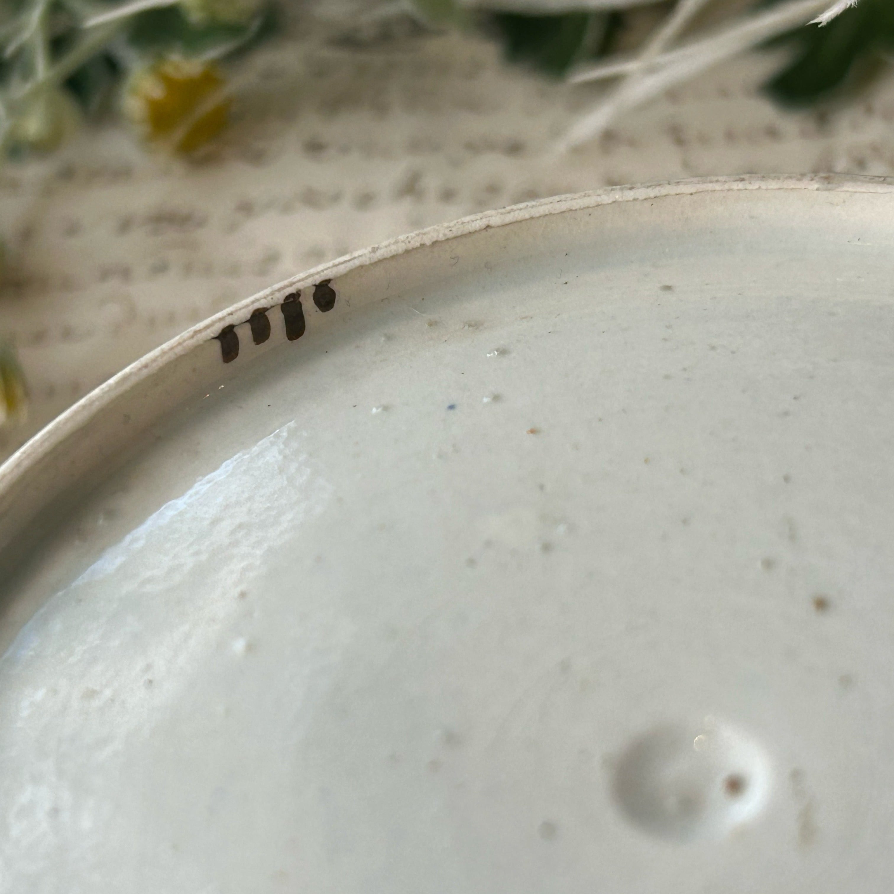 花が一輪ずつ、カップにもお皿にも描かれています。周りの点々が不思議なリズムを刻み、茎のような模様が輪になって踊ります。さて、どこか幻想的な魅力に溢れる古いティーボウルです。