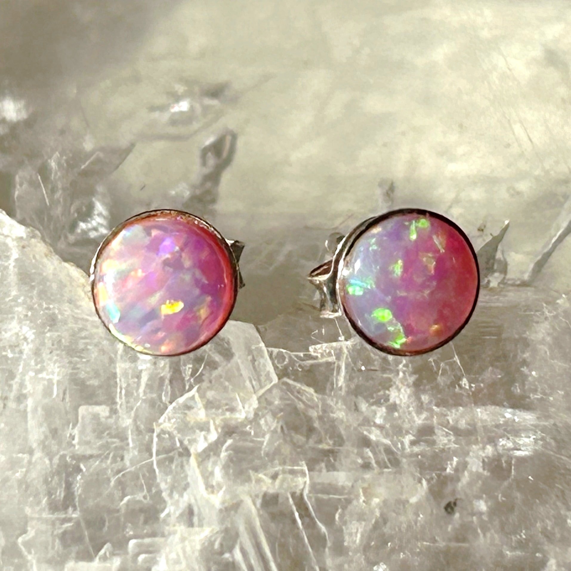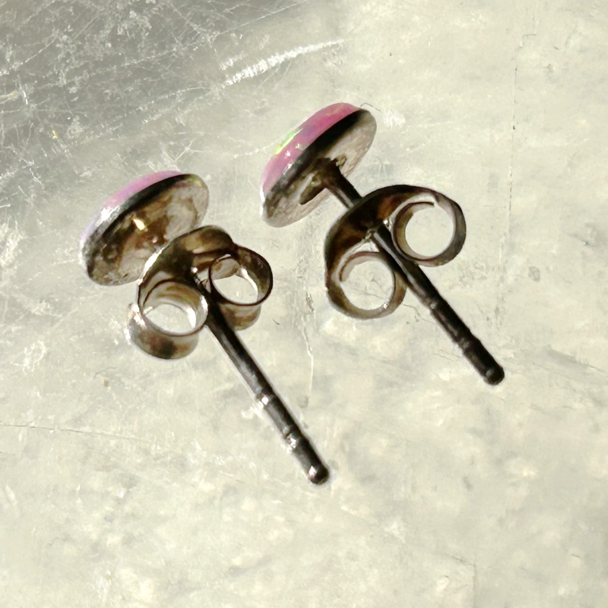 濃いピンクや水色の煌めき、それが動きとともにかすかに緑や黄色を感じさせたりして、様々な光の共演に目を奪われるオパールのピアスです。スイートでクール、情熱の中に鋭い冷気を放つようなドラマティックな美しさが小さな粒の中にあります。