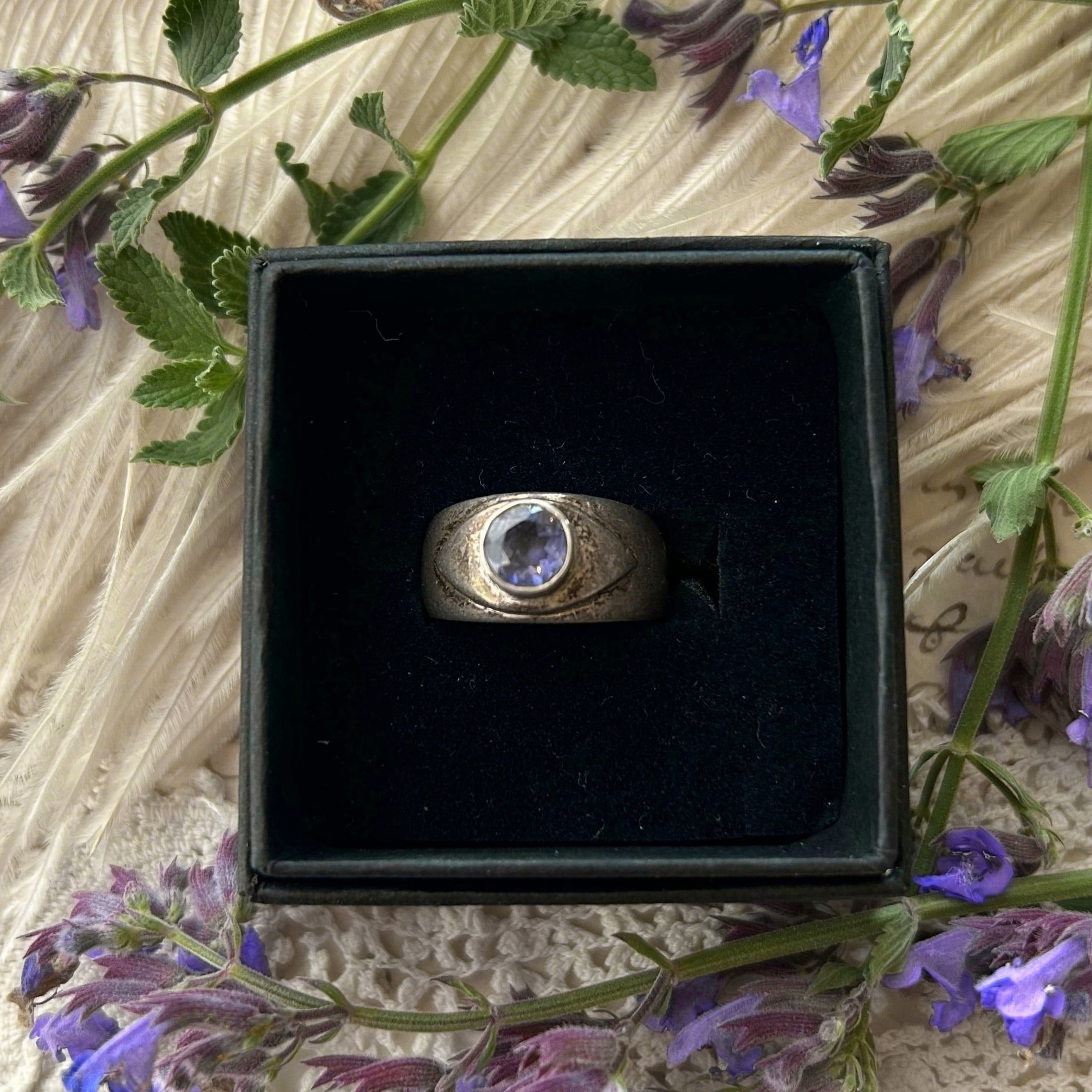 アメジストは邪気を払う石でもあります。石を納めた部分は上からみると目の意匠になっており、これは邪眼を跳ね返す力を持つ指輪なのかもしれません。人を見つめることで呪いをかけることを邪眼と言いますが、清浄な美しさの石と守護の力を感じさせるリングの取り合わせは、そのような邪悪な視線からもあなたを守ってくれることでしょう。
