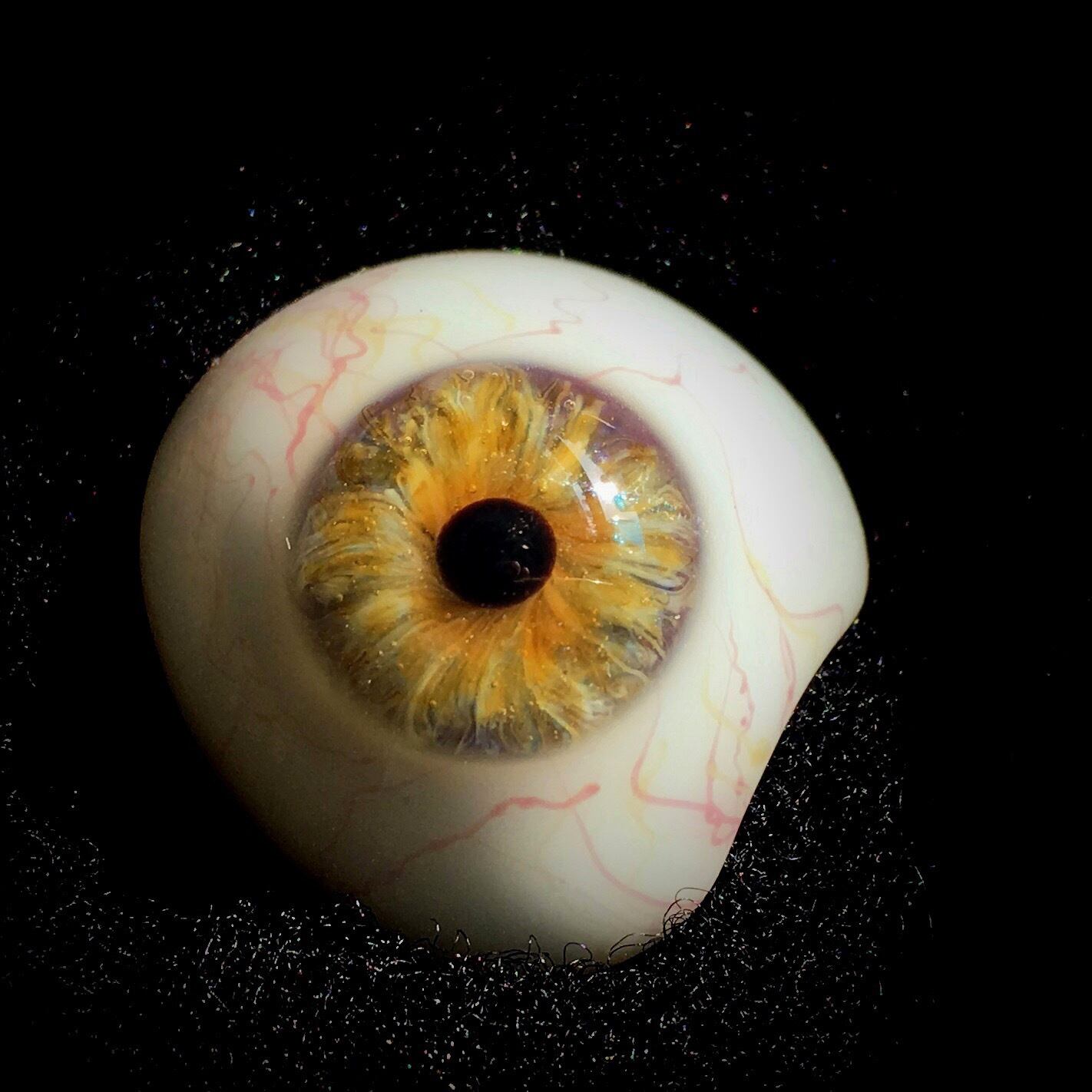 なんとも言えない複雑な色の義眼です。金色に葡萄色、グリーン、ブルー、薄紫などが混ざり、細かい気泡がキラキラ光っています。奥行きと透明感も素晴らしく、瞳の奥の奥の虹彩までよく見えます。ぜひ太陽光に翳してご覧下さい。