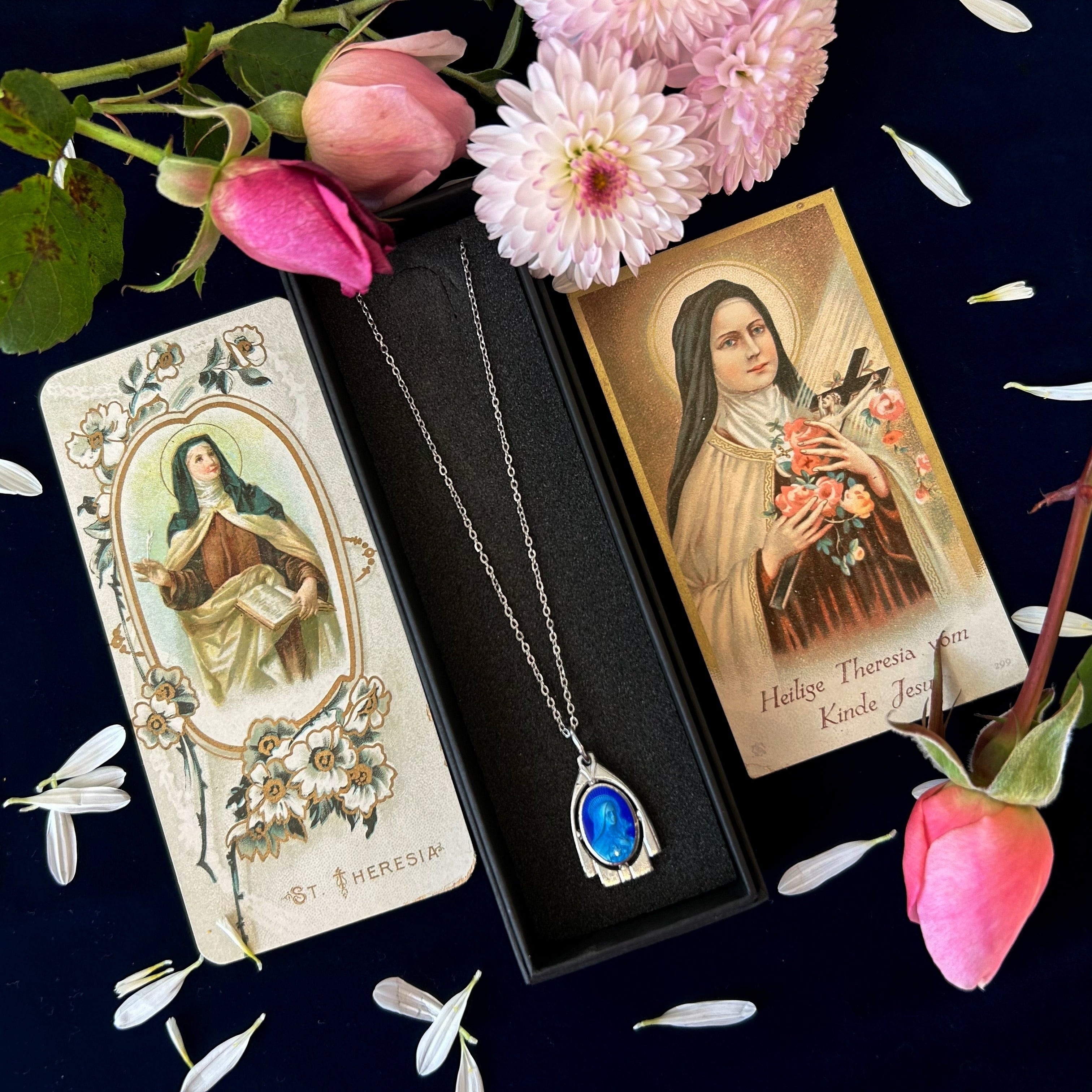 ご紹介したエピソードにより聖テレーズは薔薇と十字架を胸に抱いた姿で描かれることが多いのですが、こちらのメダイも青いエナメルの中にそのような彼女の姿が幻想的な浮き彫りになっています。裏にはリジューの聖堂がありますので、そちらにお参りをした記念に求められたものと思われます。