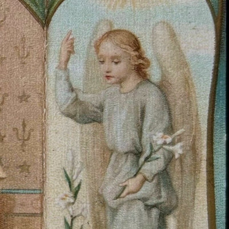 合わせたホーリーカードは扉付きの聖母子像のもので、左右の天使も手にしている百合の花はマリア様の花です。マリア様の心についてフランス語で書かれ、裏面には「マリア様の心は魂の避難所」との記述もあります。豊かな優しい雰囲気に溢れる素敵なホーリーカードです。