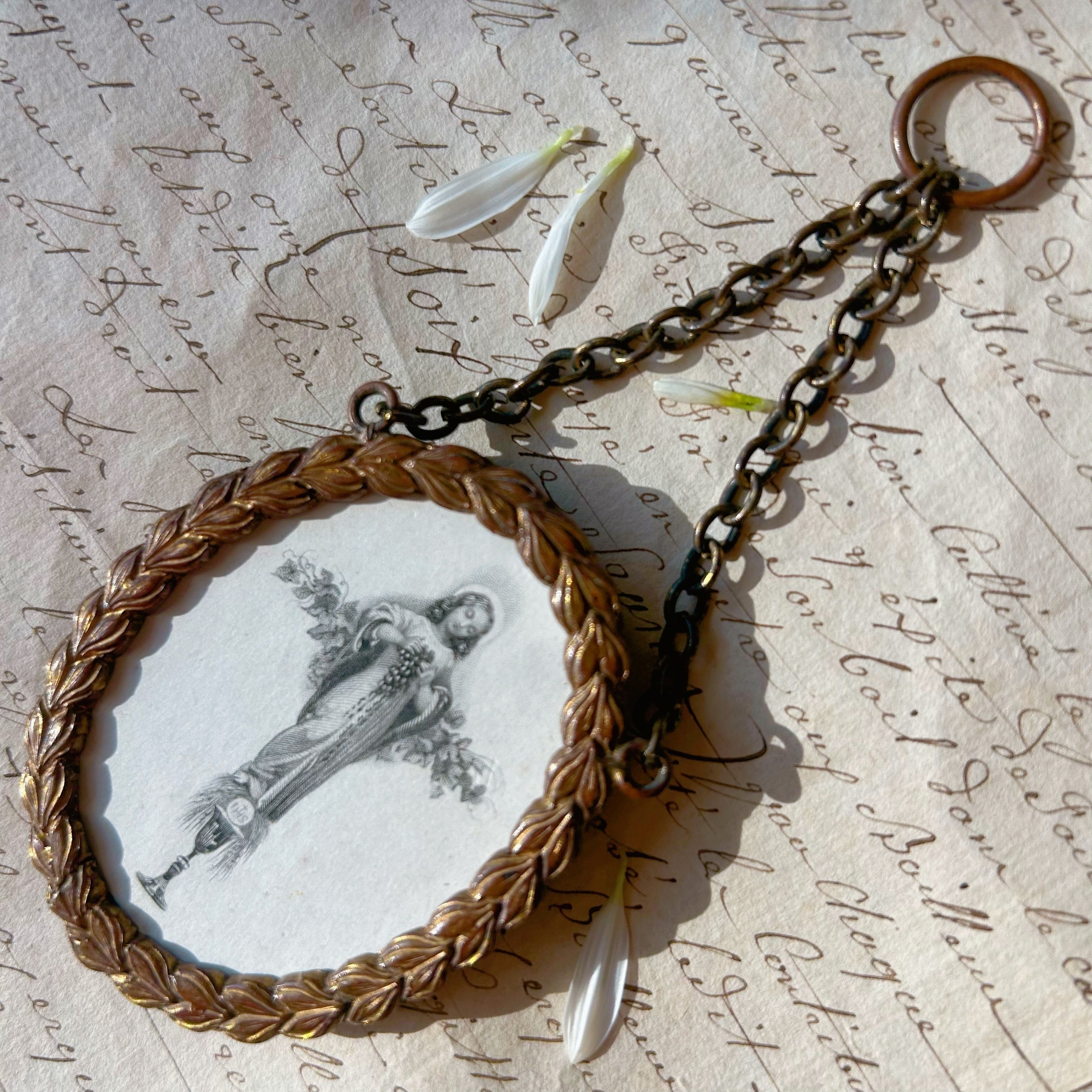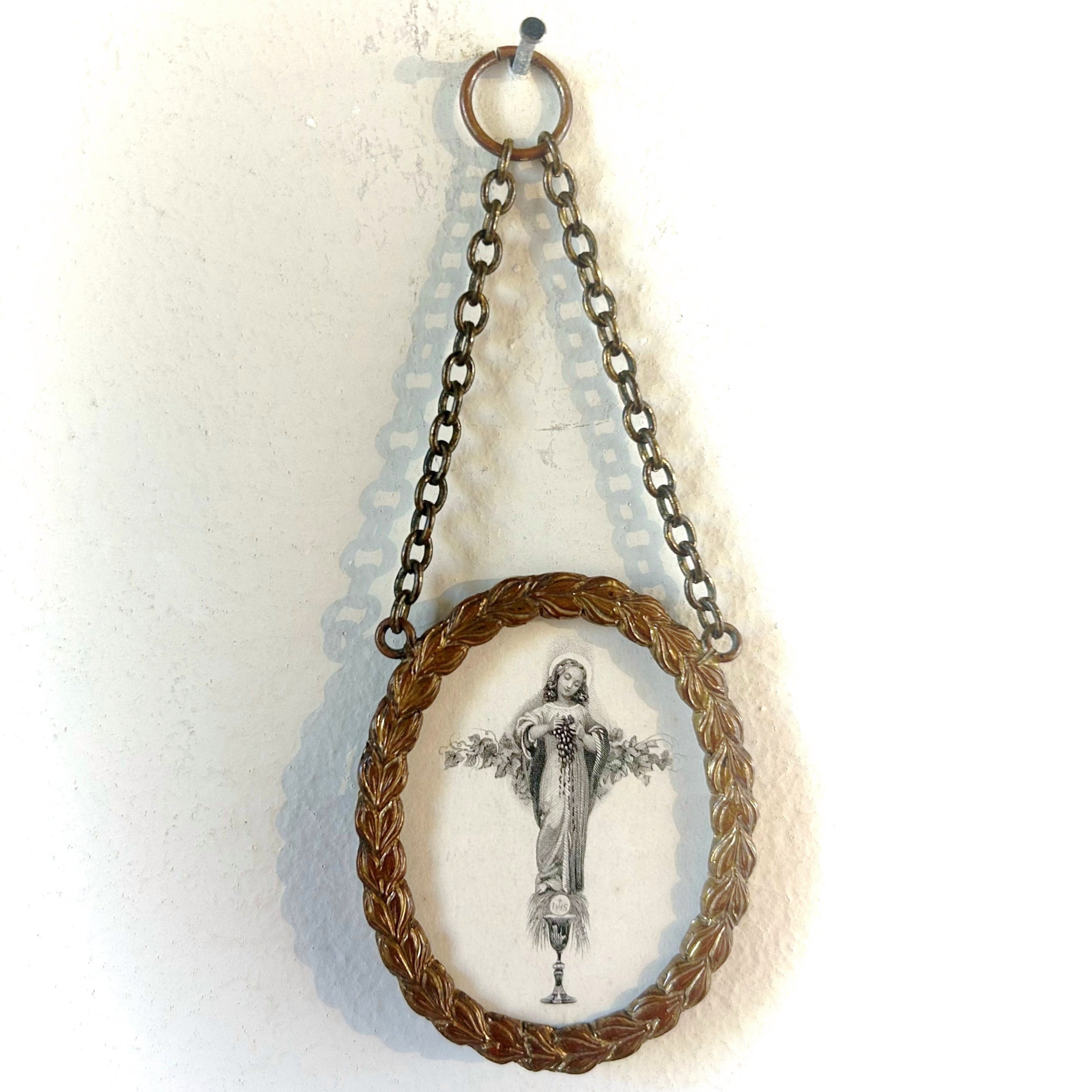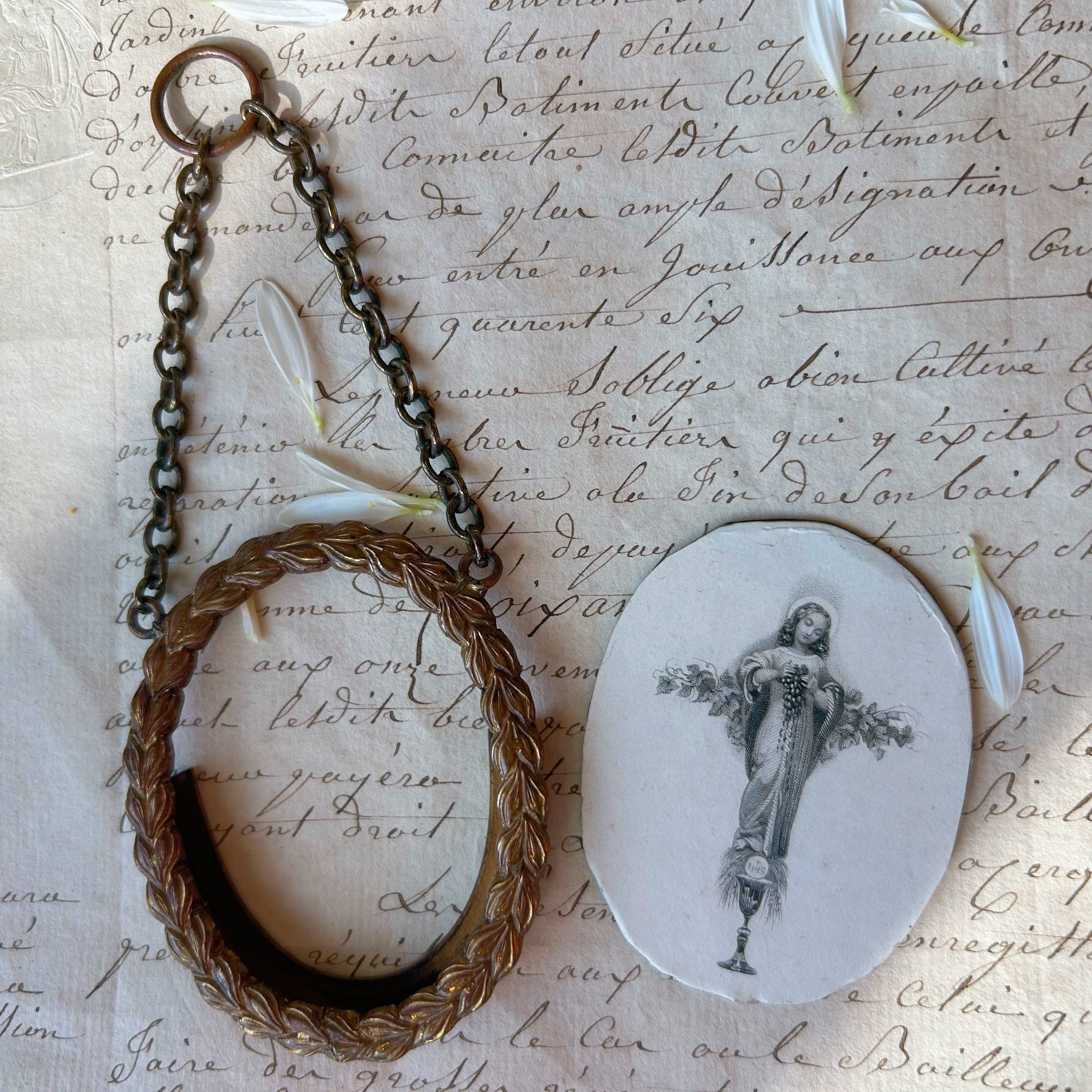 サンプルとして手持ちの図版を丸く切って入れて見ましたがいかがでしょうか。聖杯と幼子イエスが十字架のシルエットとなっている古いホーリーカードです。クリスマスのデコレーションにも良さそうですね。せっかくですからこのままお届けしますが、これはあくまでも見本ですから、どうぞお好きなものを入れ替えてフレームとのコラボレーションをごゆっくりとお楽しみください。