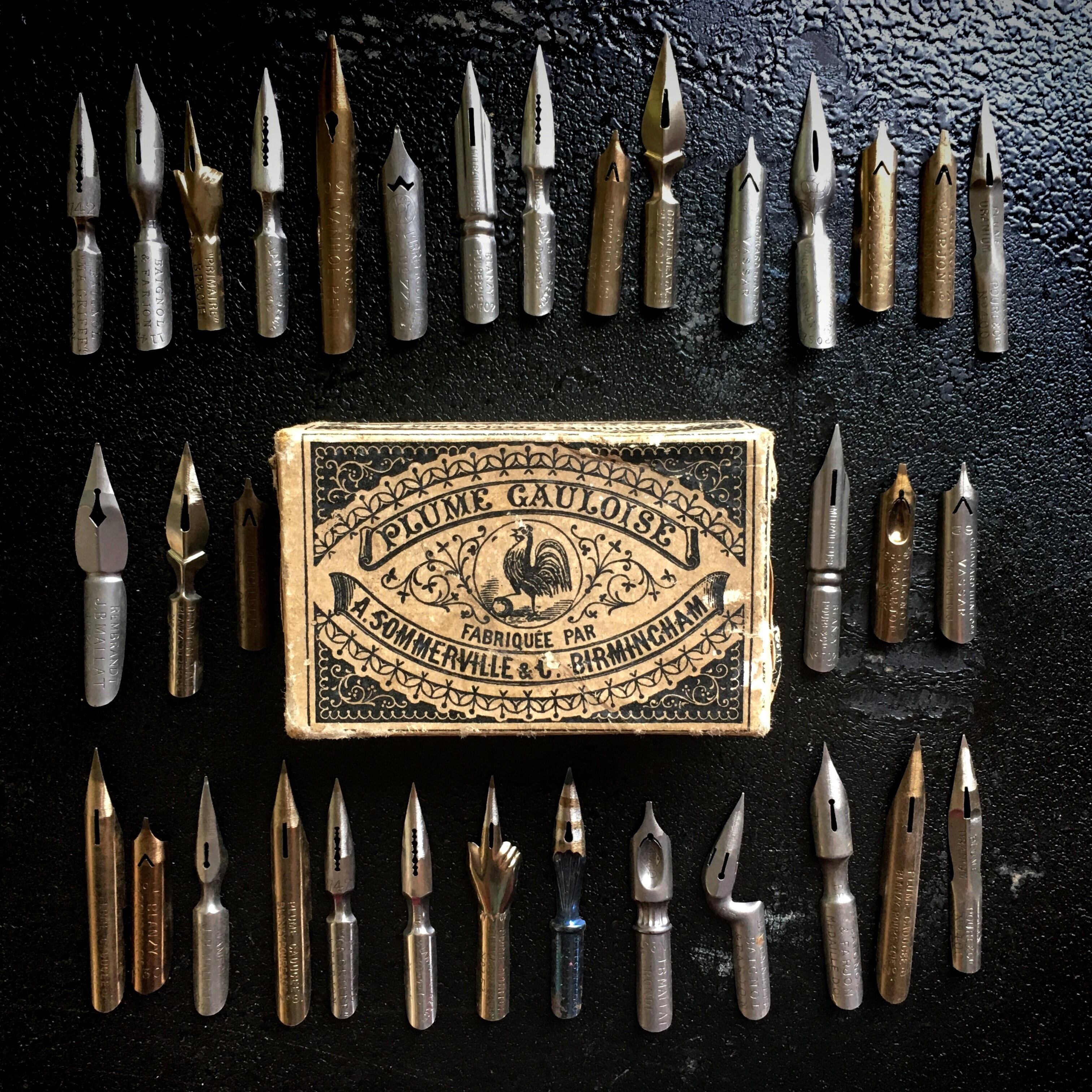 フランス製のペン先のセットです。様々なペン先が30本+α。物によりますが、日本に売ってる一般的なペン軸にも合います。ペン先の箱も同時代のものでエレガント。色々なペン先を付け替えて書き味を試してみて下さい。ペン先はほとんどデッドストックですが、中には使用感のあるものもございます。箱も古いものですので、傷みやよごれがございます。サイズは様々ですが、箱の縦横が約6.8×4.2センチですので目安にしてください。20世紀前半、フランス製です。