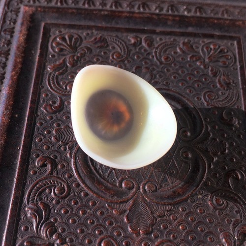 黒目から外へ次第に薄くなる鼈甲色、そのグラデーションに何とも言えない奥行きを感じます。そして、虹彩の外辺には青紫のリングが見えます。このお品は中が中空になっていないシングルの義眼ですので、裏からの光も入ります。透明度も高く、光に透かすとこれまでの義眼にはない景色を楽しめますが、普通に置いても裏からの光のせいか、濡れたようなとても瑞々しい印象があります。