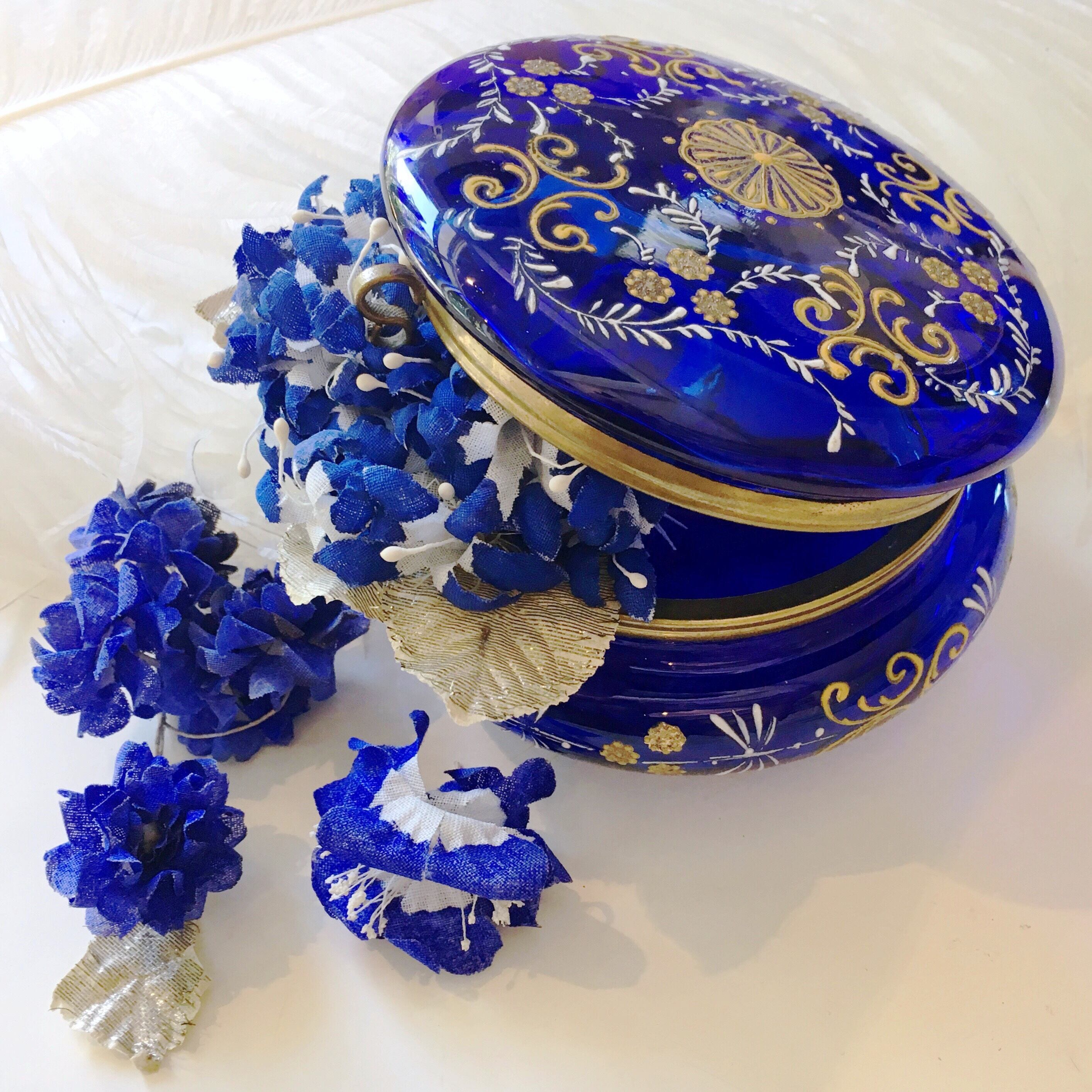 19世紀後半、ボヘミア(現在のチェコ付近)で製作された青いガラスのポットです。ガラスの色そのものも何とも言えない美しさですが、手書きの花柄も繊細で上品、塗料を盛り上げて描かれた質感も素晴らしく、光線の加減では濡れたような艶のある表情を見せます。