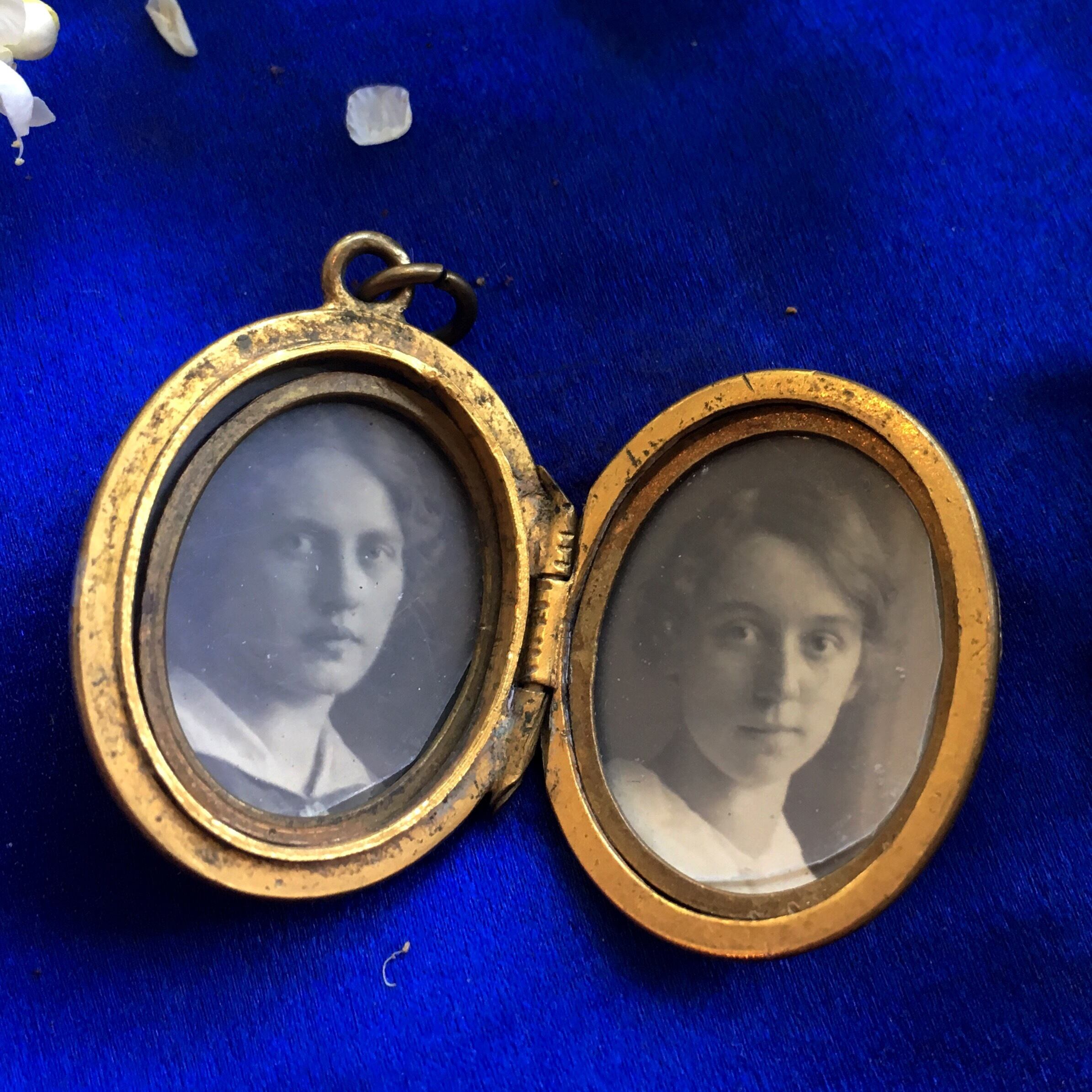 19世紀、英国のロケットペンダントヘッドです。表面に青いエナメルで模様が描かれ、裏にも模様が型押しされています。中を開けると、2人の写真が入っています。この方々の関係は不明です。向かって右は女性、向かって左は少し年上の女性のようにも、豊かな髪の男性のようにも見えます。雰囲気が似ているようにも見えますので、姉妹、兄妹、親子、友人、恋人、夫婦と想像は限りなく膨らみます。何れにしても、強い絆で結ばれた方々だったのでしょう。100年以上前にあった物語に想いを馳せながら、古いお品をひとつお手元に置かれてはいかがでしょうか。