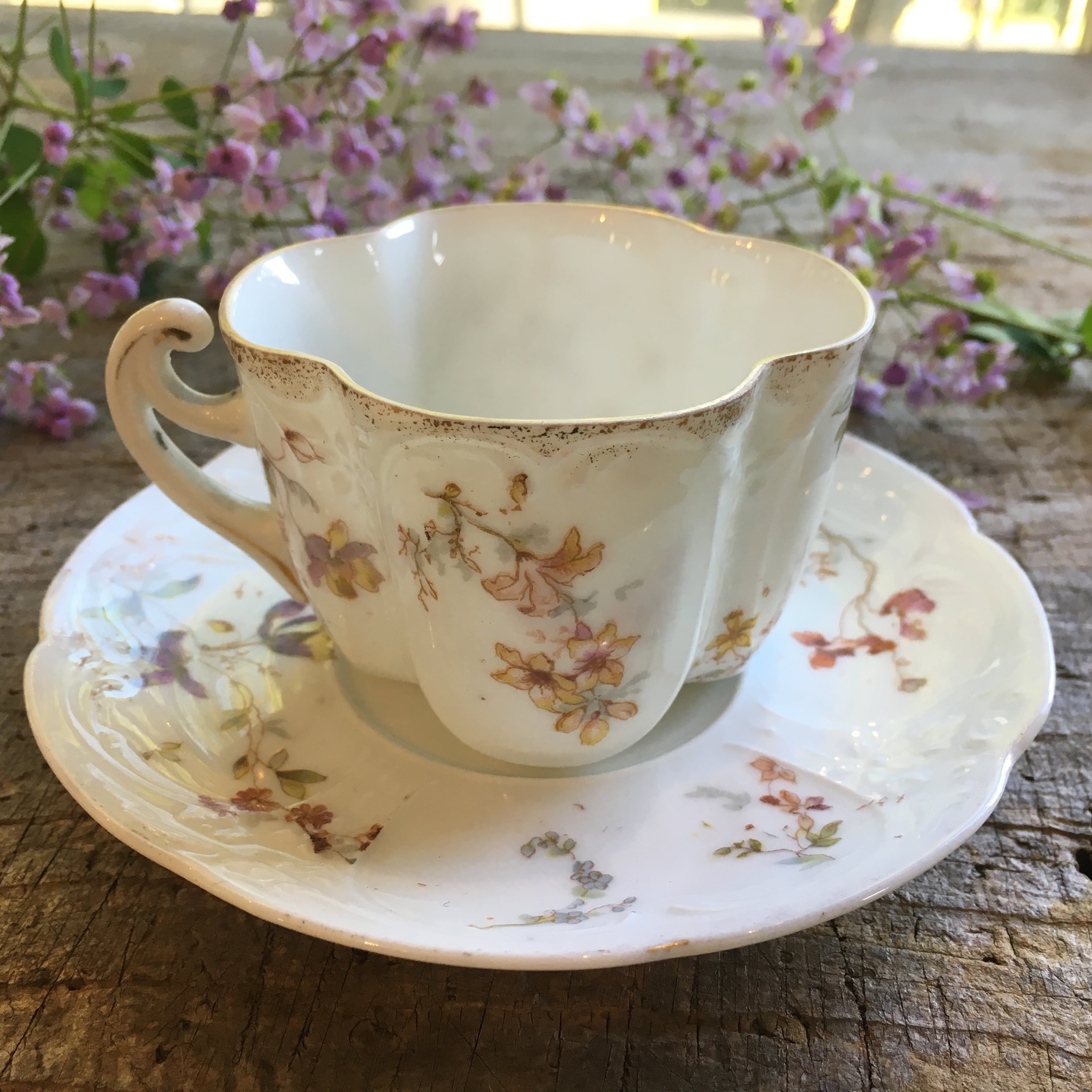 ドイツ、ローゼンタールの可憐でたおやかなティーカップです。四葉のクローバー型のユニークなフォルムのカップ&ソーサーは、光が透けるほどの薄い生地。カップの内側にまで実に華奢で繊細な小花が描かれています。1891年~1906年ドイツ製で、サイズはカップの直径が約7.5センチ、受け皿の直径が約13センチです。古いものですので、受け皿の高台に小さな欠け、全体に若干の擦れなどがありますが、それも風合いとご理解ください。