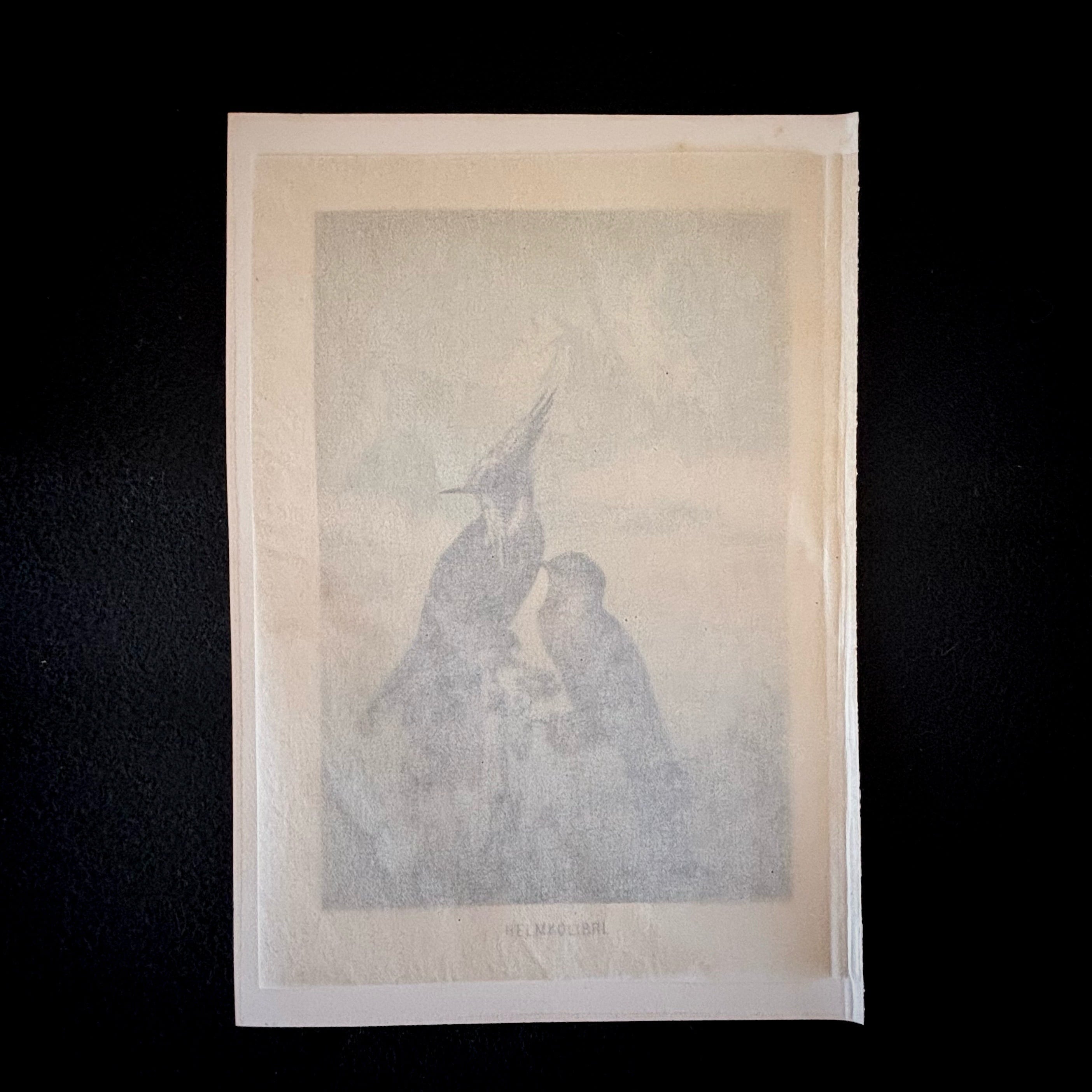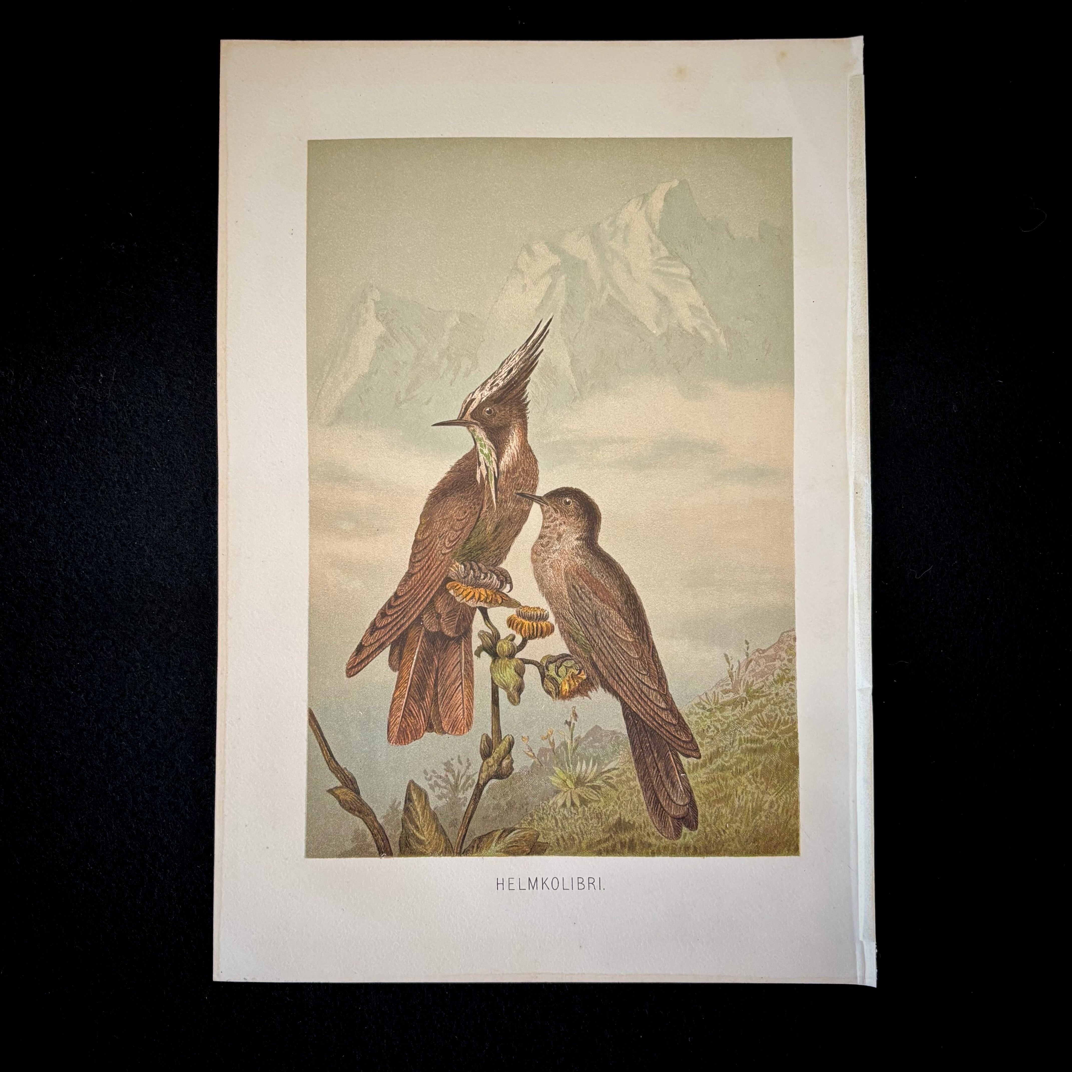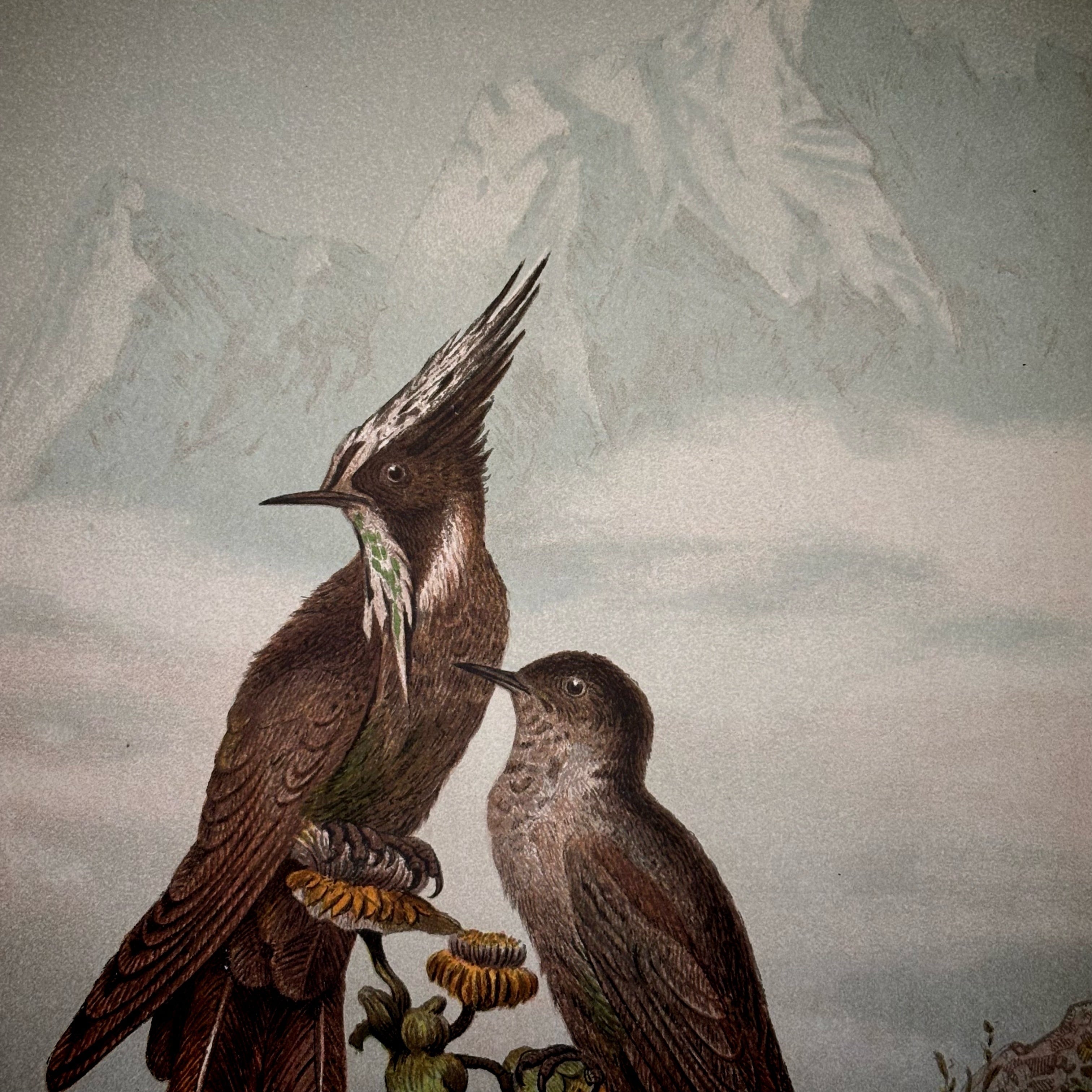 ヘルメットハチドリは南米コロンビアの高地に固有の種で、ヨーロッパだけでなく世界中でも大変珍しい鳥です。その生態が生き生きと描かれています。深く落ち着いたブラウンの色彩、羽毛の質感の繊細な描写、少し霞んだ周囲の植物、そして何と言っても背後に幻のように浮かぶ白い峰。コロンビア高地の幻想的な魅力を、希少な鳥とともに余すところなく表現しています。この夢幻の世界は、絵画的な表現を得意とする色彩リトグラフの中でも特筆すべき一枚です。