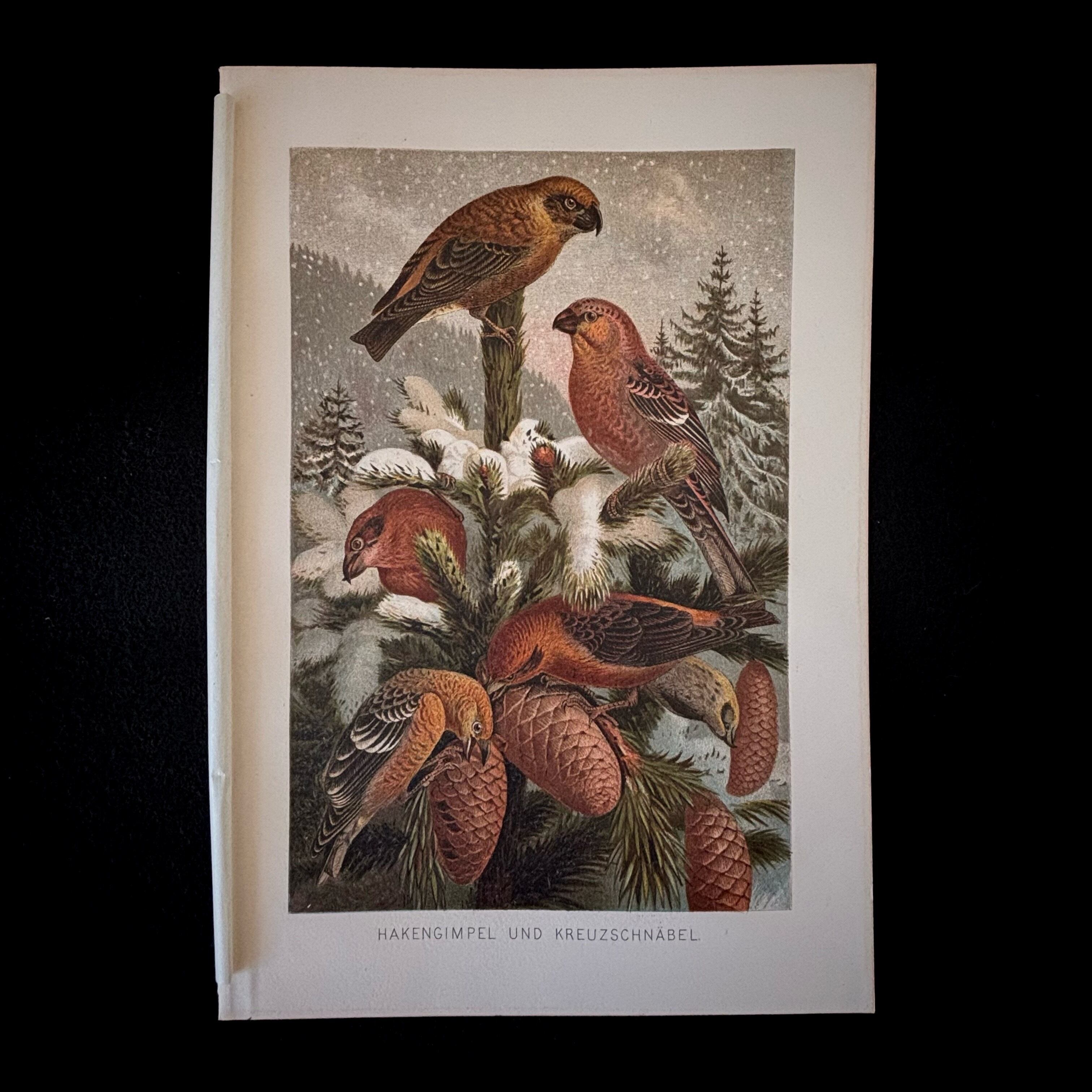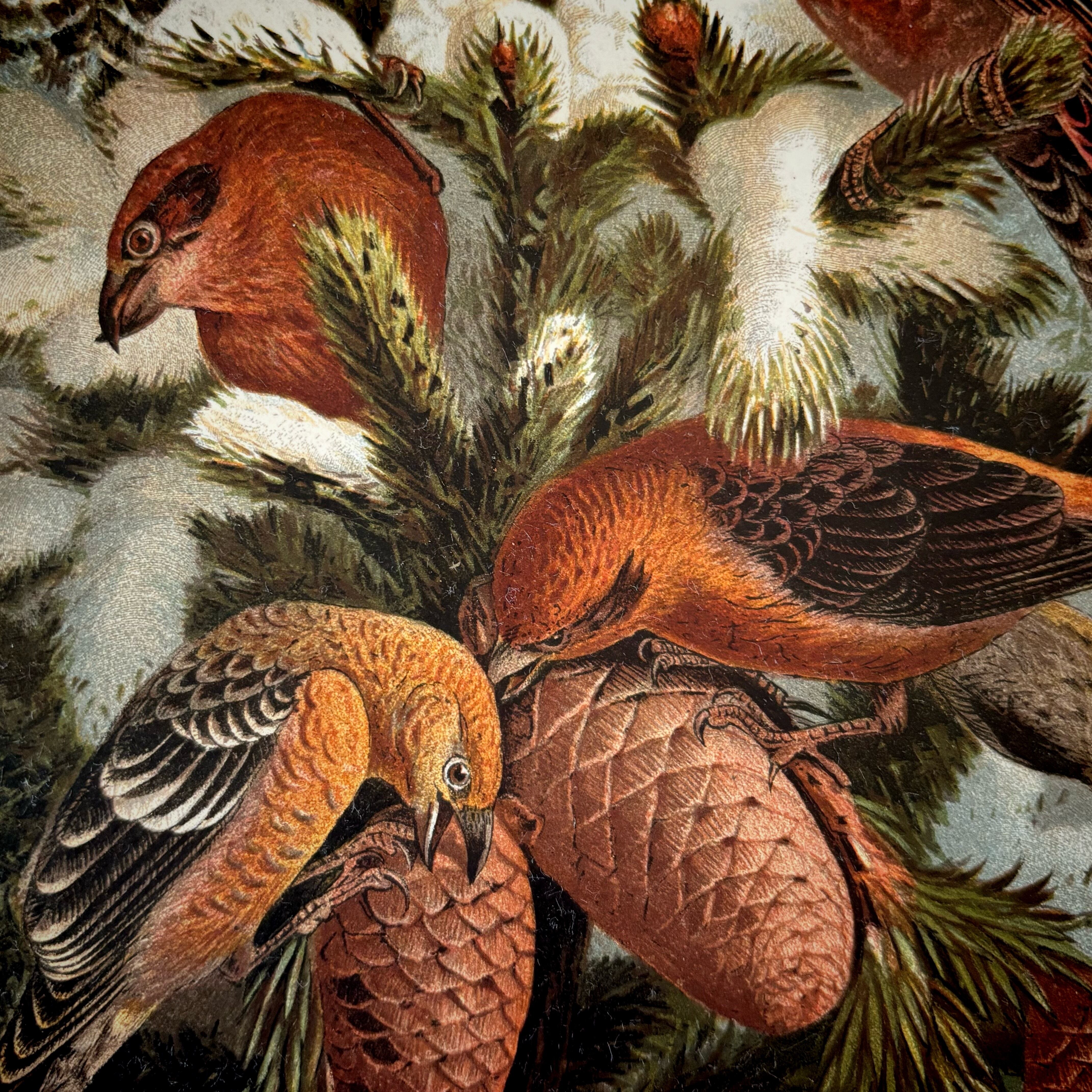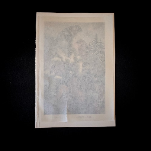 マツノキヒワは主に北米大陸に生息し、ヨーロッパでは珍しい鳥です。実際に松の種子を好み、その生態が生き生きと描かれています。落ち着いたブラウンの色彩、羽毛の質感の繊細な描写は、絵画的な表現を得意とする色彩リトグラフの魅力に溢れています。カラー写真も動画もない時代に、森羅万象を記録し世界のカタログを作ろうとした博物学の熱気が伝わってくる一枚です。