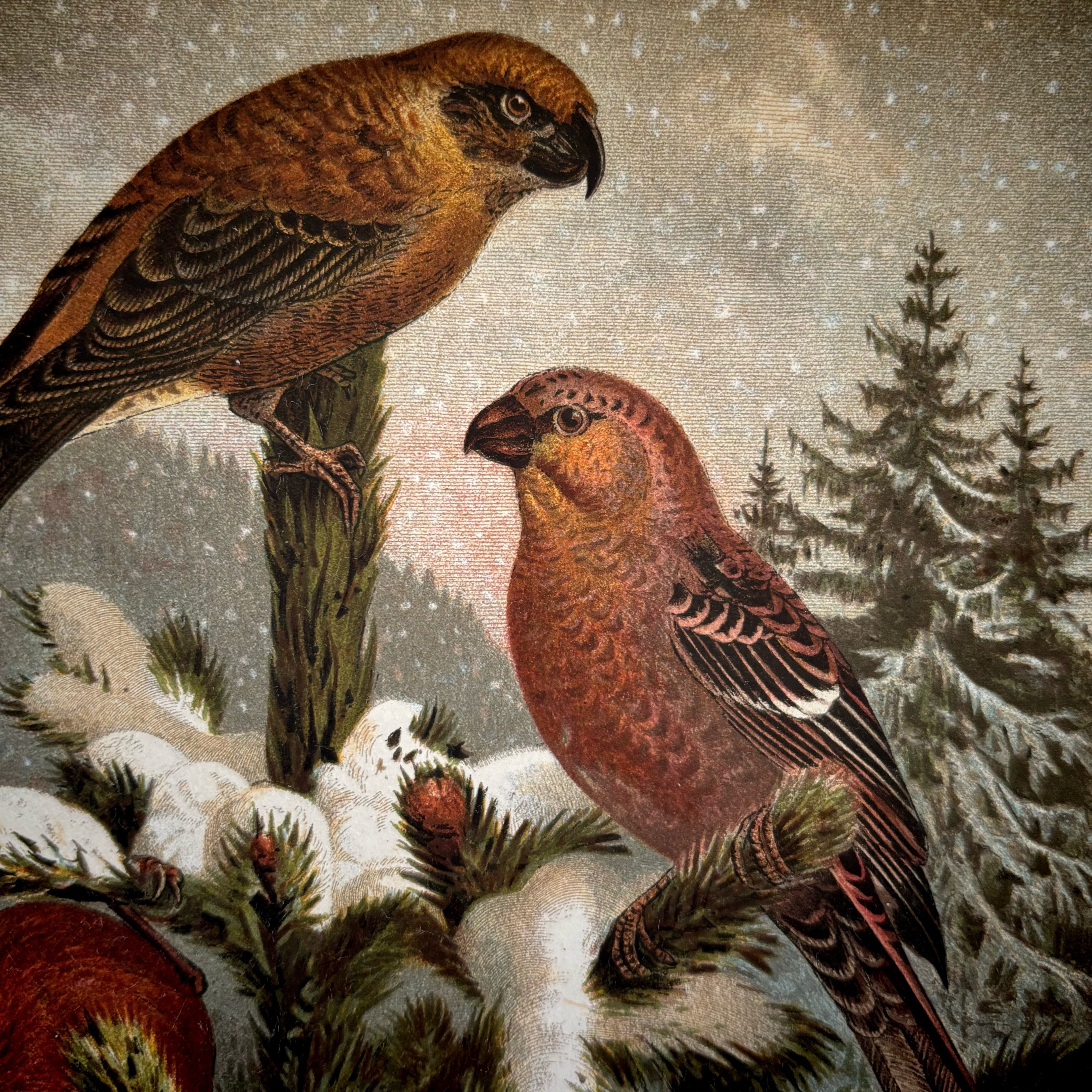 雪の降る森林地帯を舞台にしたことで、北米大陸の雰囲気も良く伝わり、リトグラフ製作者のセンスと力量が偲ばれる素晴らしい博物図版です。芸術作品とは違い、ユニークで知的な魅力を持つ博物画をお部屋に飾ってみてはいかがでしょうか。