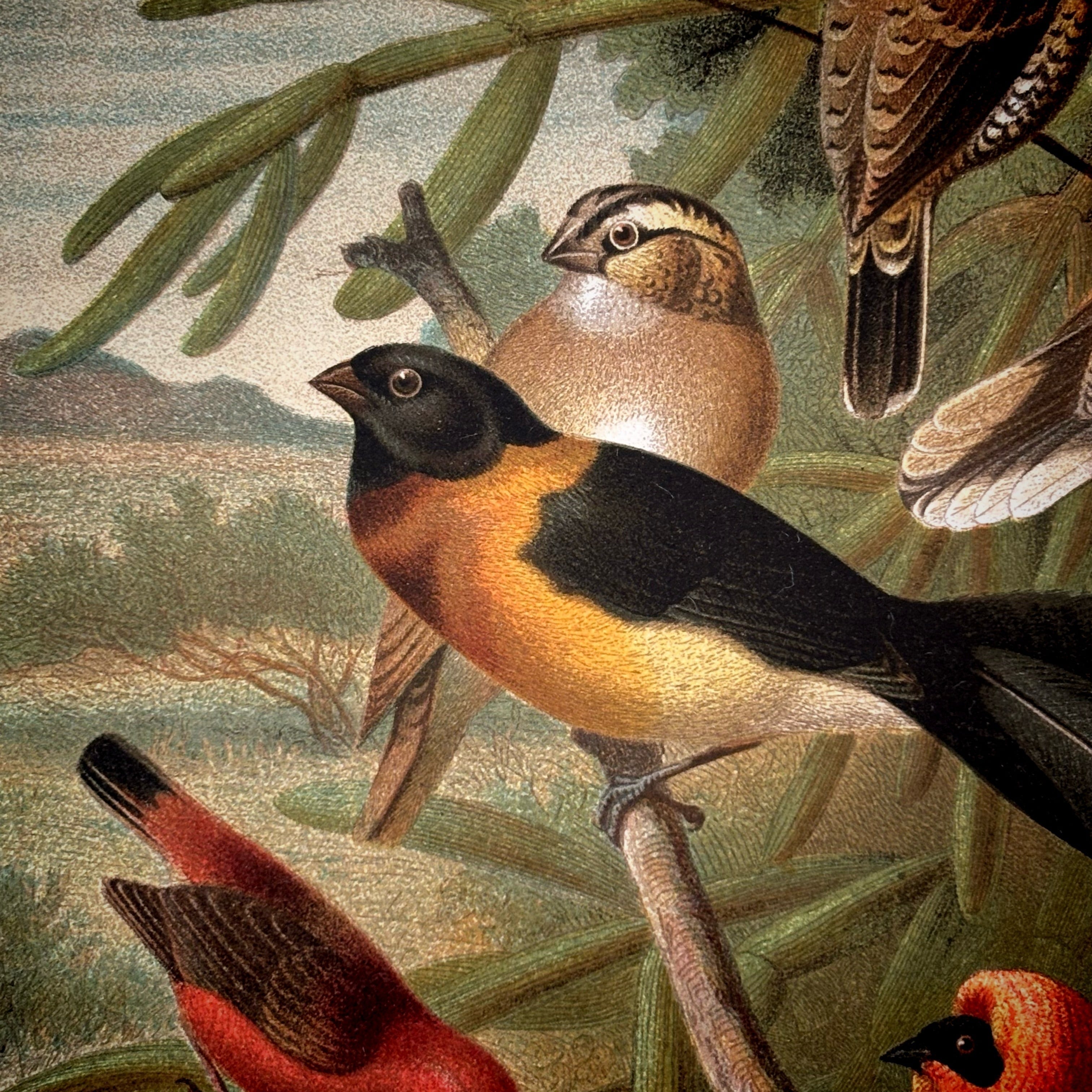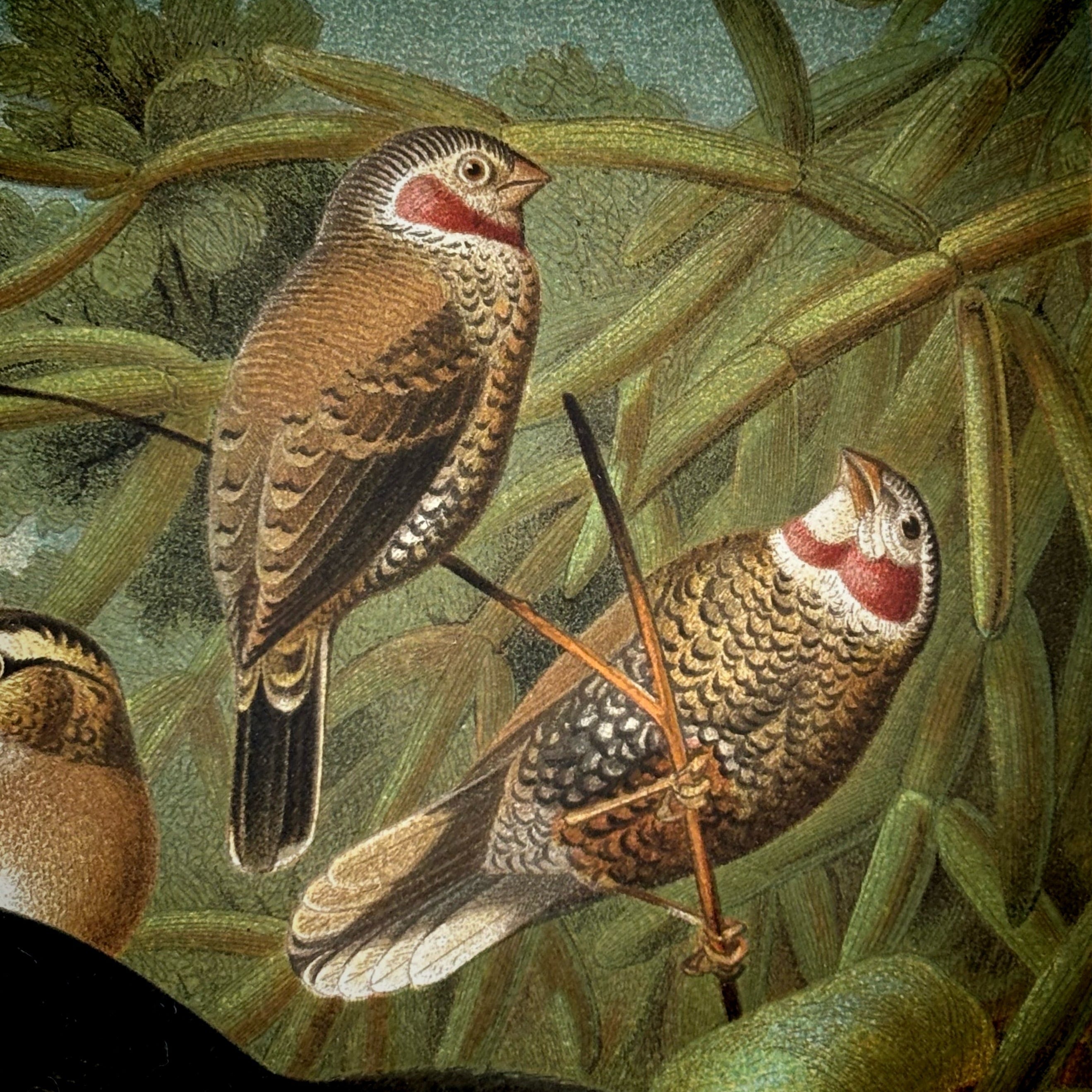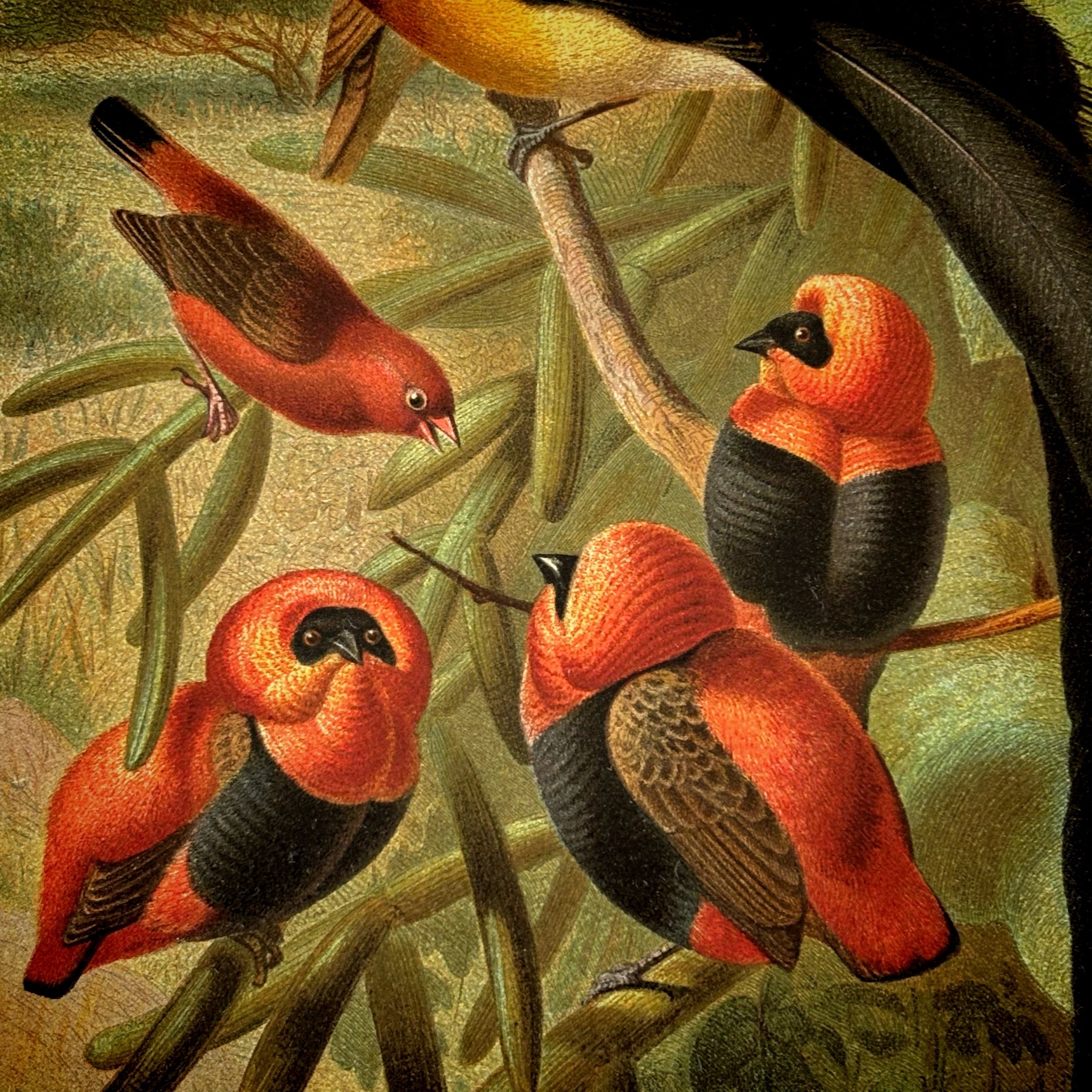 カラー写真などなかった時代に、羽毛の質感や色彩、眼差しに宿る生命の光、鳴き声が聞こえてきそうな豊かな表情や躍動感に満ちた姿に至るまで、色彩リトグラフで見事に表現しています。これは、生物の観察に精魂を傾けた当時の動物学者と優れた技能を持ったリトグラフ製作者が力を合わせて創り上げたもので、まさにこの時代が生んだ傑作と言うことができるでしょう。