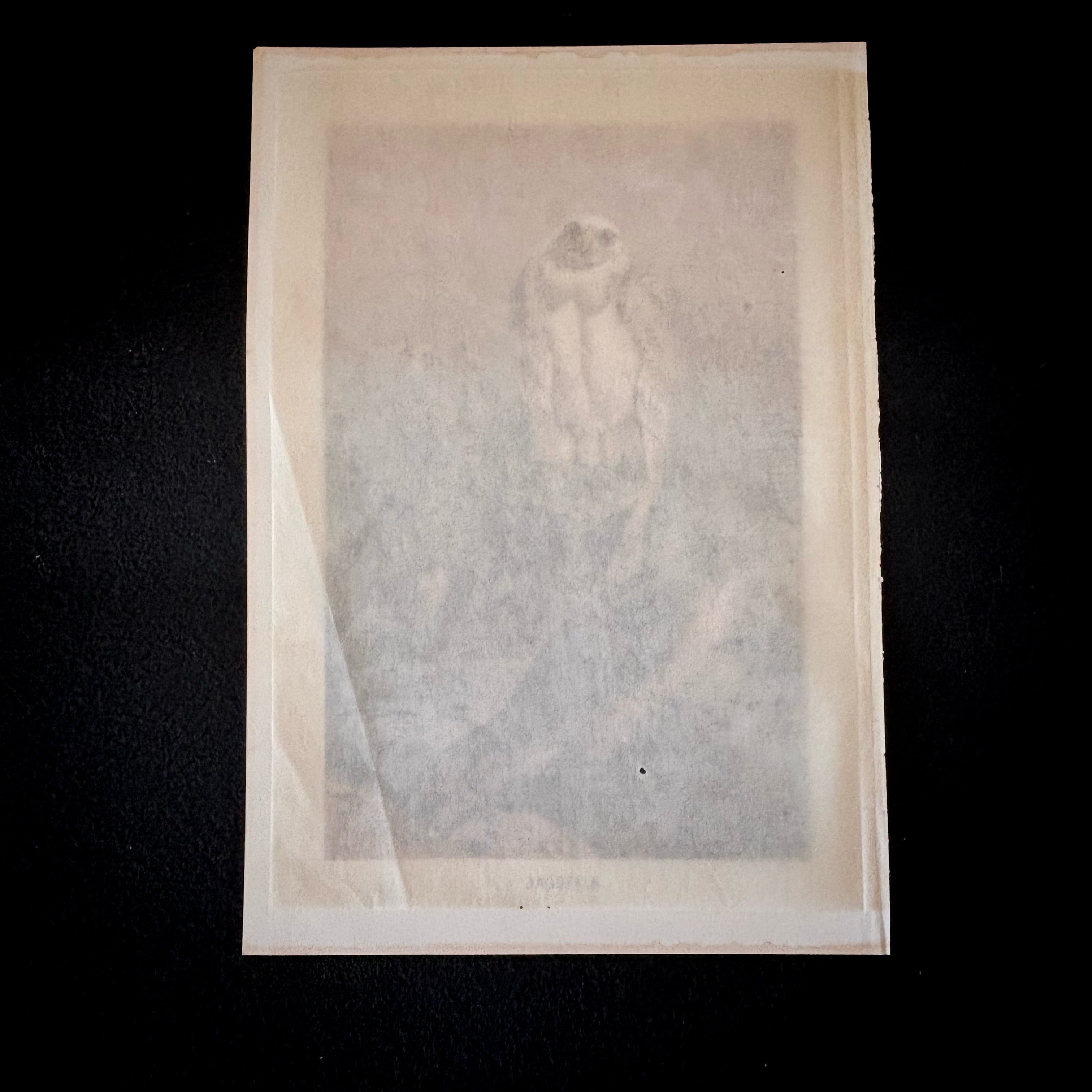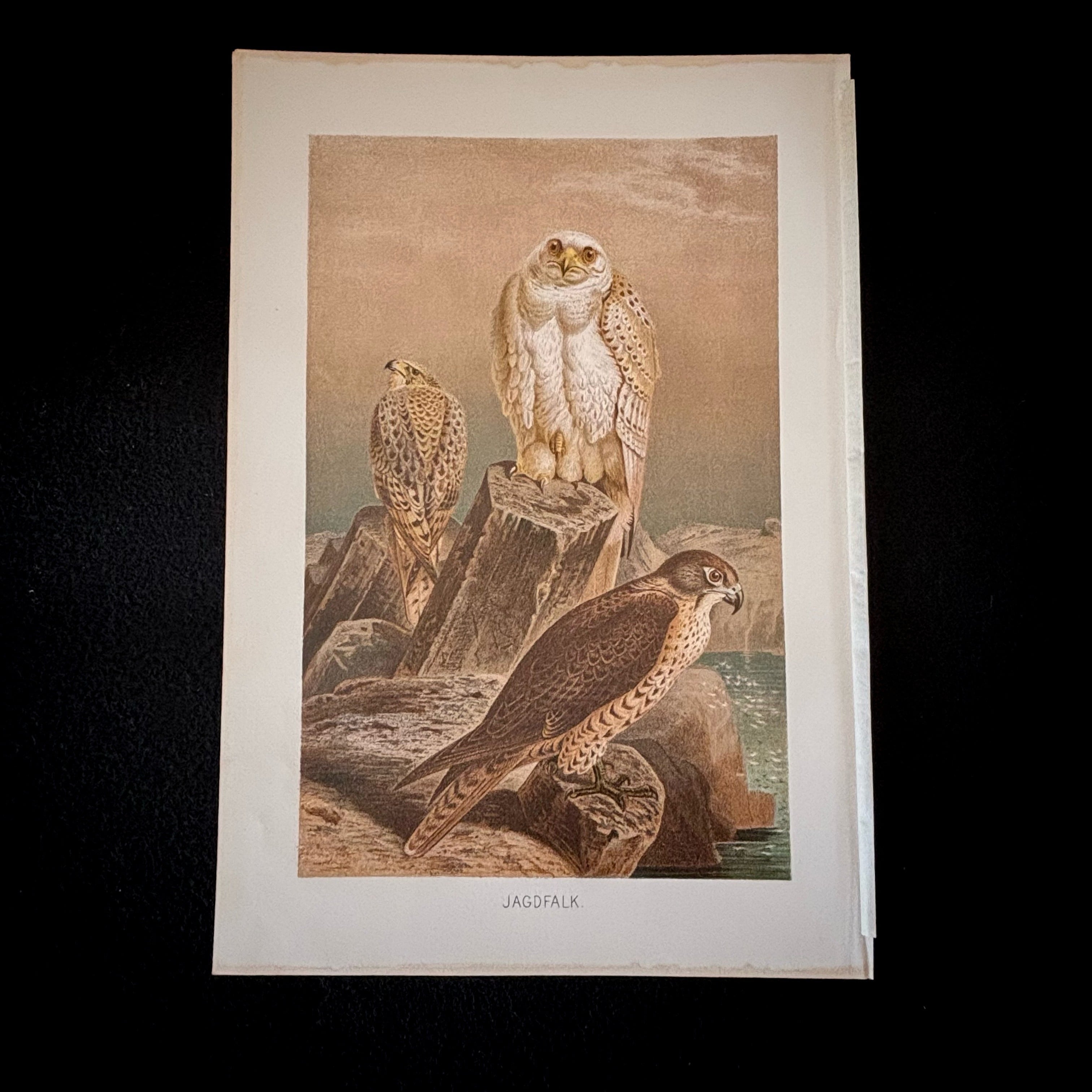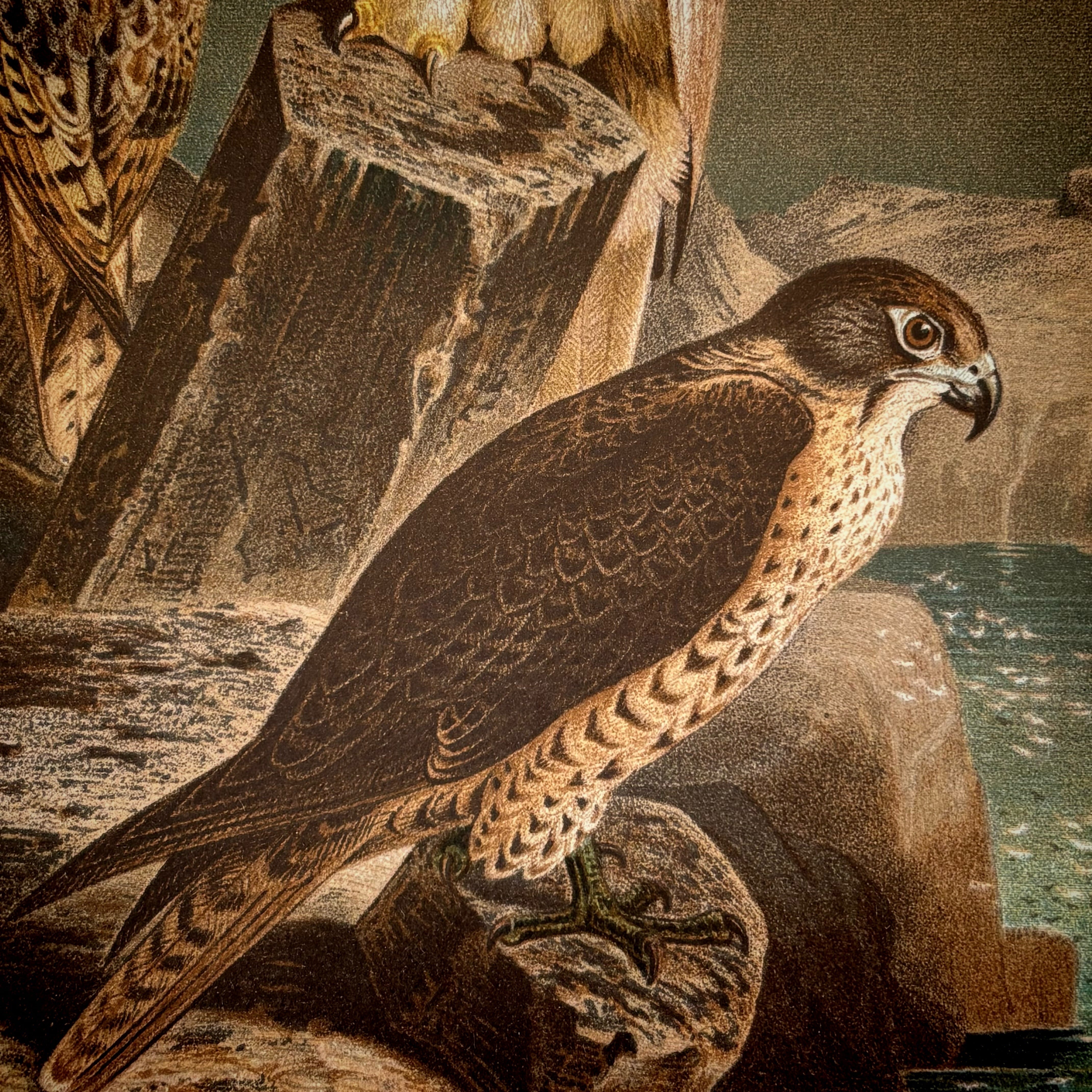それにしても、なぜこの色彩リトグラフの描写はこんなにも生き生きと繊細で、豊かな雰囲気に溢れているのでしょう。この図版は、19世紀、ドイツの著名な動物学者Alfred Edmund Brehmの著作"Tierleben"「動物の生活」の挿絵なのです。研究者の精緻なスケッチを元にして、まるで点描画を思わせる深みのあるタッチと光沢を抑えた色彩が羽毛の質感から眼差しに宿る光まで見事に表現しています。それだけでなく、空の淡い光の美しいグラデーション、岩肌の巧みな陰影が生む立体感など、リトグラフ製作者の力量が偲ばれる、どれひとつをとっても目を奪われる素晴らしい博物図版です。