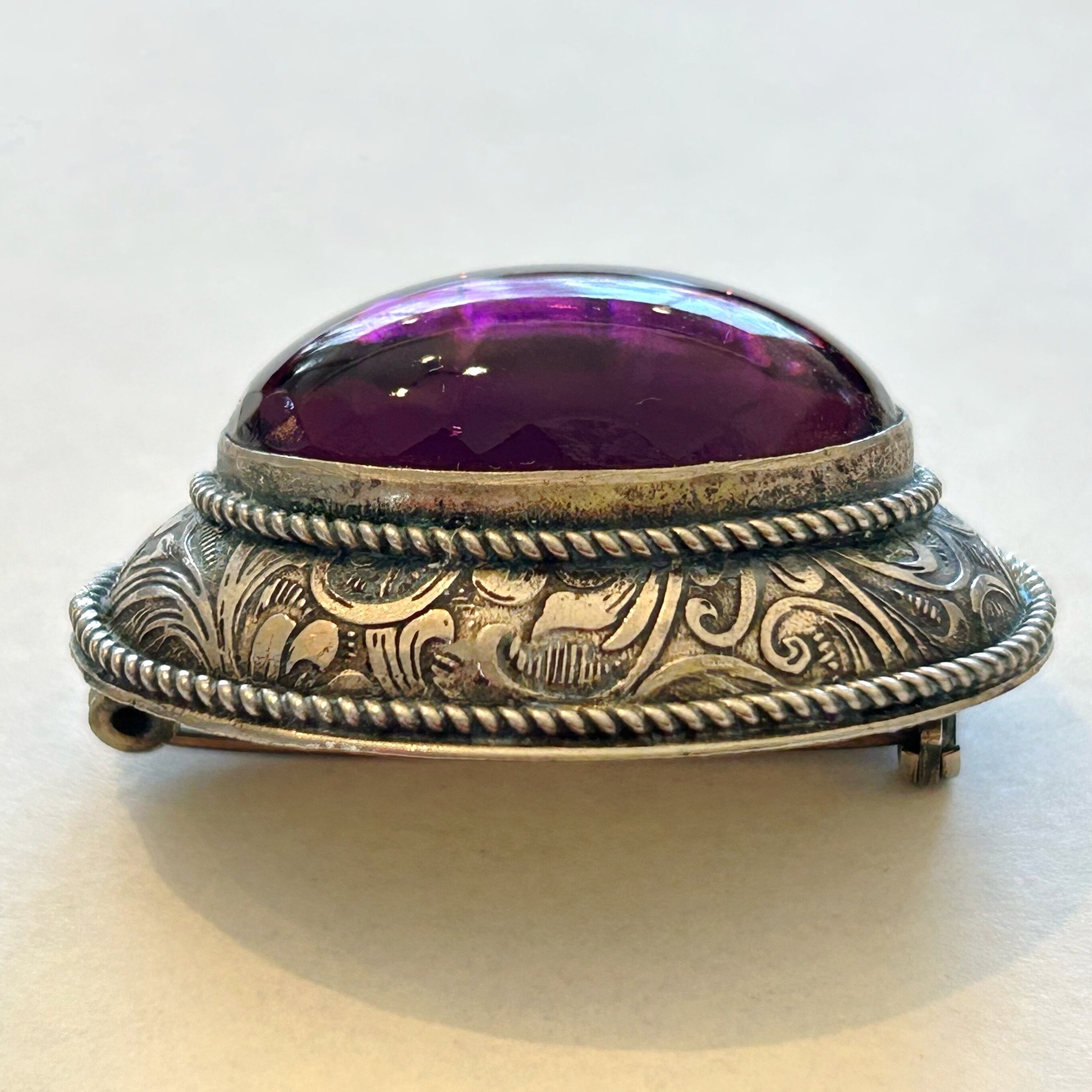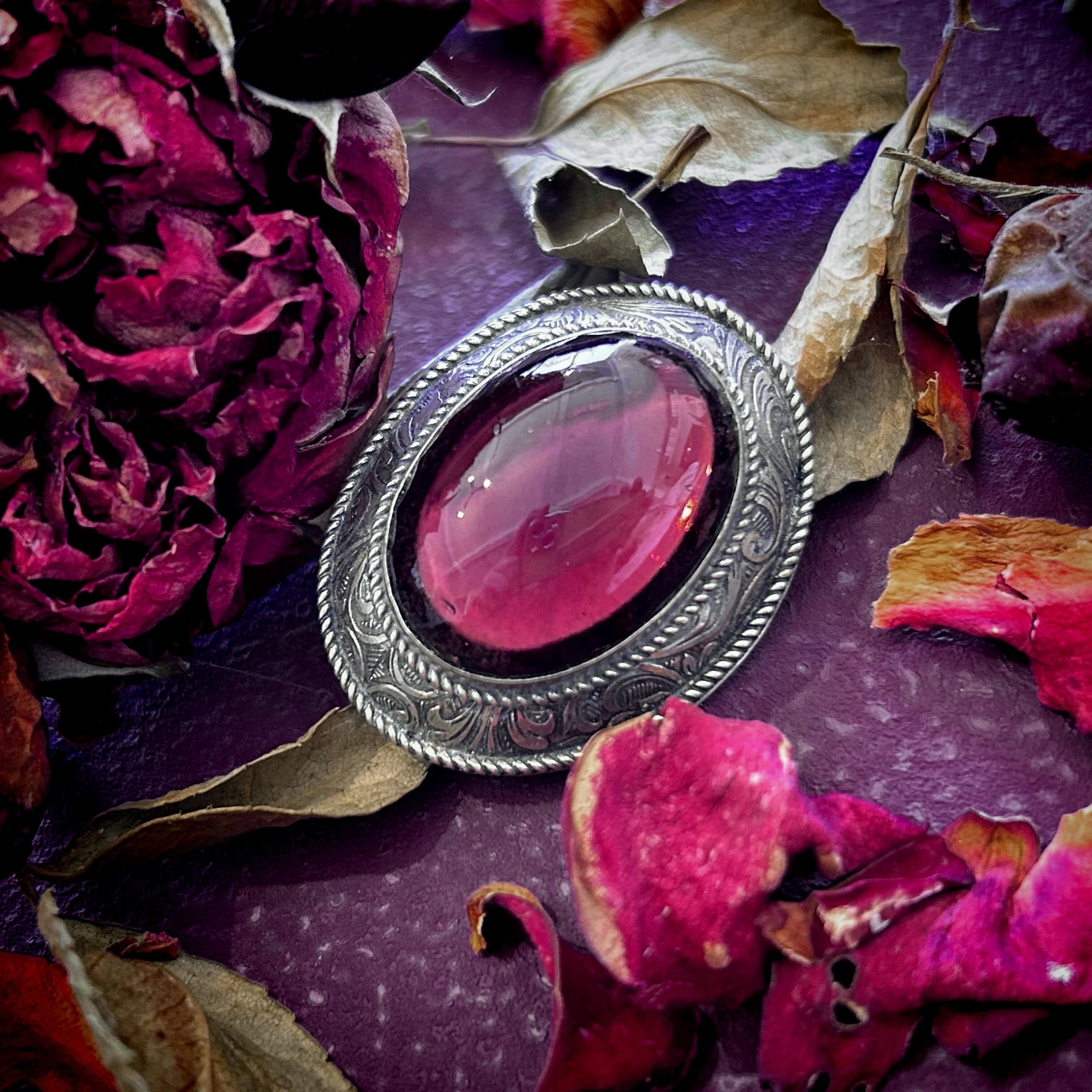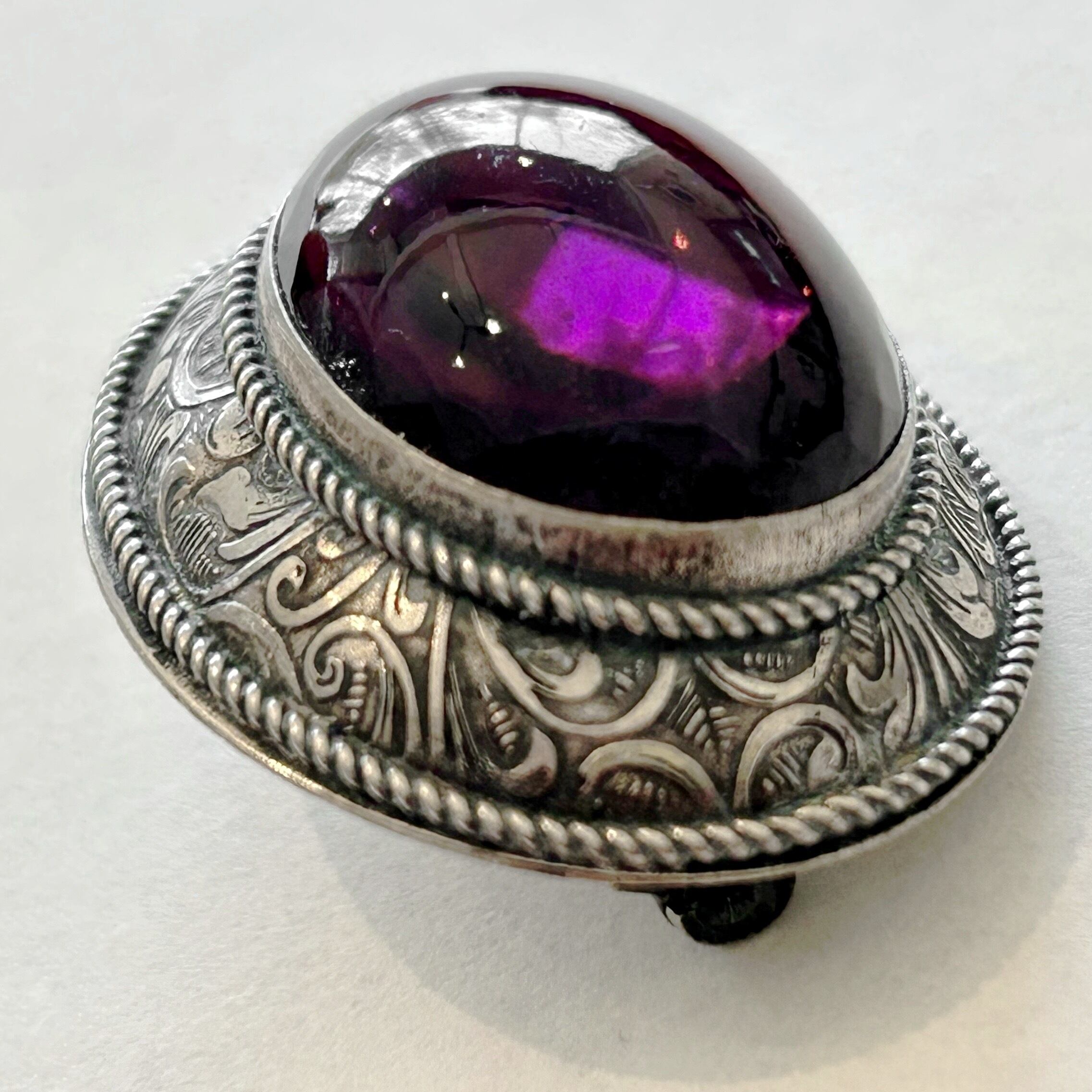 綺麗なカボションカットのペーストガラスは大粒で透明度が高く、実際のサイズ以上にはるかな深みを感じさせます。ペーストガラスは19世紀に技術のピークを迎えて高貴な人々のドレスを飾り、20世紀に入って優れたデザインのジュエリーに多用されました。