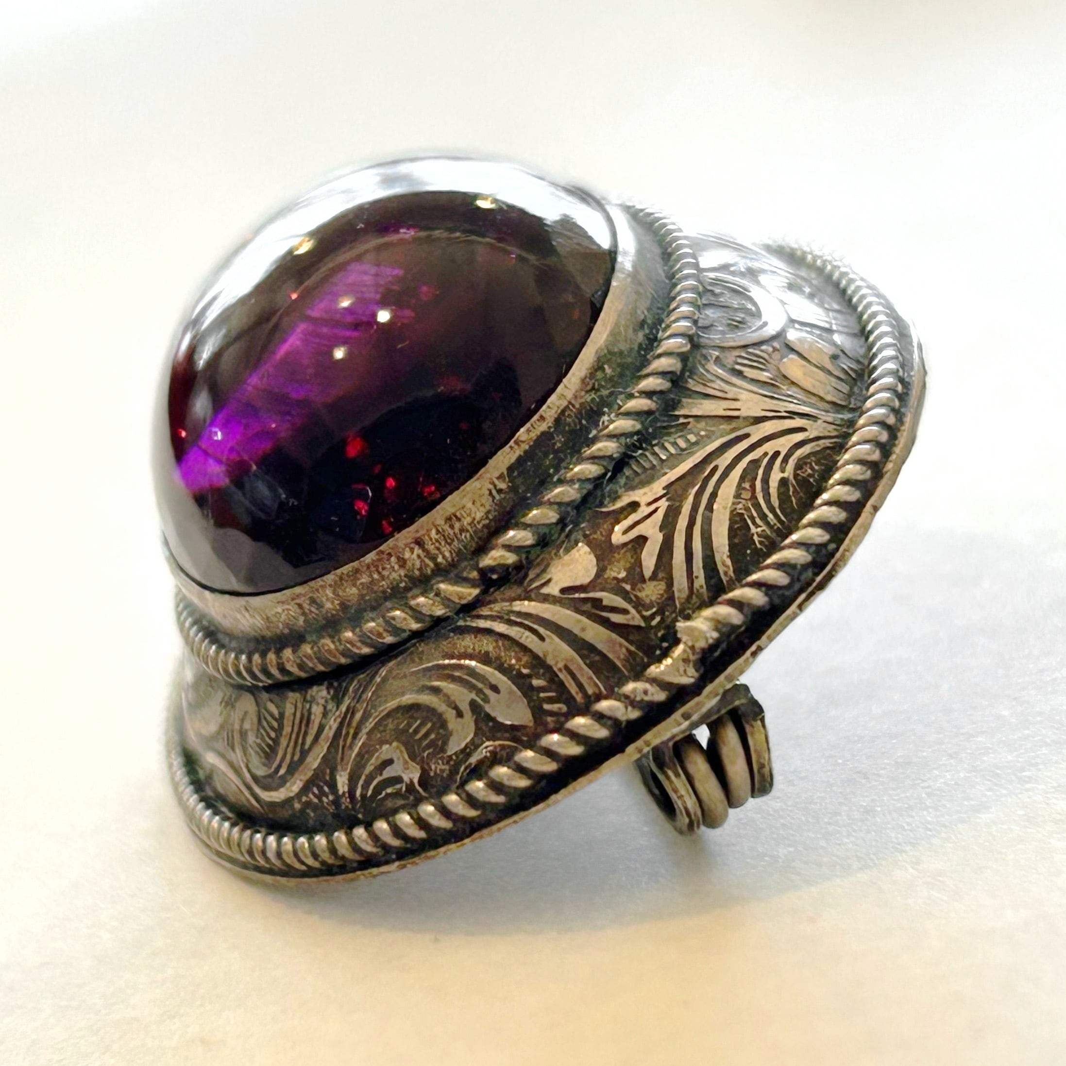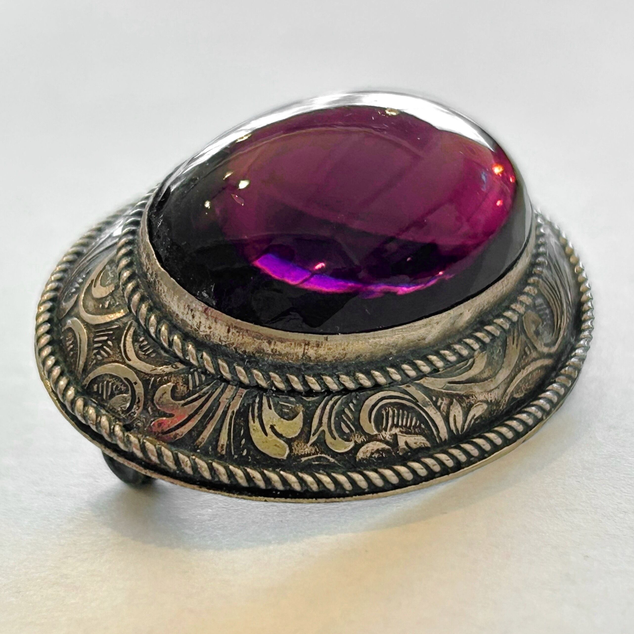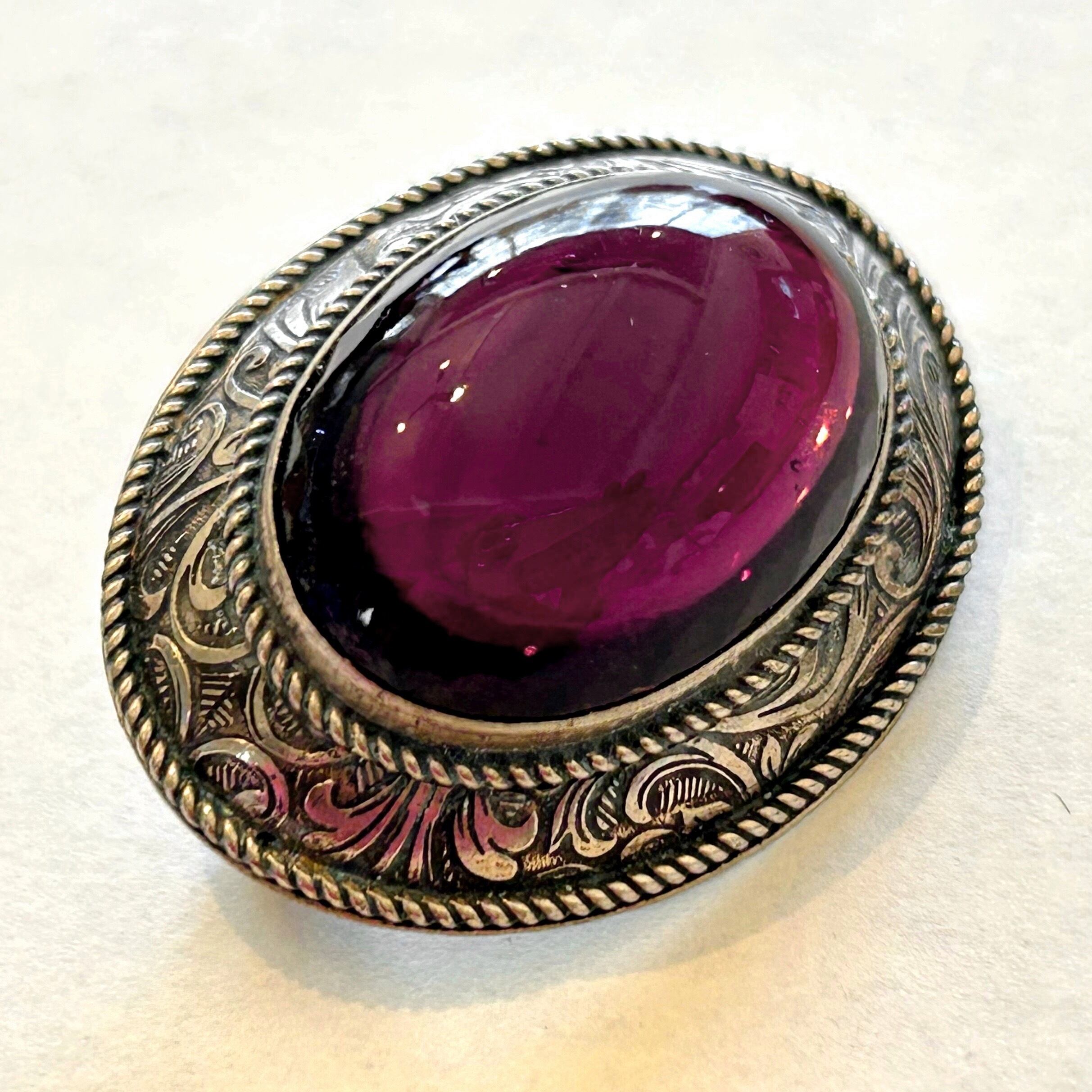 綺麗なカボションカットのペーストガラスは大粒で透明度が高く、実際のサイズ以上にはるかな深みを感じさせます。ペーストガラスは19世紀に技術のピークを迎えて高貴な人々のドレスを飾り、20世紀に入って優れたデザインのジュエリーに多用されました。