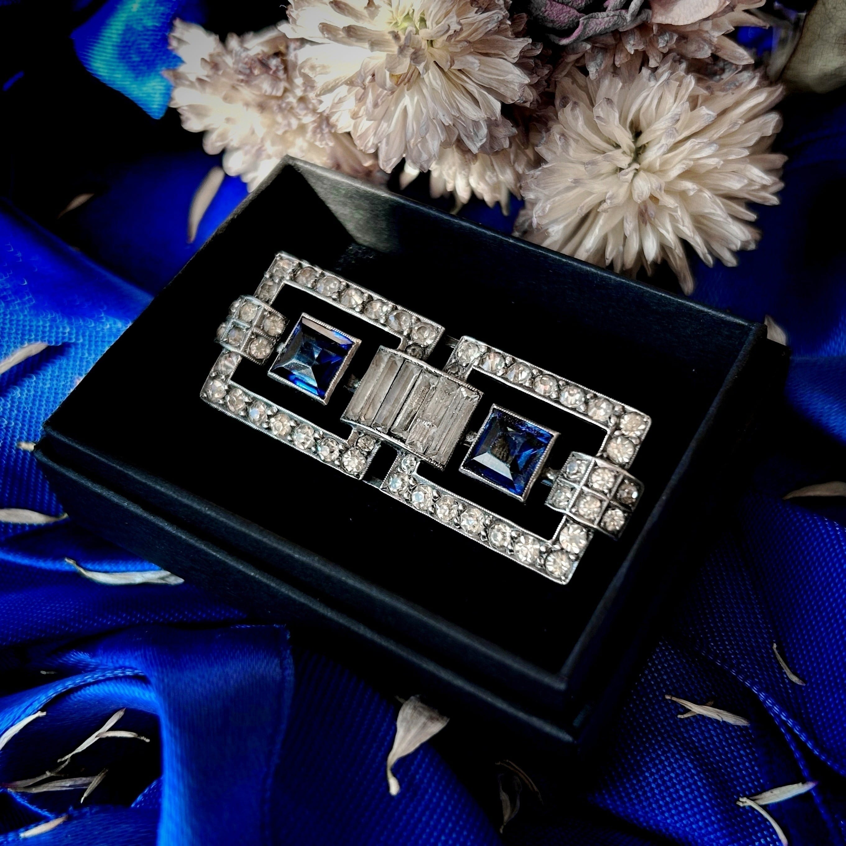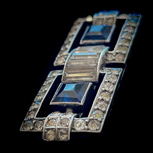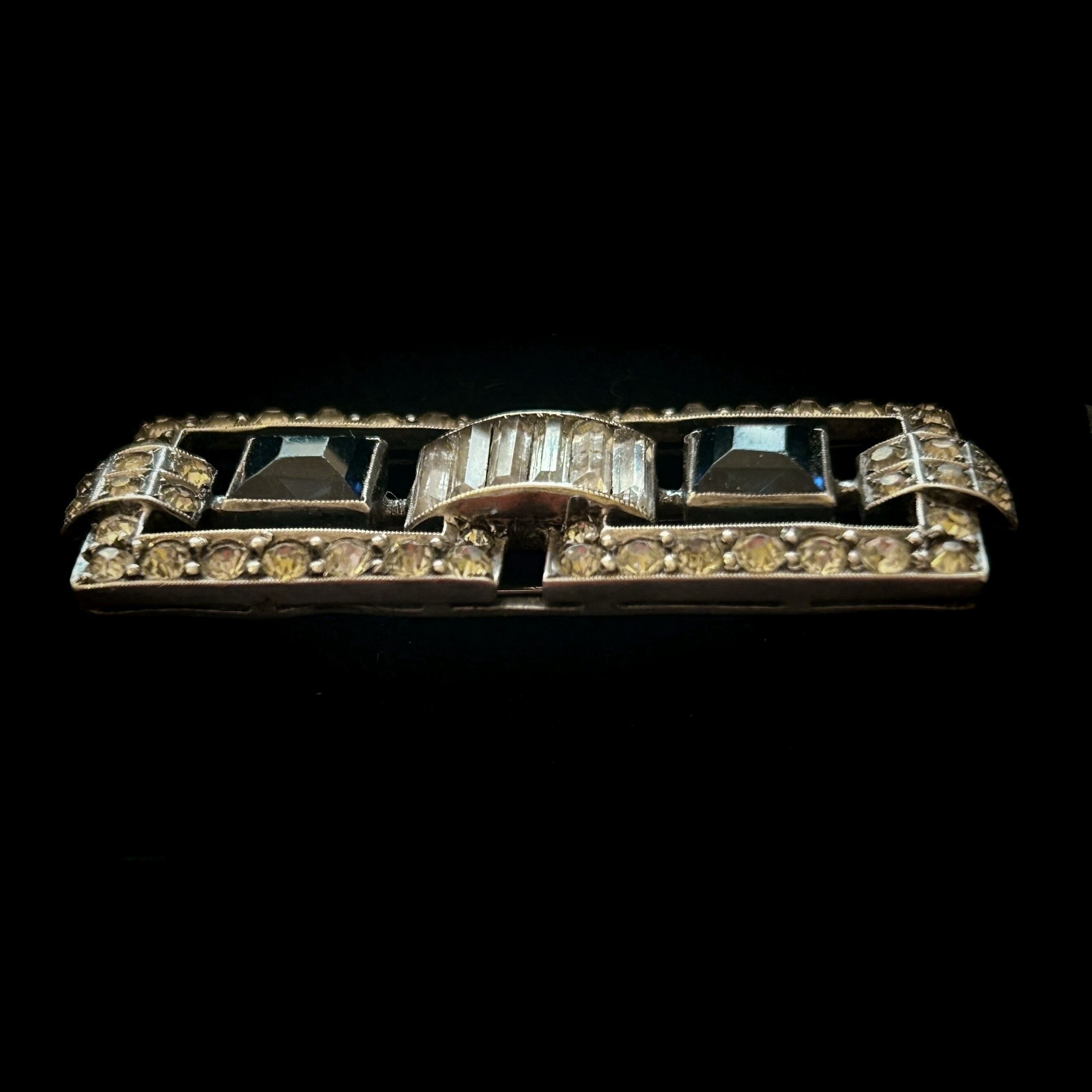 銀色の煌めきの中に澄んだ青を置いたブローチです。左右対称の幾何学的な直線と曲面を組み合わせたアール・デコのデザインは、今の目で見るとでシックでレトロモダンな印象を受けます。