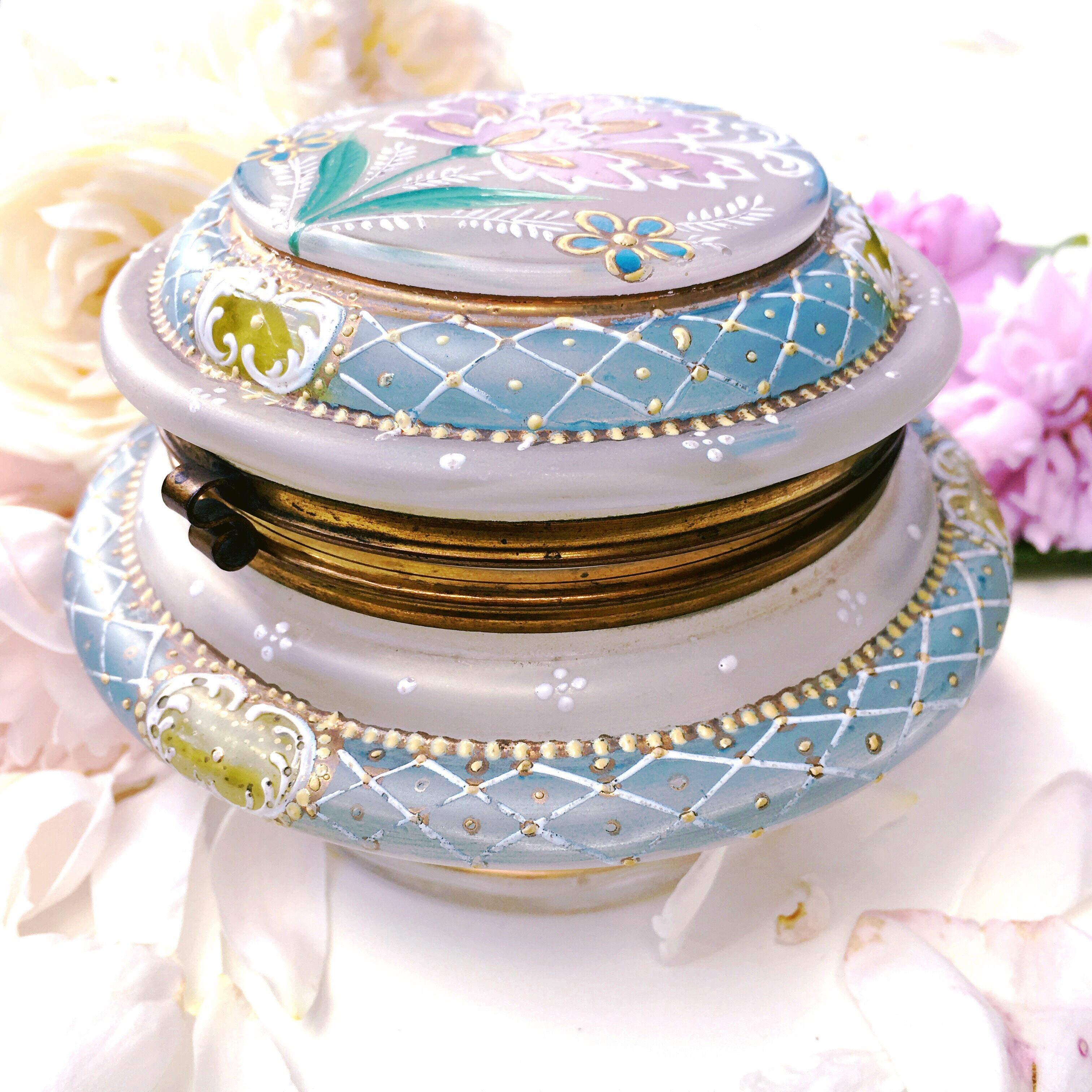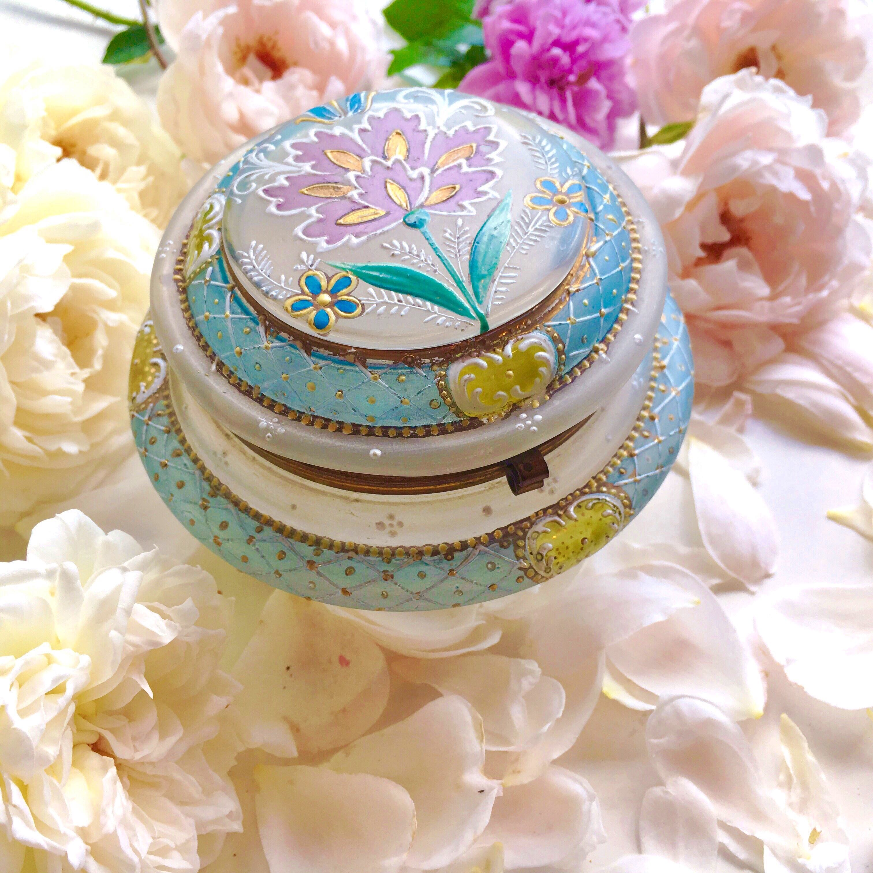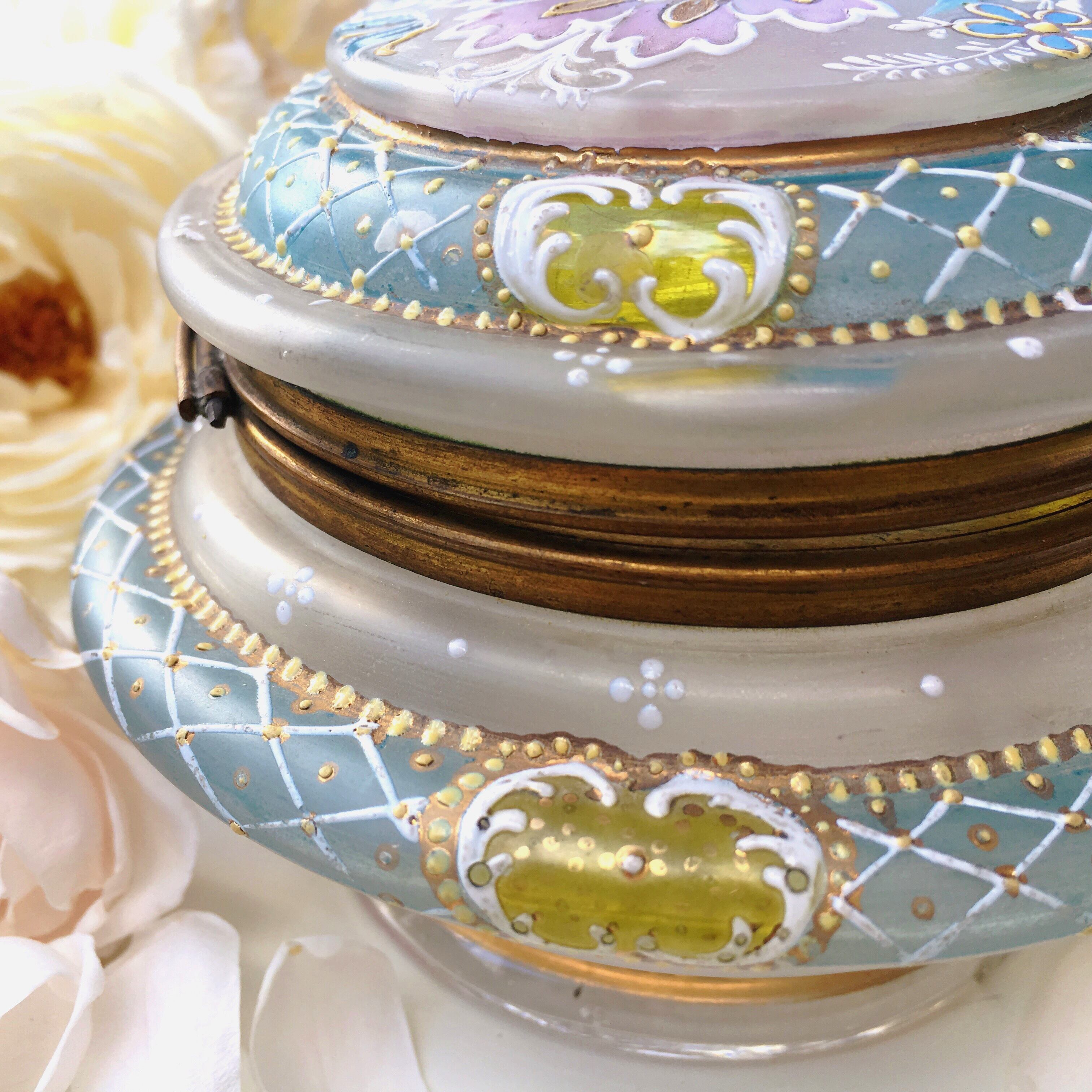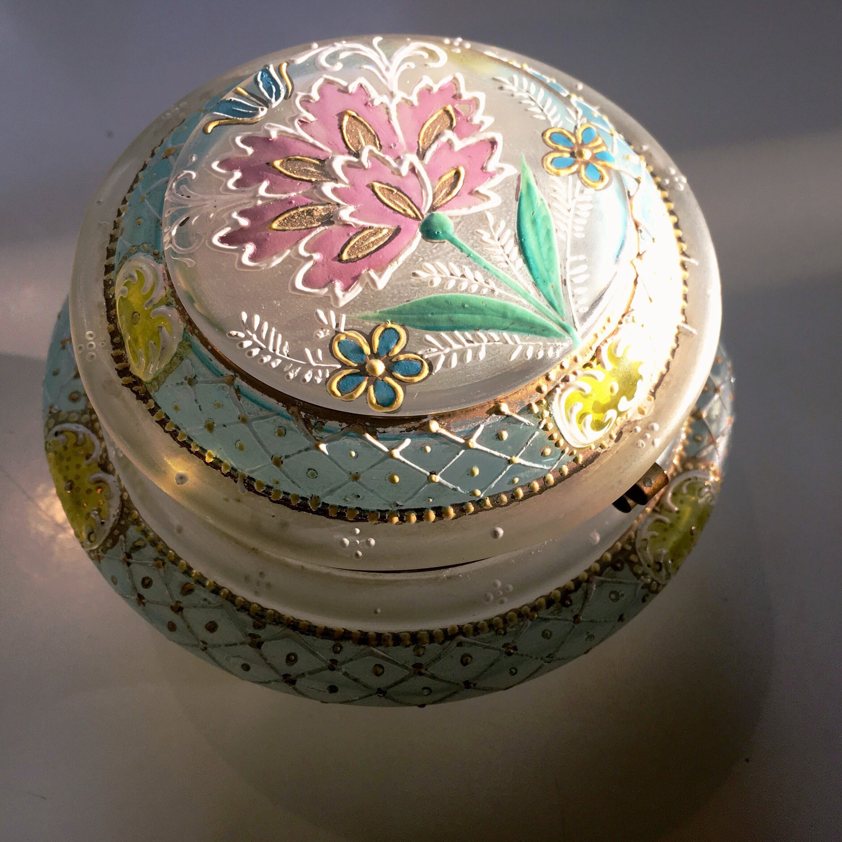 とびきりファンタスティックなキャンディポットです。柔らかく煙る半透明のフロストガラスに手描きのエナメルと金彩で瀟洒な紋様が描かれています。こんなに夢かわいいデザインが19世紀にもあったのですね。ファンシーですが安っぽさはなく、こんもり盛られたエナメルも実に豪奢な作りです。弊店ではこのようなガラスの容器をキャンディポットと呼んでいますが、化粧品や小物を入れるためにも使われたようです。