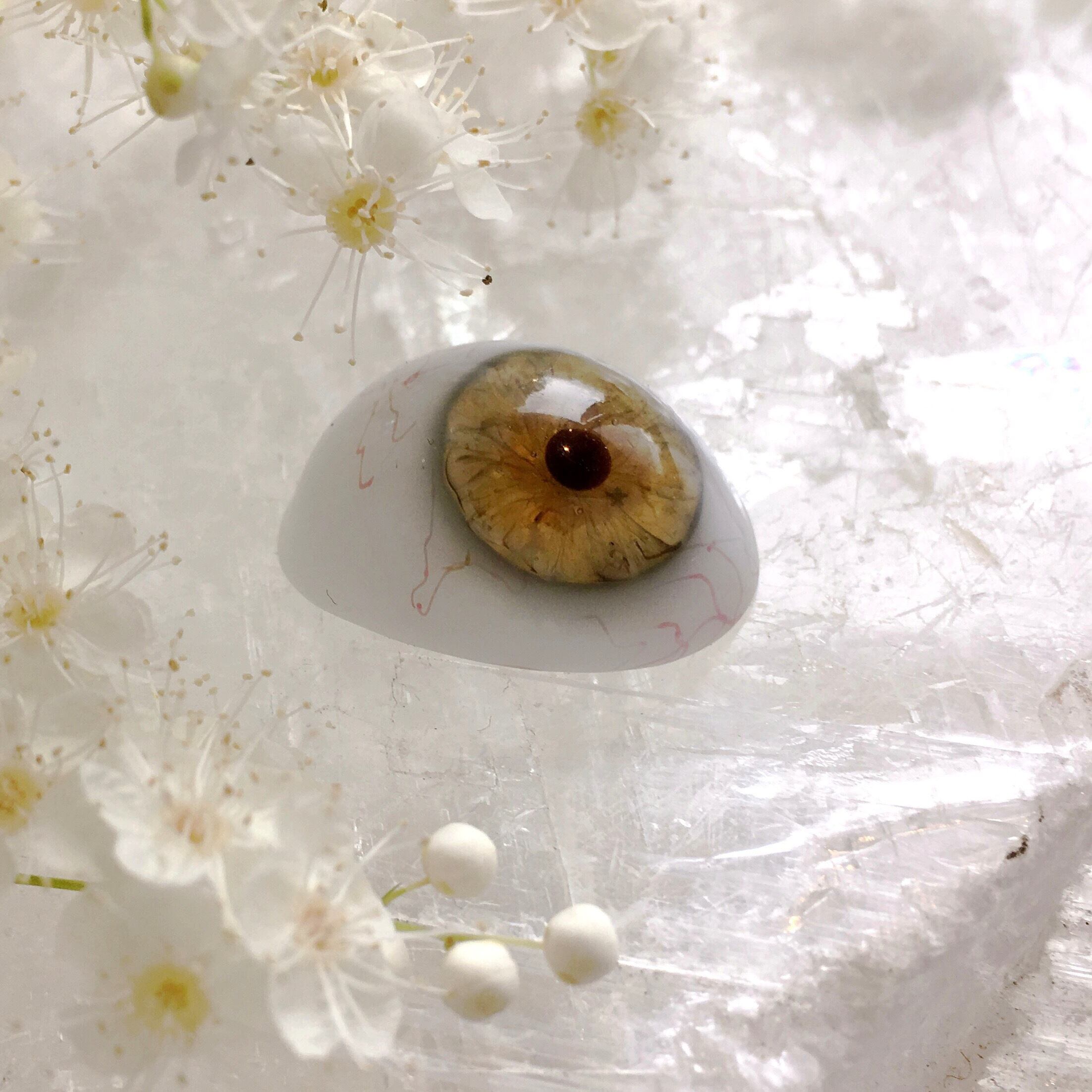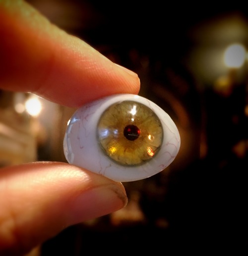 虹彩の縁が一筋のブルーグレー、そこから黒目まで靄のかかったようなセピア色、黒目は小さめでなんとも表現の難しい義眼です。こちらは裏のガラスがなく、中が中空になっていないシングル義眼なので、裏から光が入ります。そのため、置いた状態でも水を湛えたような質感がありますが、光にかざすとその光の加減で虹彩の表情、色味が様々に変化します。その変化は、裏側のある義眼にはない楽しみです。もうひとつ、黒目の脇に小さな黒い星形を見つけました。製作の過程でたまたま入ったのでしょうが、とても素晴らしい偶然です。