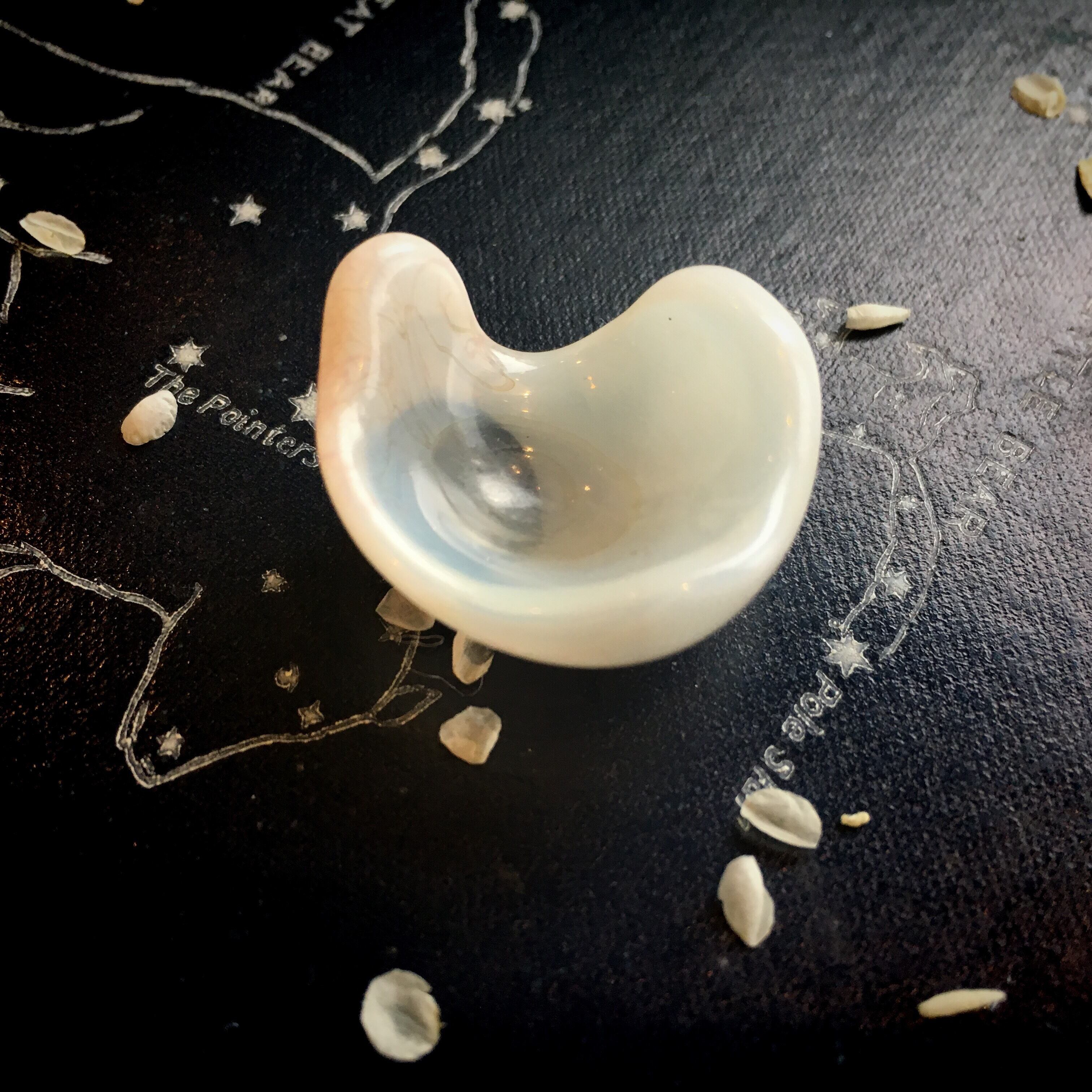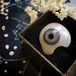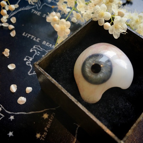 虹彩の縁は濃いブルーグレー、全体の印象は暮れ切った夜の始まりの空、しかし虹彩には白い線が花びらのように複雑にうねっています。ブルーというより青みがかった黒を思わせる義眼です。