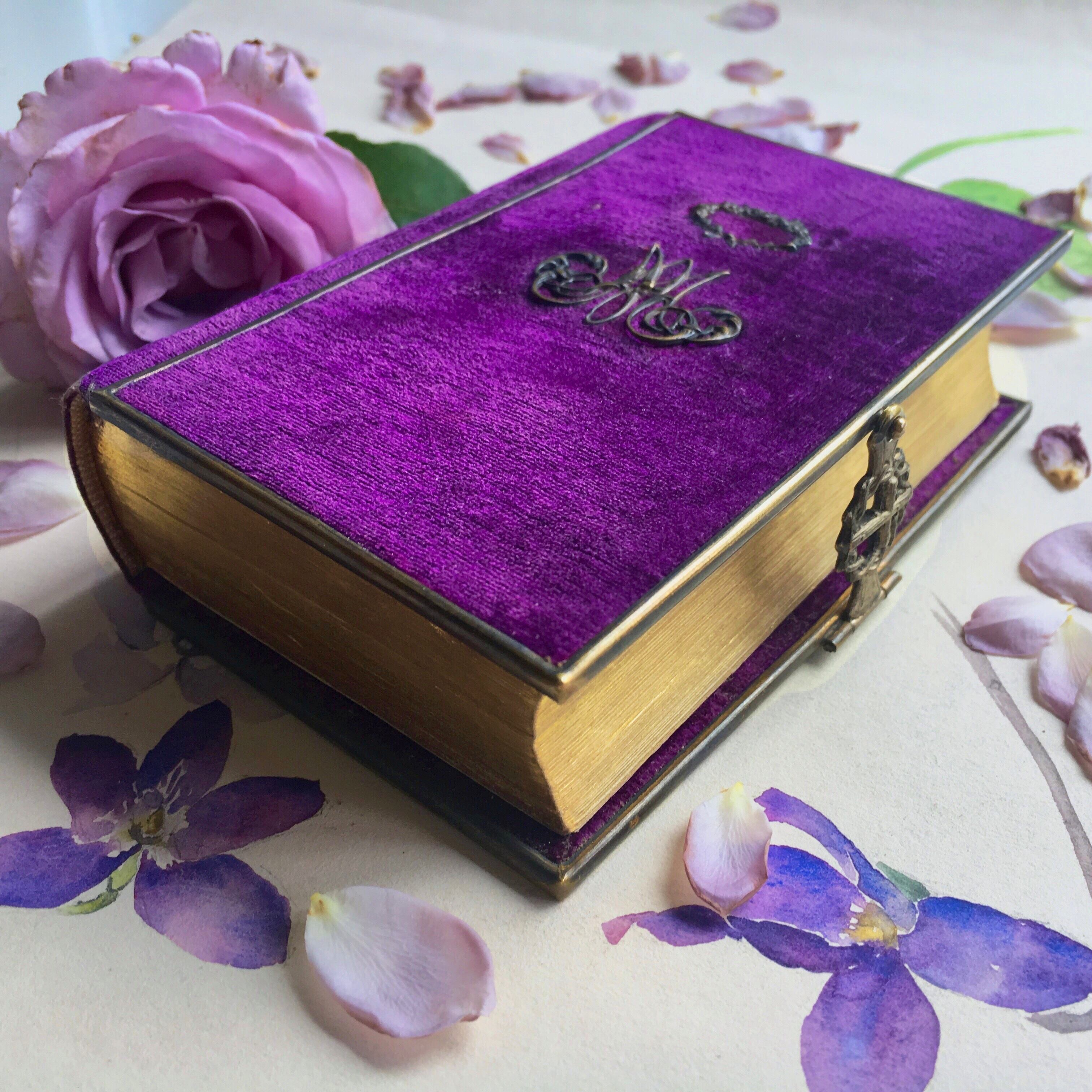 1849年、フランス、リモージュにてベルナール司教によって承認された、フランス語とラテン語の祈祷書です。実際に使われていた古いものですが、すみれ色のベルベットの擦れも時代の割には少なく、口金、表紙のモノグラムや背表紙のプレートなどもしっかりと残っており、小口の金や各ページ、図版もよい状態です。
