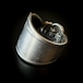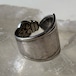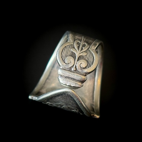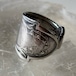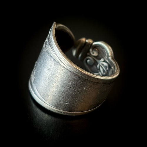 古いスプーンで作った指輪です。本物のスプーンの柄の部分をカットして丸めたものですので、裏側にも模様があるなどで元々はスプーンだったことがよくわかります。そのようなわけで、普通の指輪には見られない大胆なデザインが色々とお楽しみいただけます。