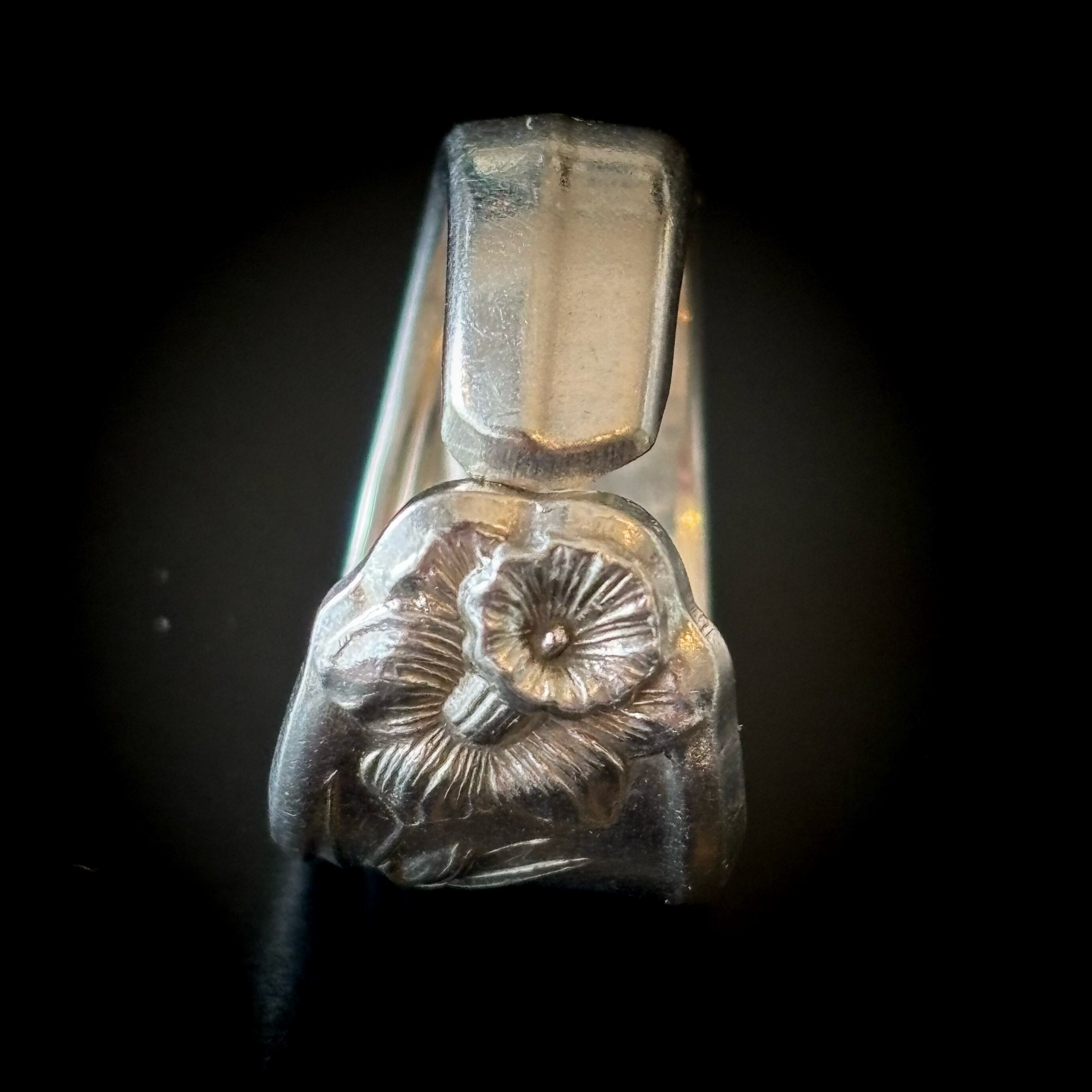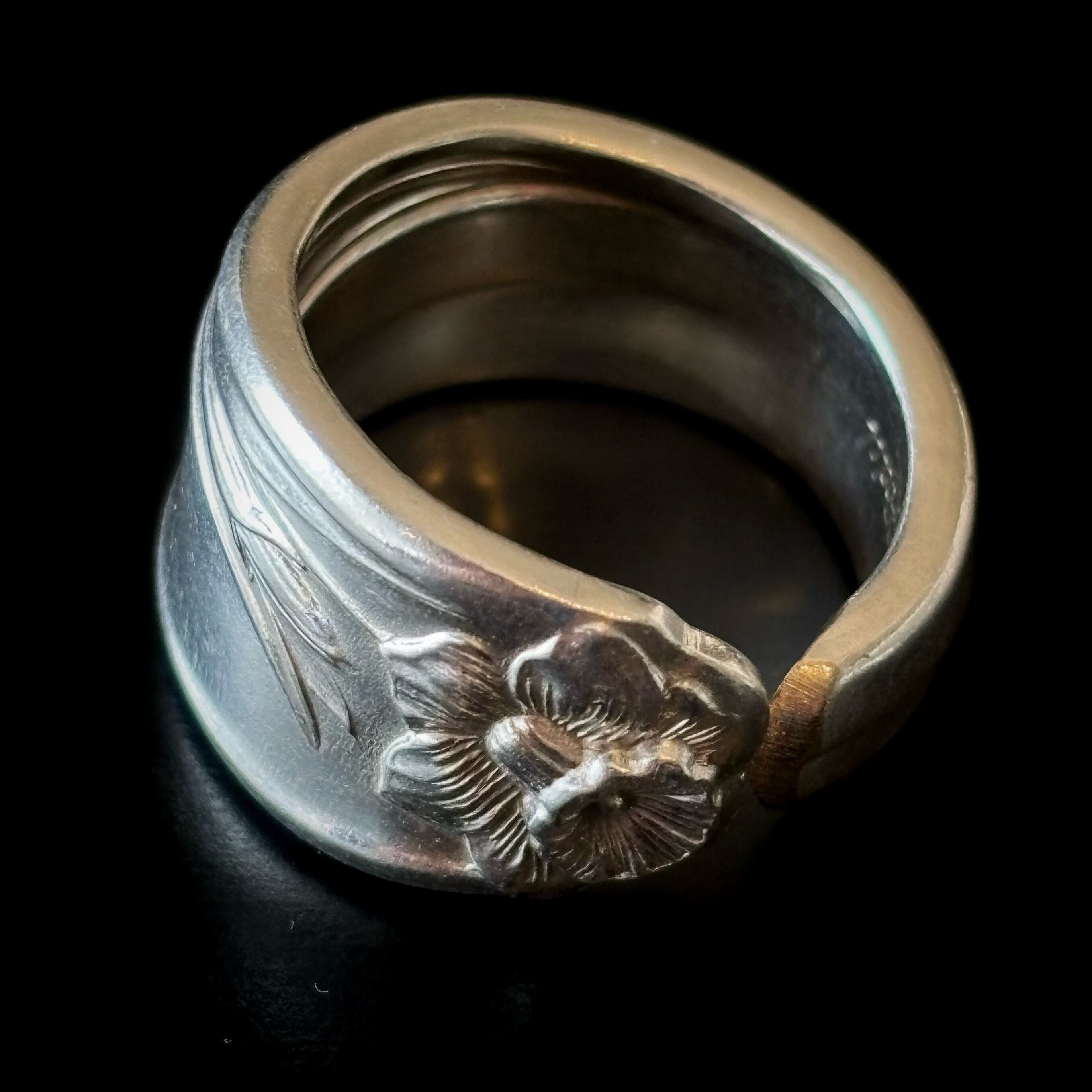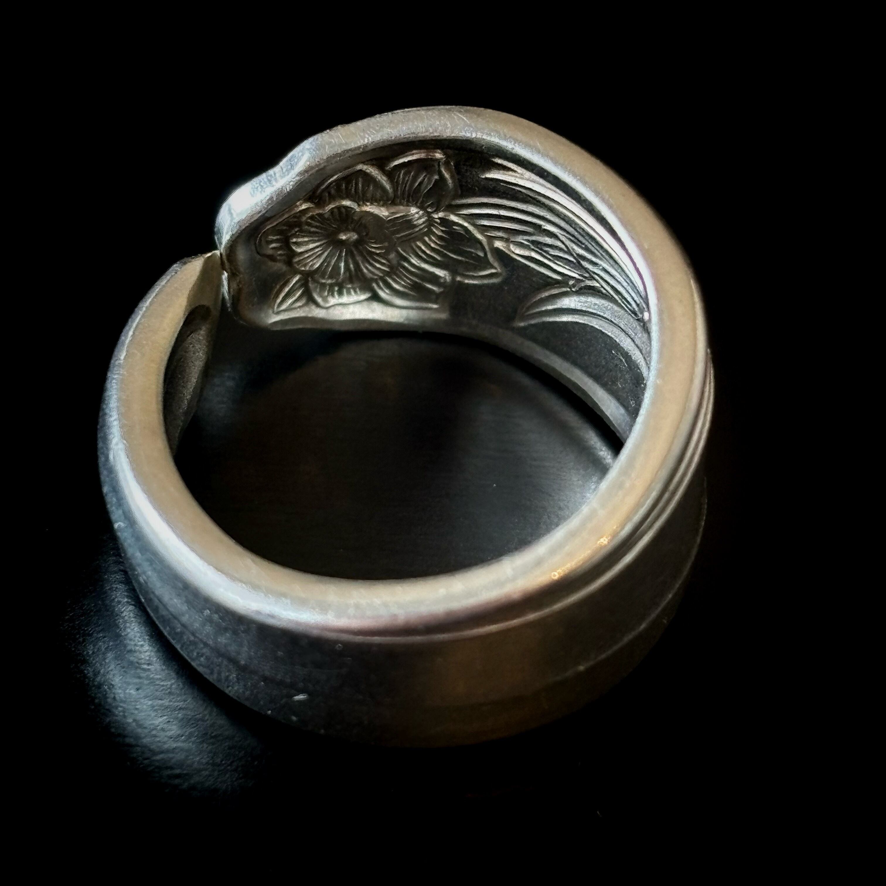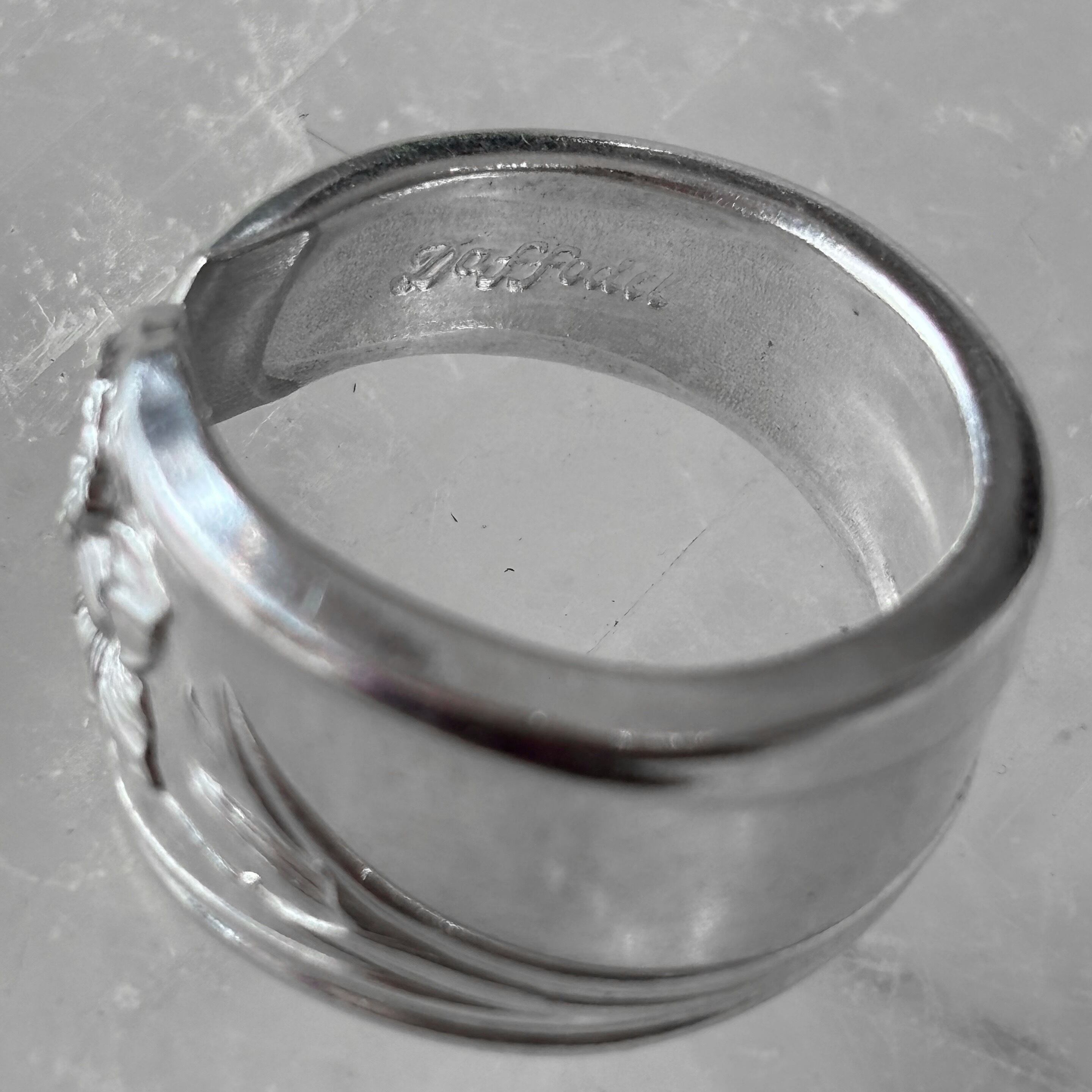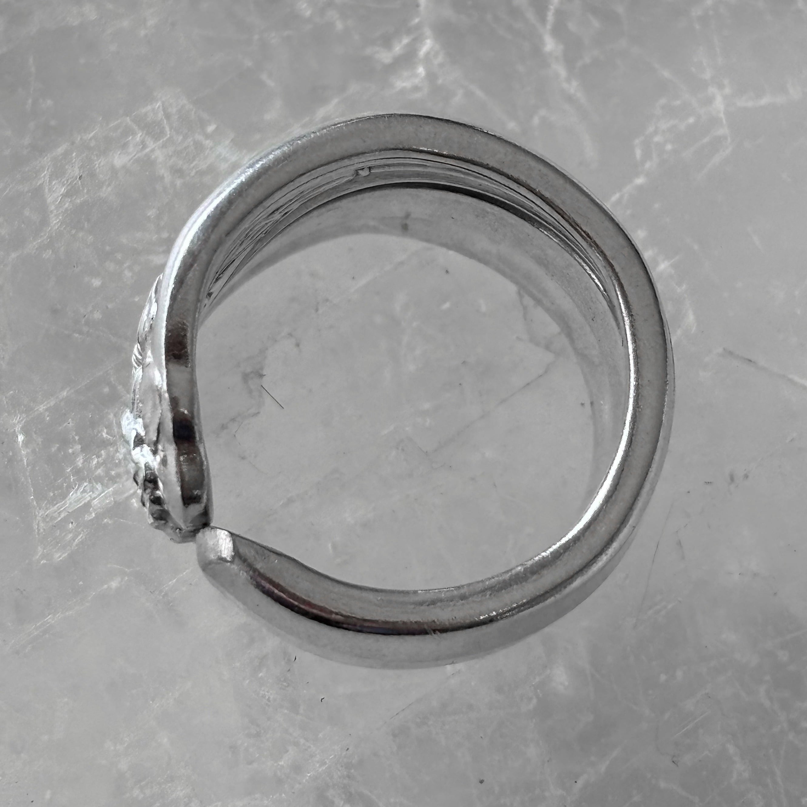 古いスプーンで作った指輪です。本物のスプーンの柄の部分をカットして丸めたものですので、裏側にも模様があるなどで元々はスプーンだったことがよくわかります。そのようなわけで、普通の指輪には見られない大胆なデザインが色々とお楽しみいただけます。